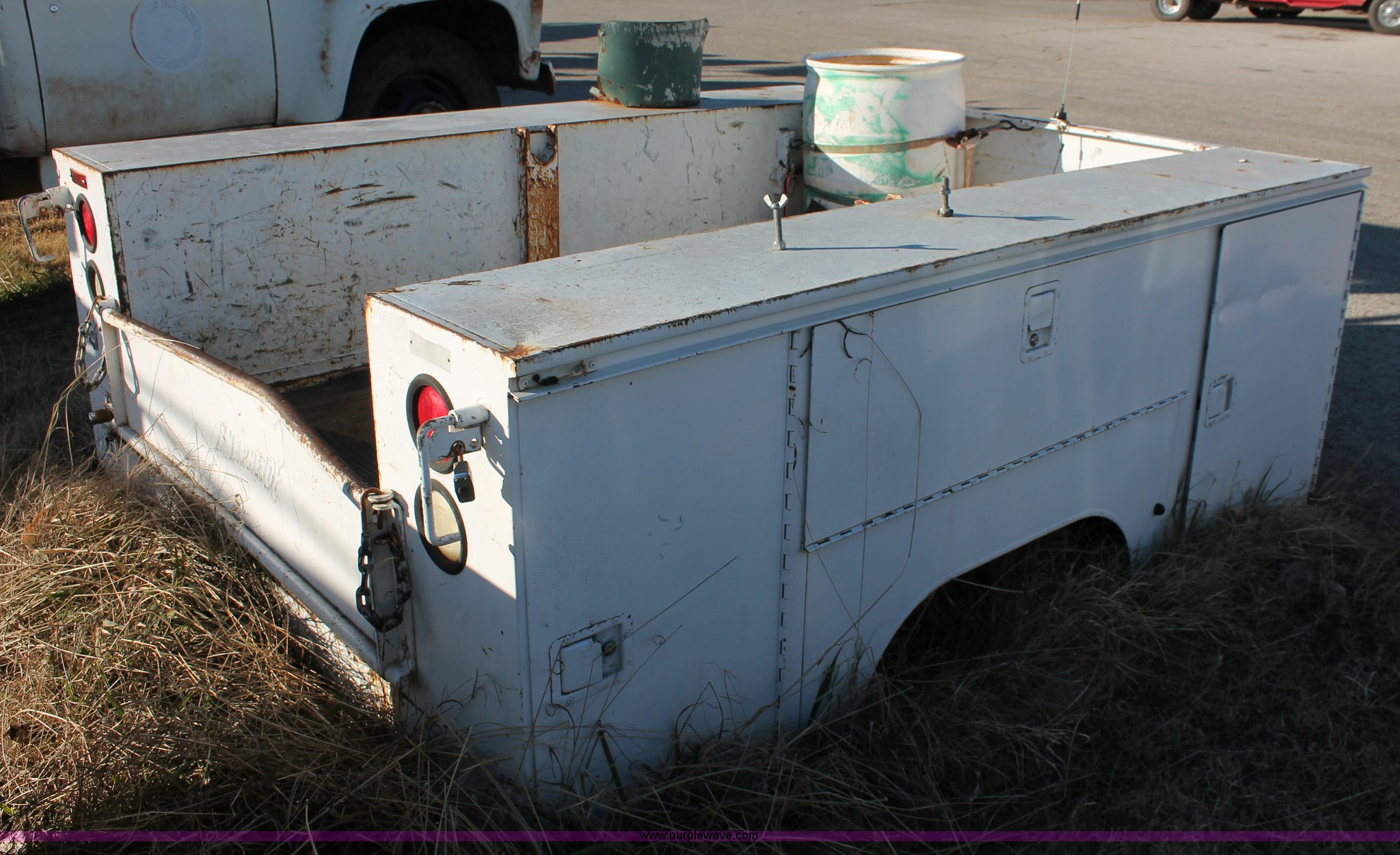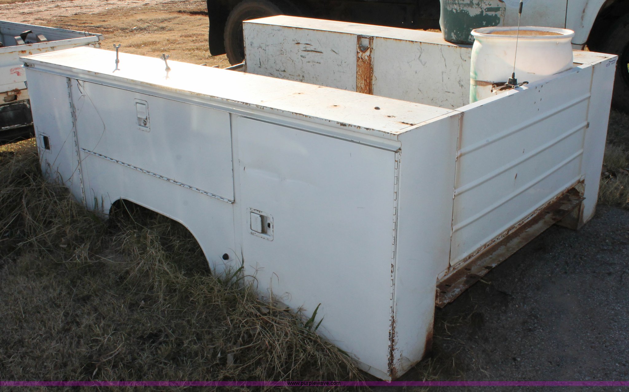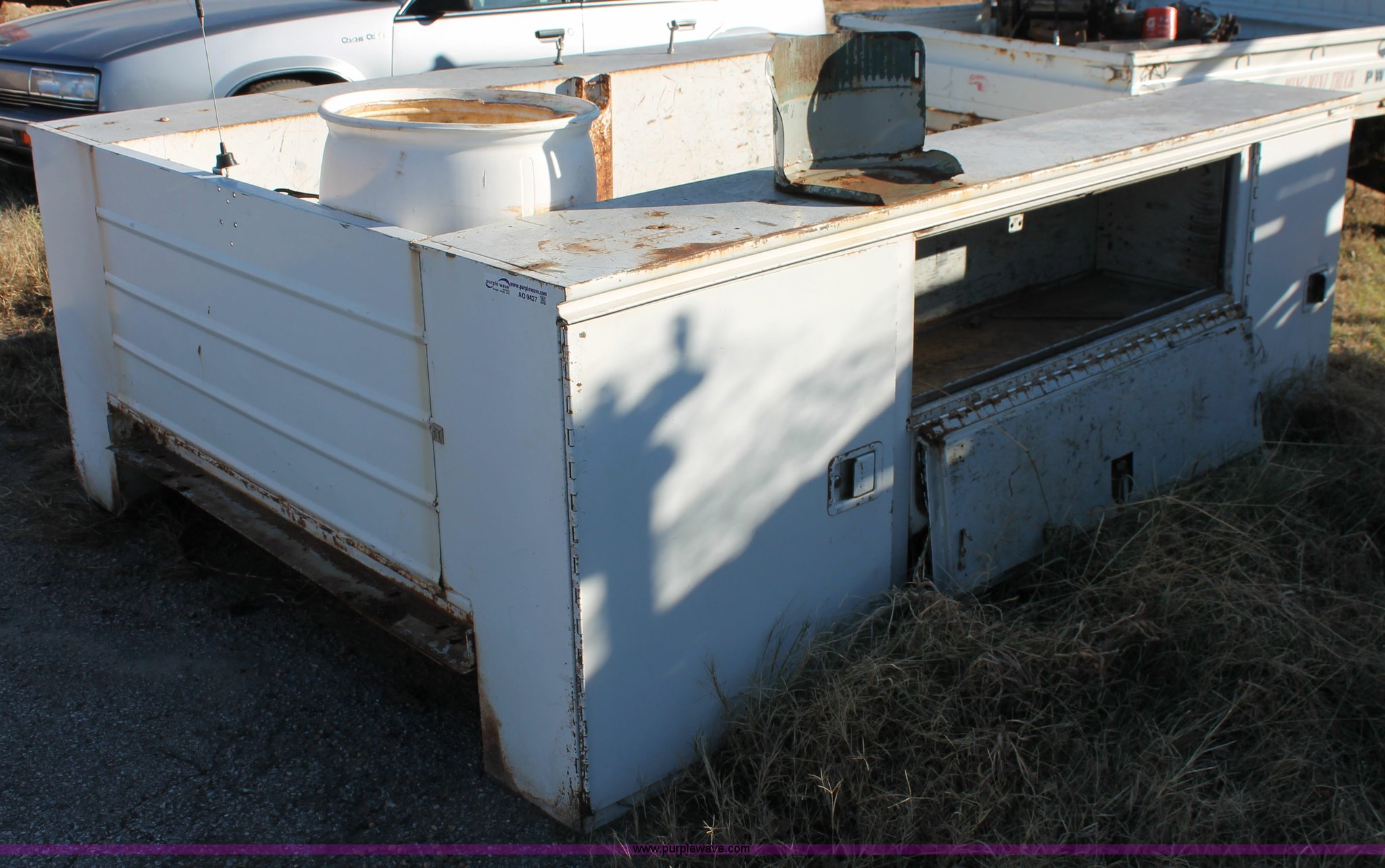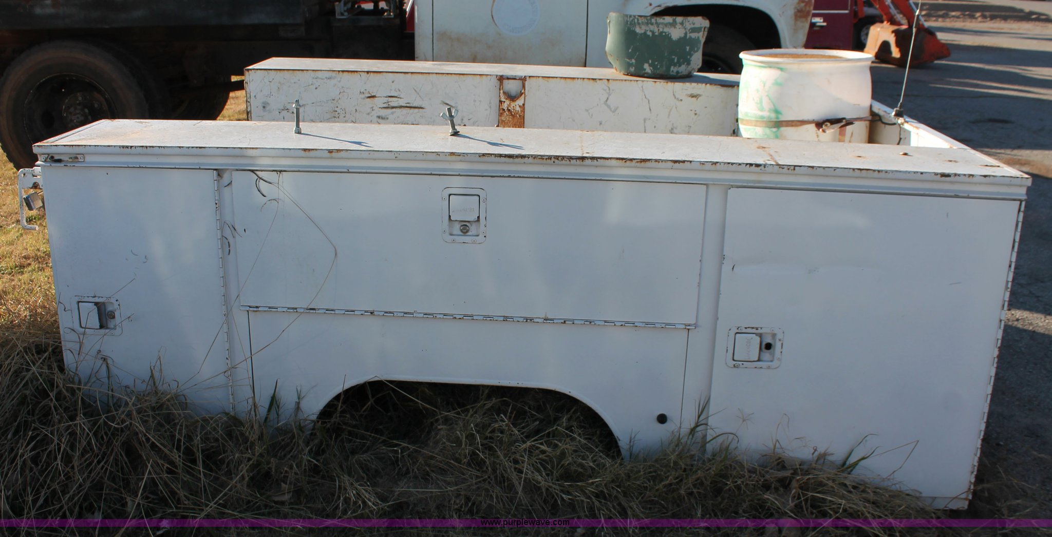 Purple Wave is selling a used Truck Part and Attach. in Oklahoma. This item is a Knapheide utility bed with the following: 8'L x 80"W overall, 56"W frame, (6) storage compartments