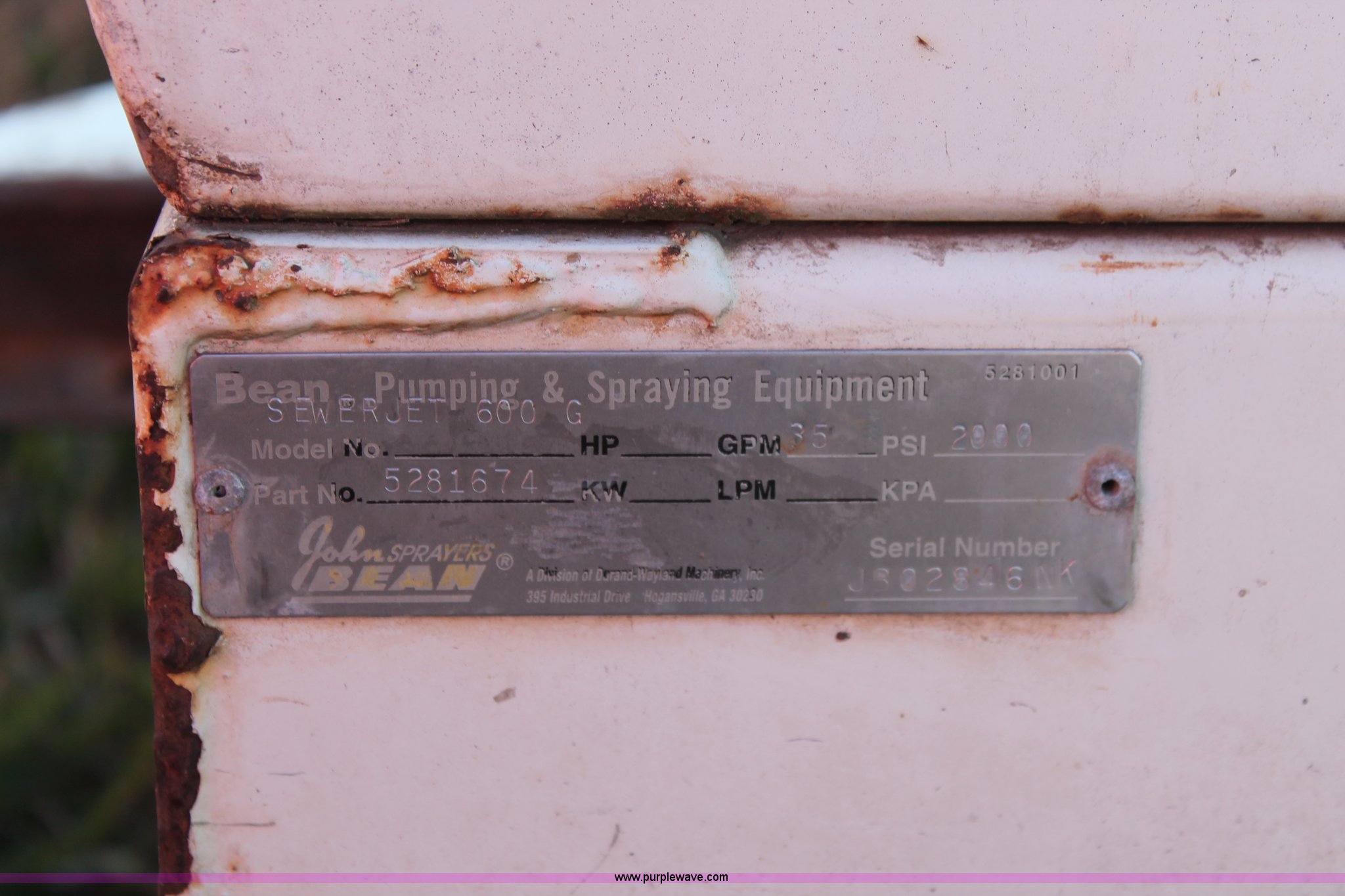 Purple Wave is selling a used Tools in Oklahoma. This item is a John Bean SewerJet 600 sewer jetter with the following: Continent T127 four cylinder gas engine, 12'L x 5'W, 500 gallon poly tank, Hose and reel nozzle assembly, 2" inlet plumbing, 35 gpm, 2,000 psi, Operational when recently removed from service, Serial JB02846NK