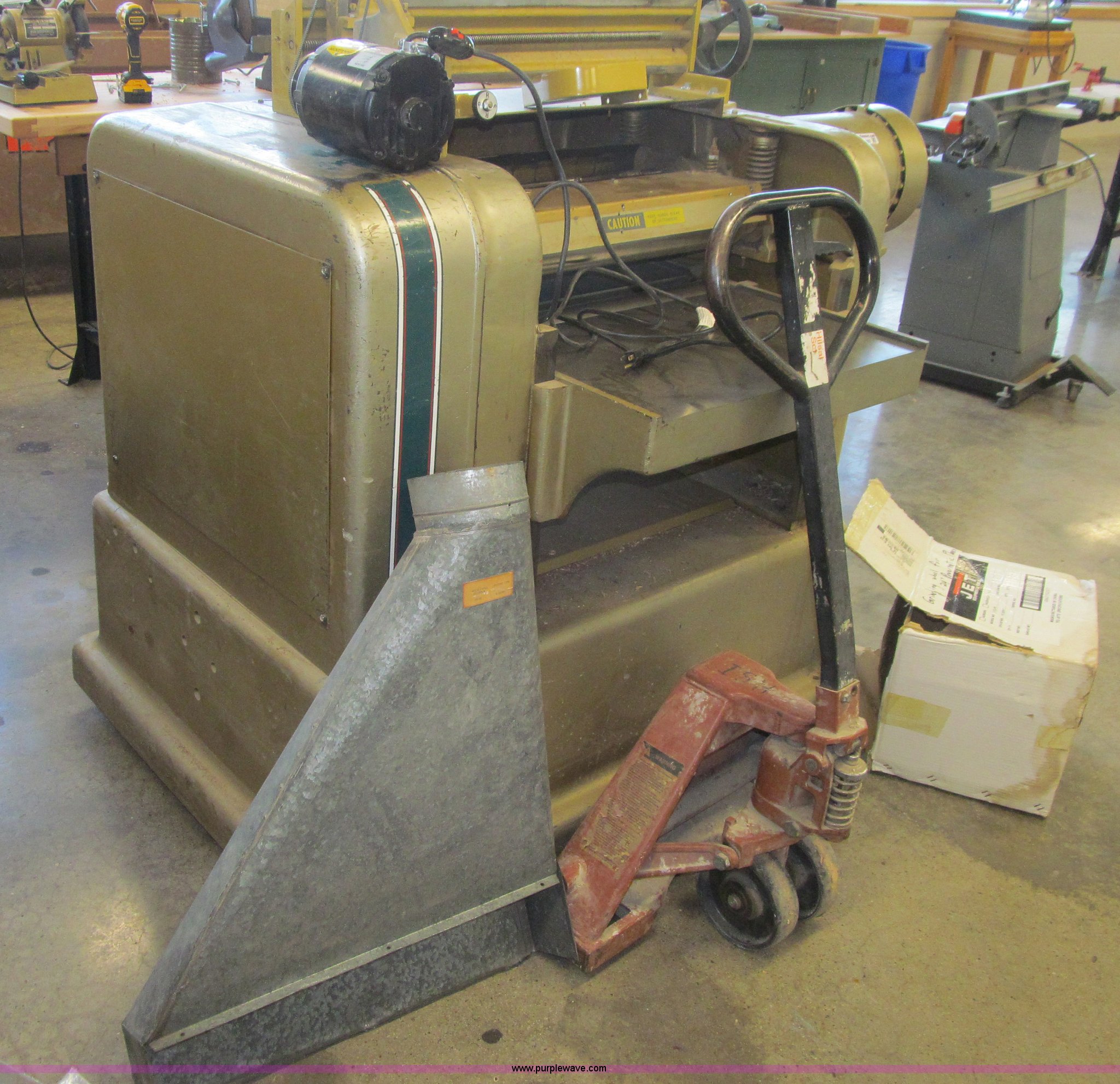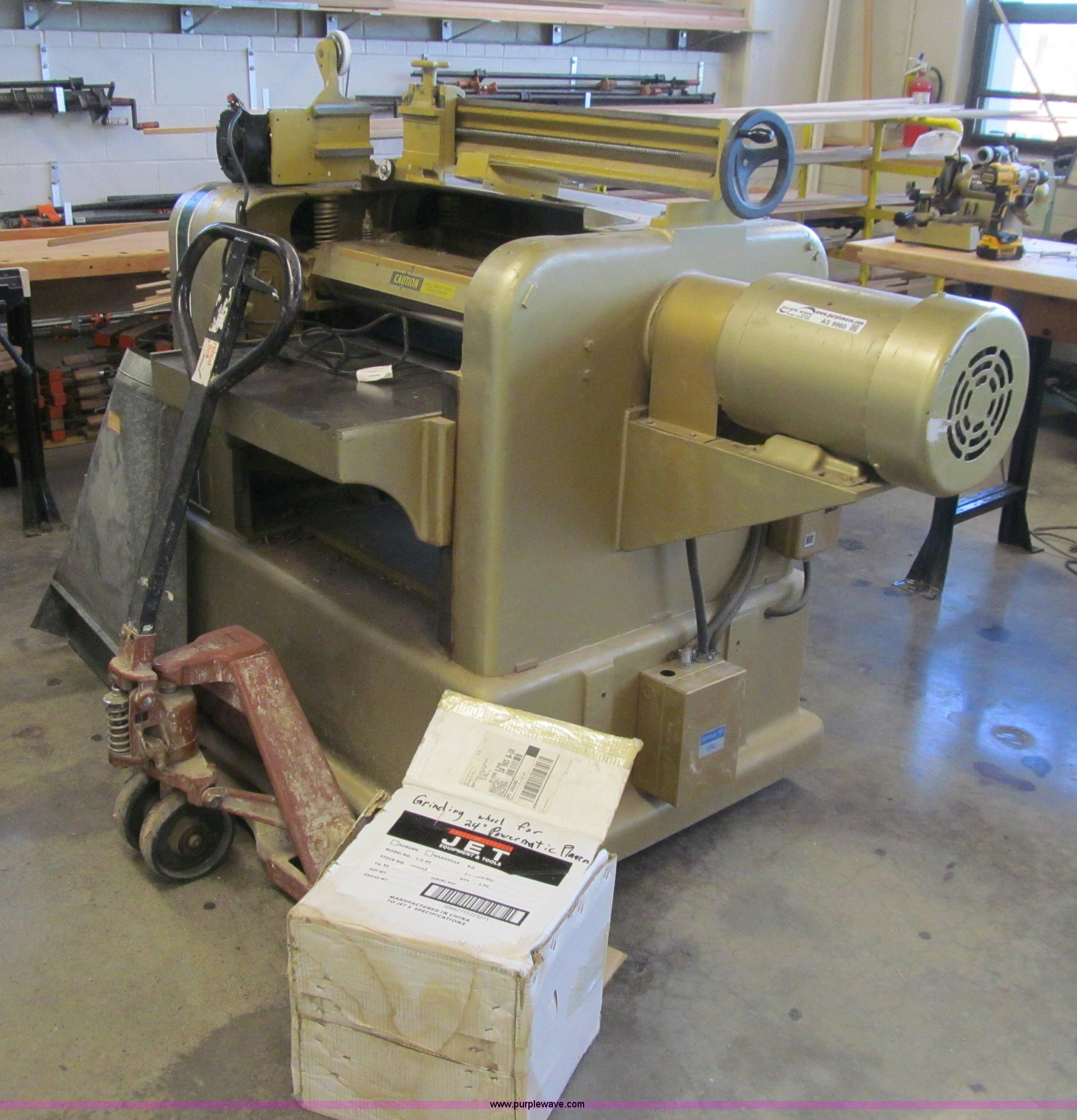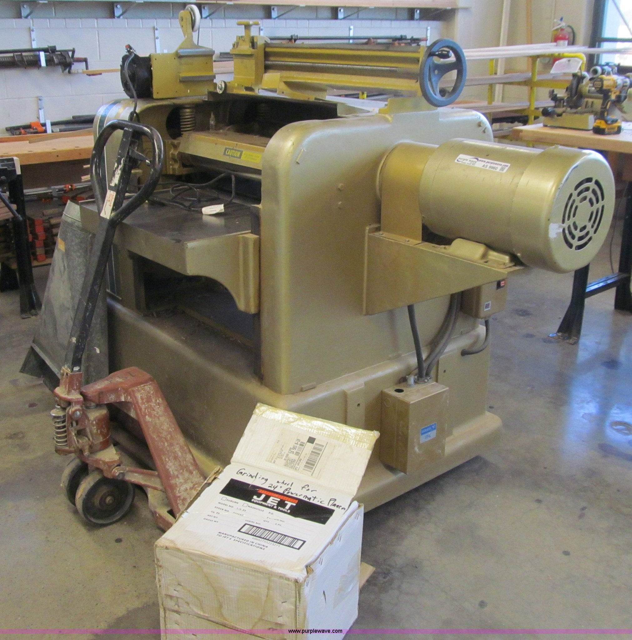 Powermatic 225 planer. Three phase, 10 HP, 208/400V, 24" thickness, Segmented head High speed steel knives, Dust collector, Grinder head, Pallet jack not included, Serial 8124057. Des Moines Public Schools. 1800 Grand Avenue. Desmoines, IA 50309