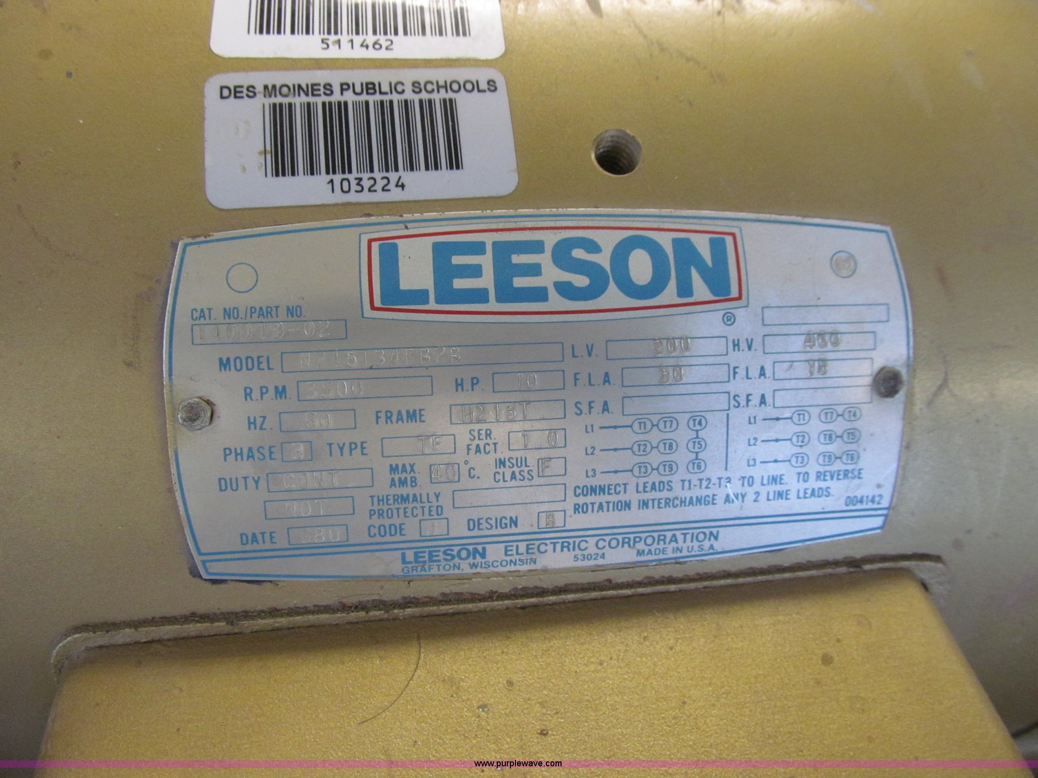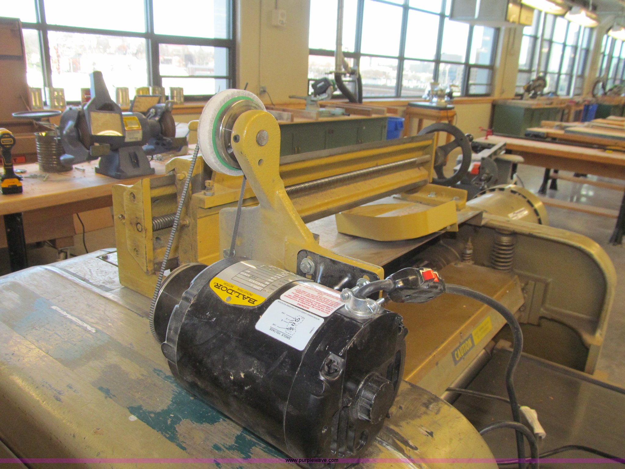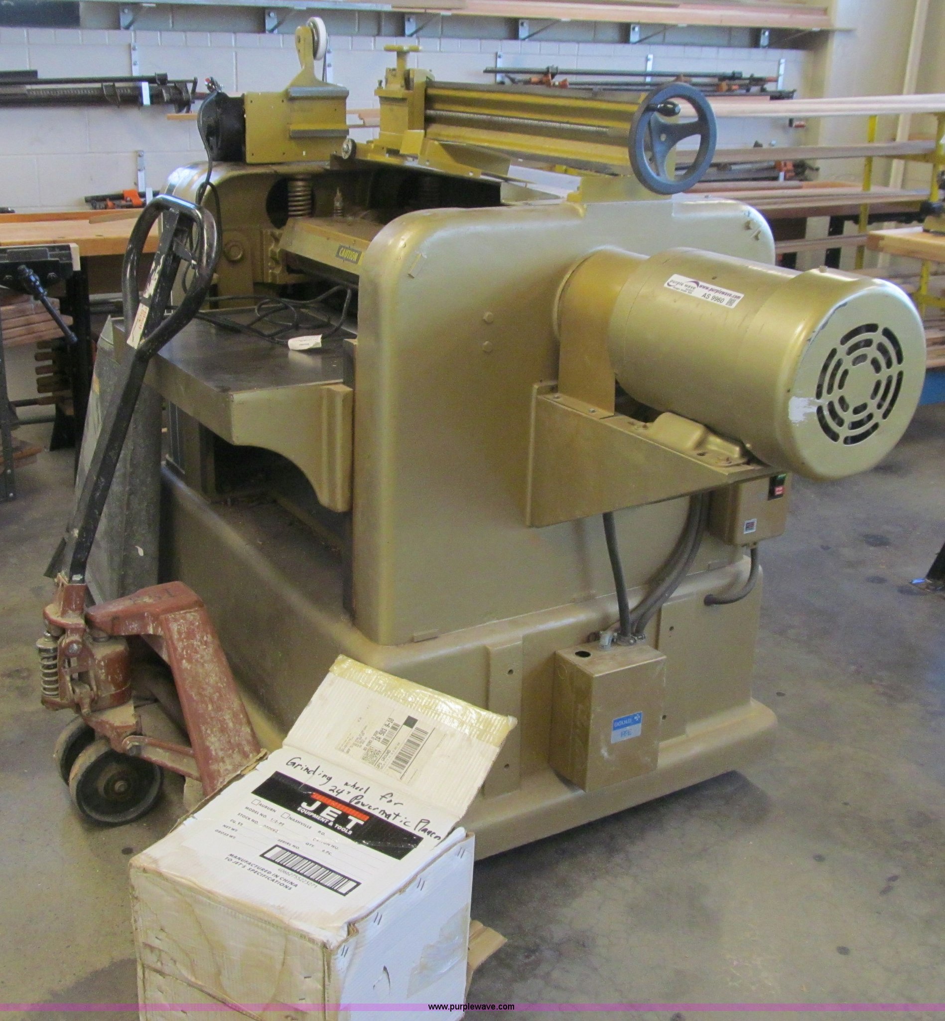Powermatic 225 planer. Three phase, 10 HP, 208/400V, 24" thickness, Segmented head High speed steel knives, Dust collector, Grinder head, Pallet jack not included, Serial 8124057. Des Moines Public Schools. 1800 Grand Avenue. Desmoines, IA 50309