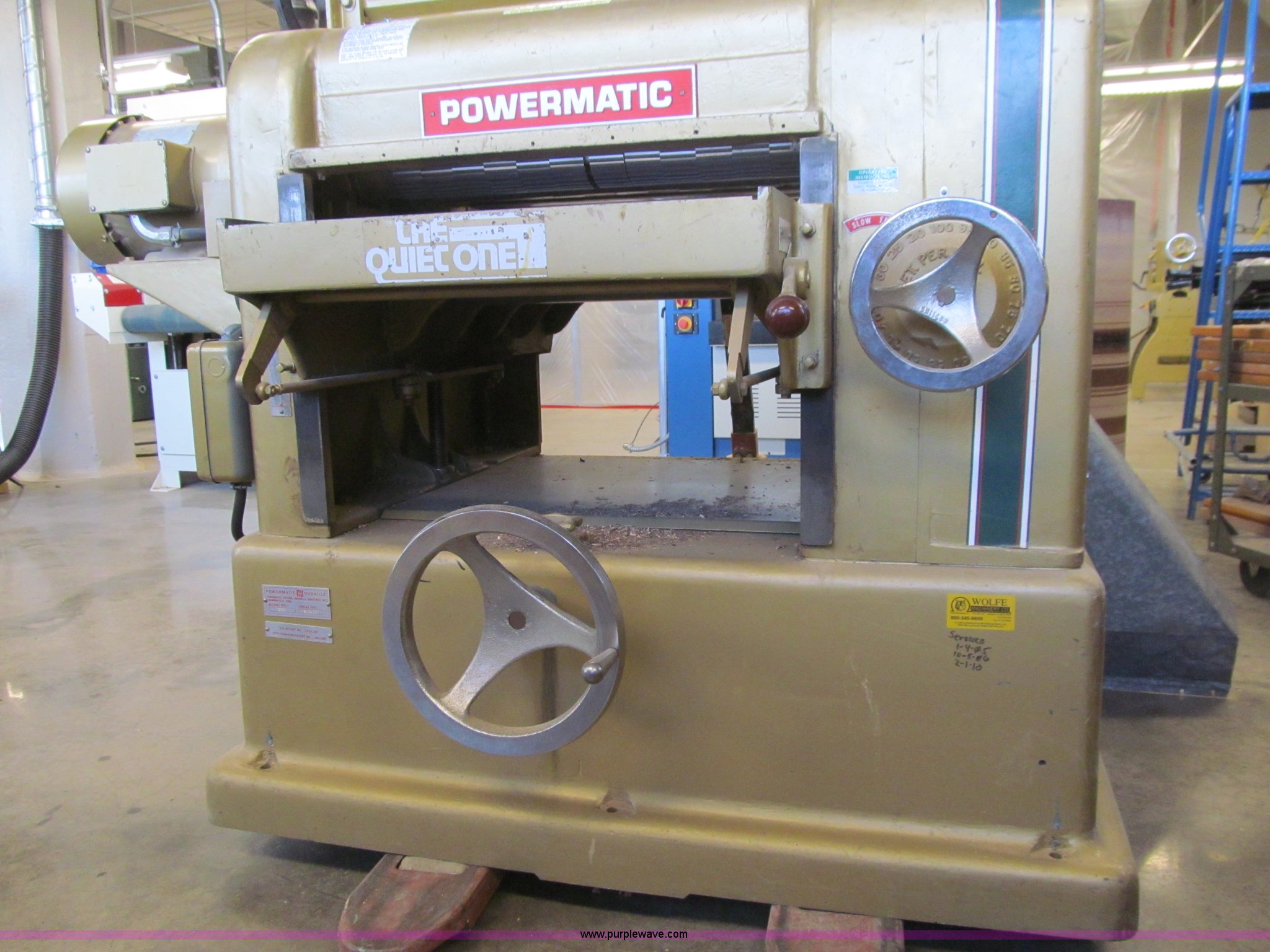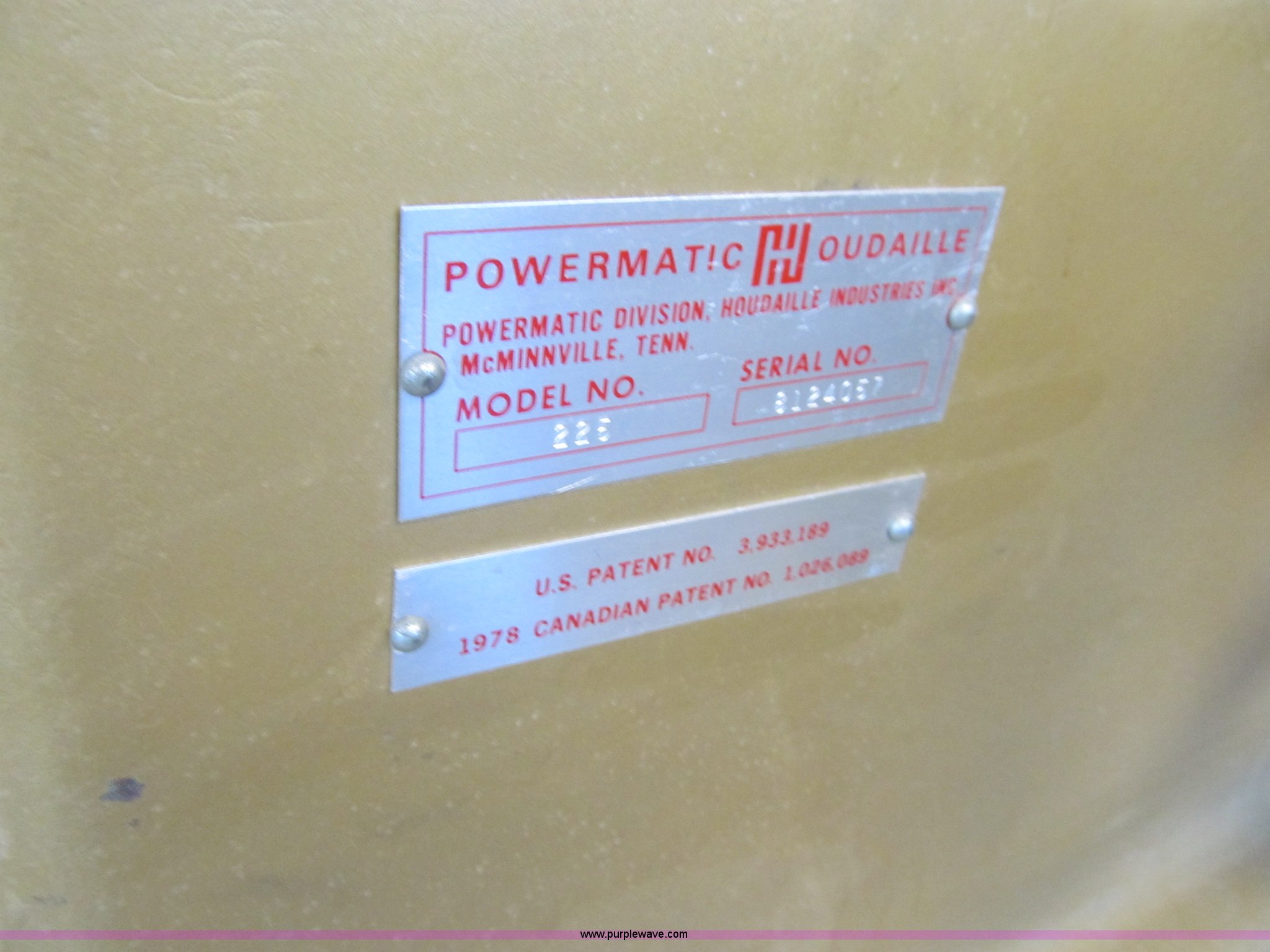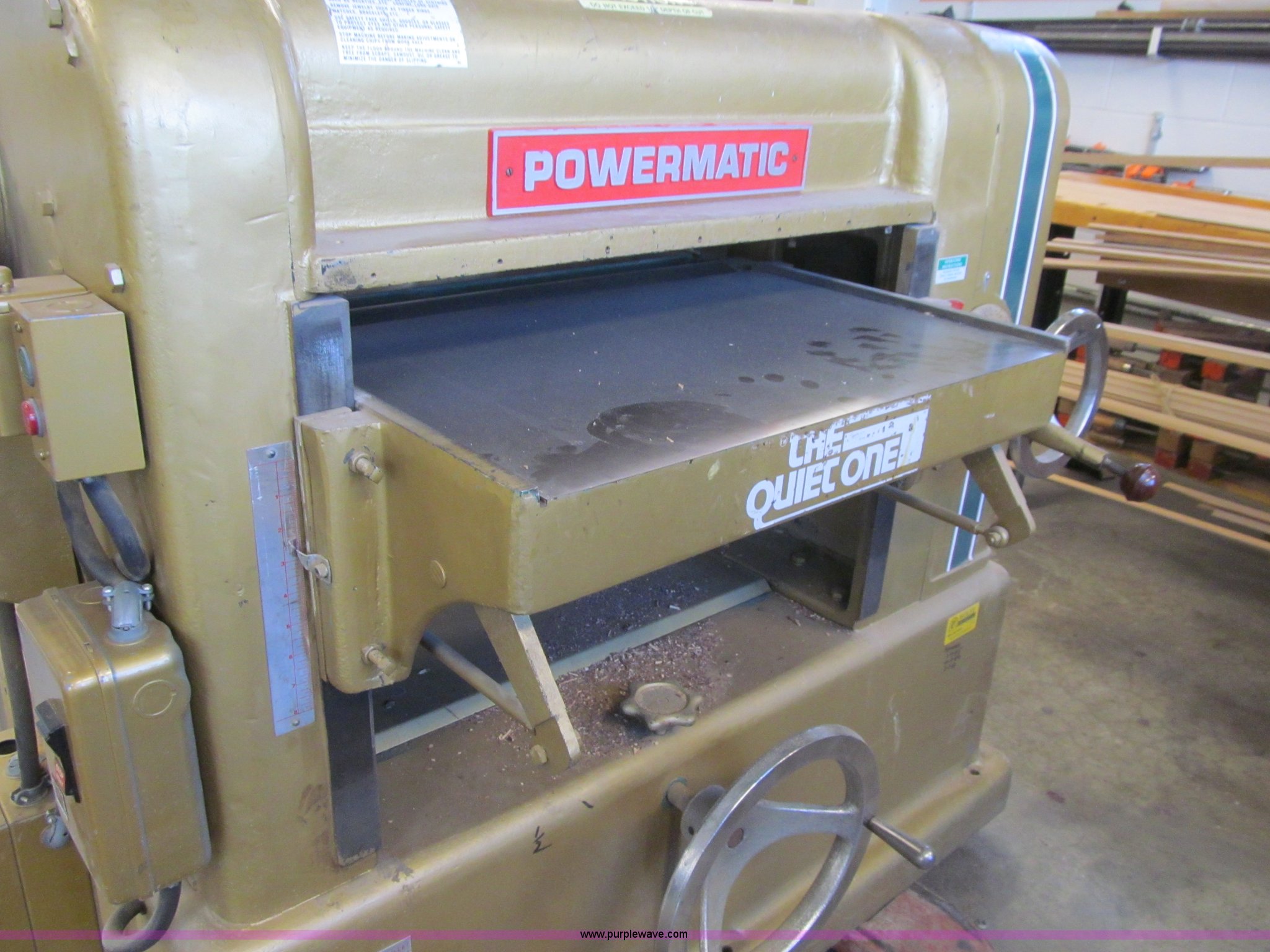 Purple Wave is selling a used Tools in Iowa. This item is a Powermatic 225 planer with the following: Three phase, 10 HP, 208/400V, 24" thickness, Segmented head, High speed steel knives, Dust collector, Grinder head, Pallet jack not included, Serial 8124057