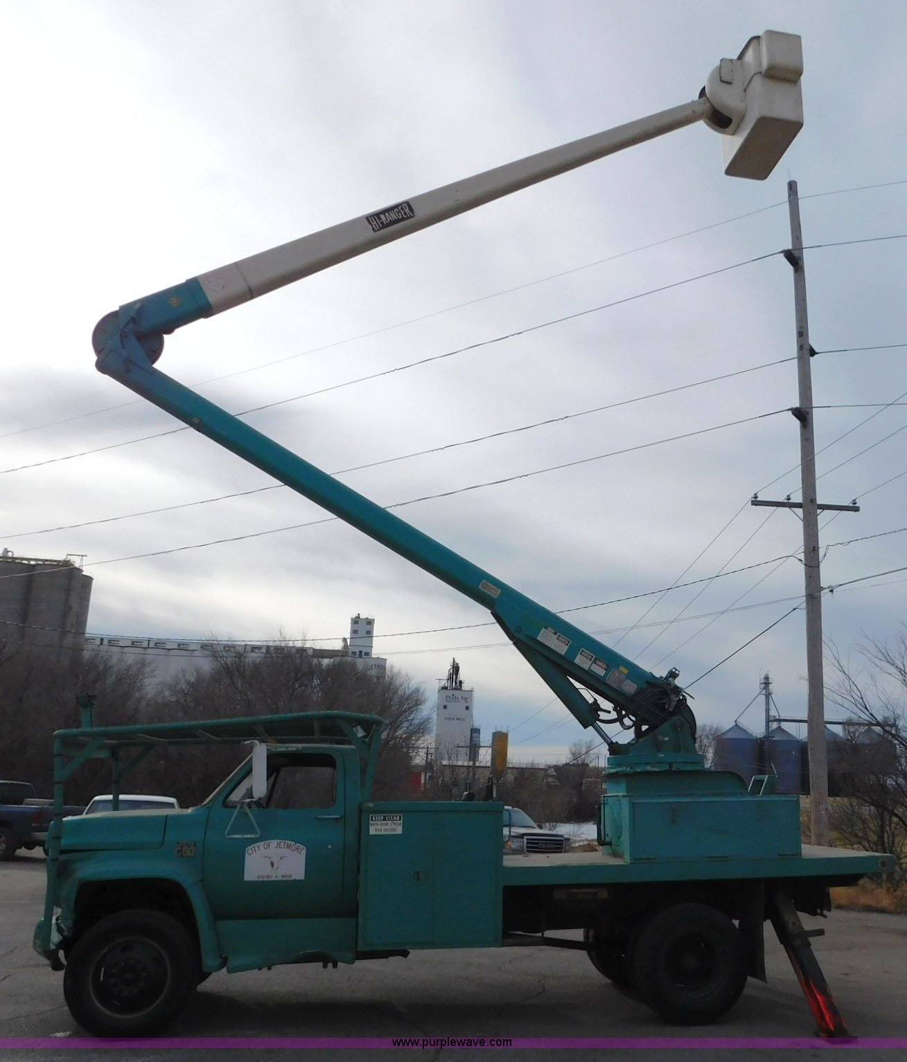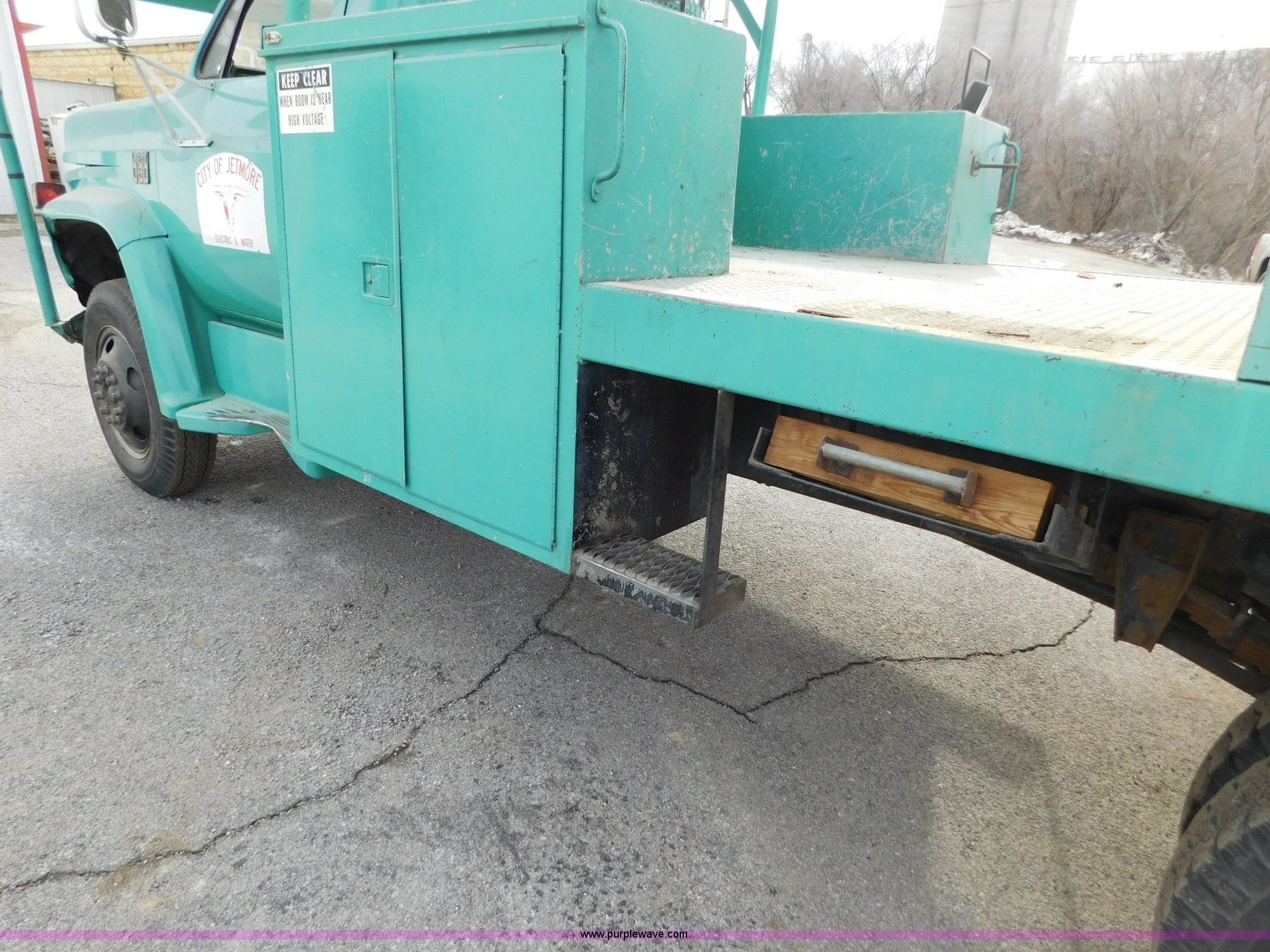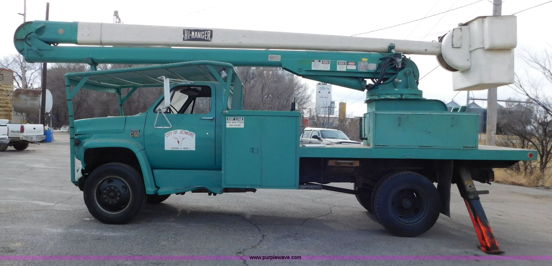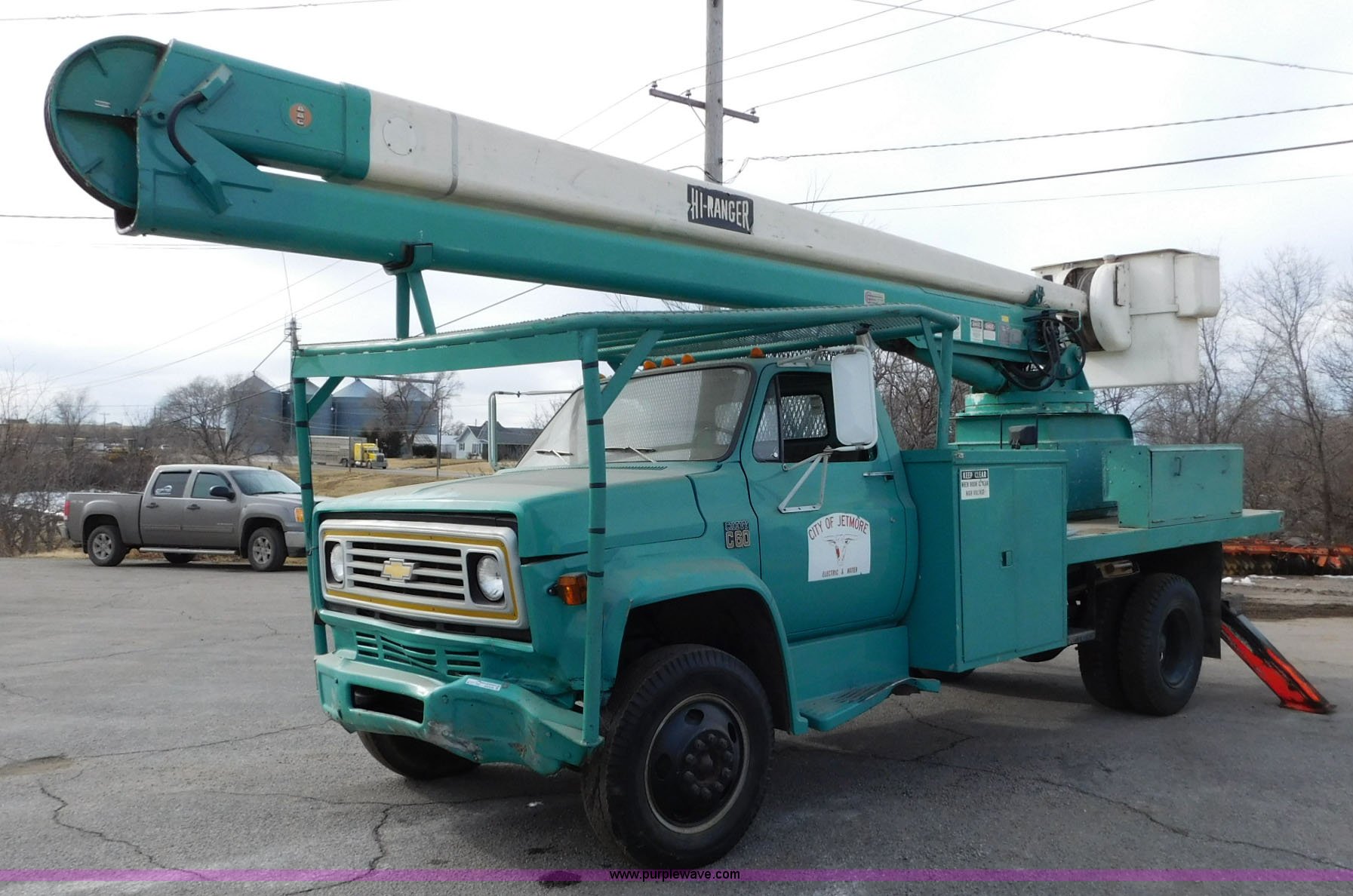 1976 Chevrolet C60 bucket truck. 10,045 miles on odometer, 3,290 hours on meter, Eight cylinder gas engine, Four speed manual transmission with hi/low, Heat, Suspension seat, Front tow hooks, PTO, 15'L service bed Shelving, Work lights, Hi-Ranger 5F-48PBI boom 500 lbs max lift capacity, Man basket, 53' max lift height, Ground boom controls, Boom rotation, (2) outriggers, Manual, Serial 10747244, Spring suspension, Hydraulic brakes, 174" wheelbase, Uniroyal 8.25-20 tires, GVWR 21,200 lbs, Hydraulic and air lines have been replaced on boom, Lift cable on boom needs replaced, Front end damage, Engine oil leak, Broken front glass, Unit will need to pass inspection prior to being put into service. CCE616V128266. City of Jetmore. 109 E Bramley. Jetmore, KS 67854