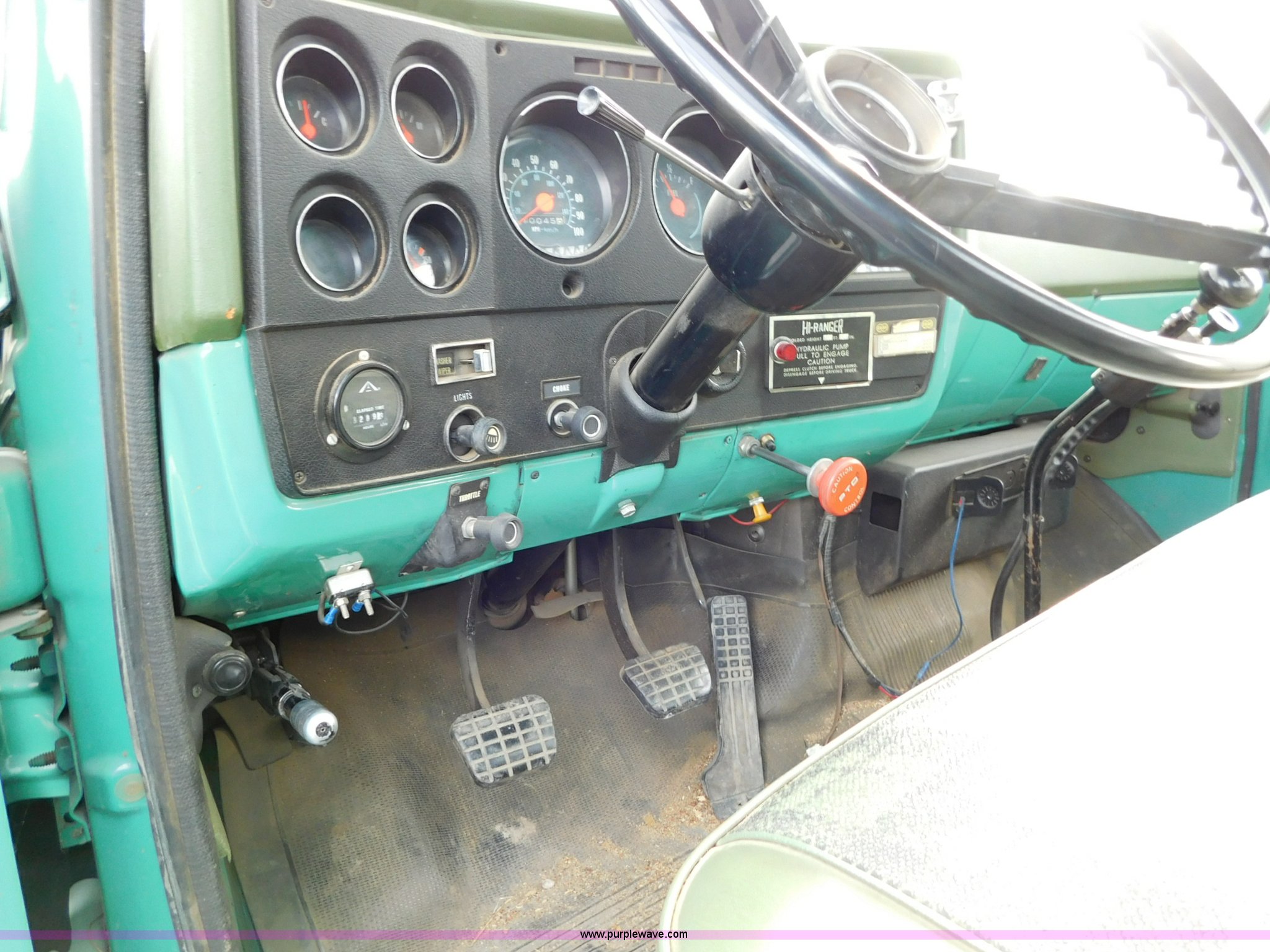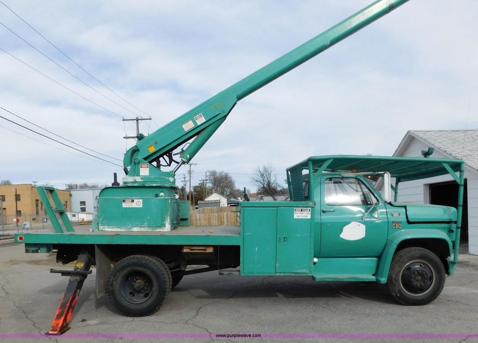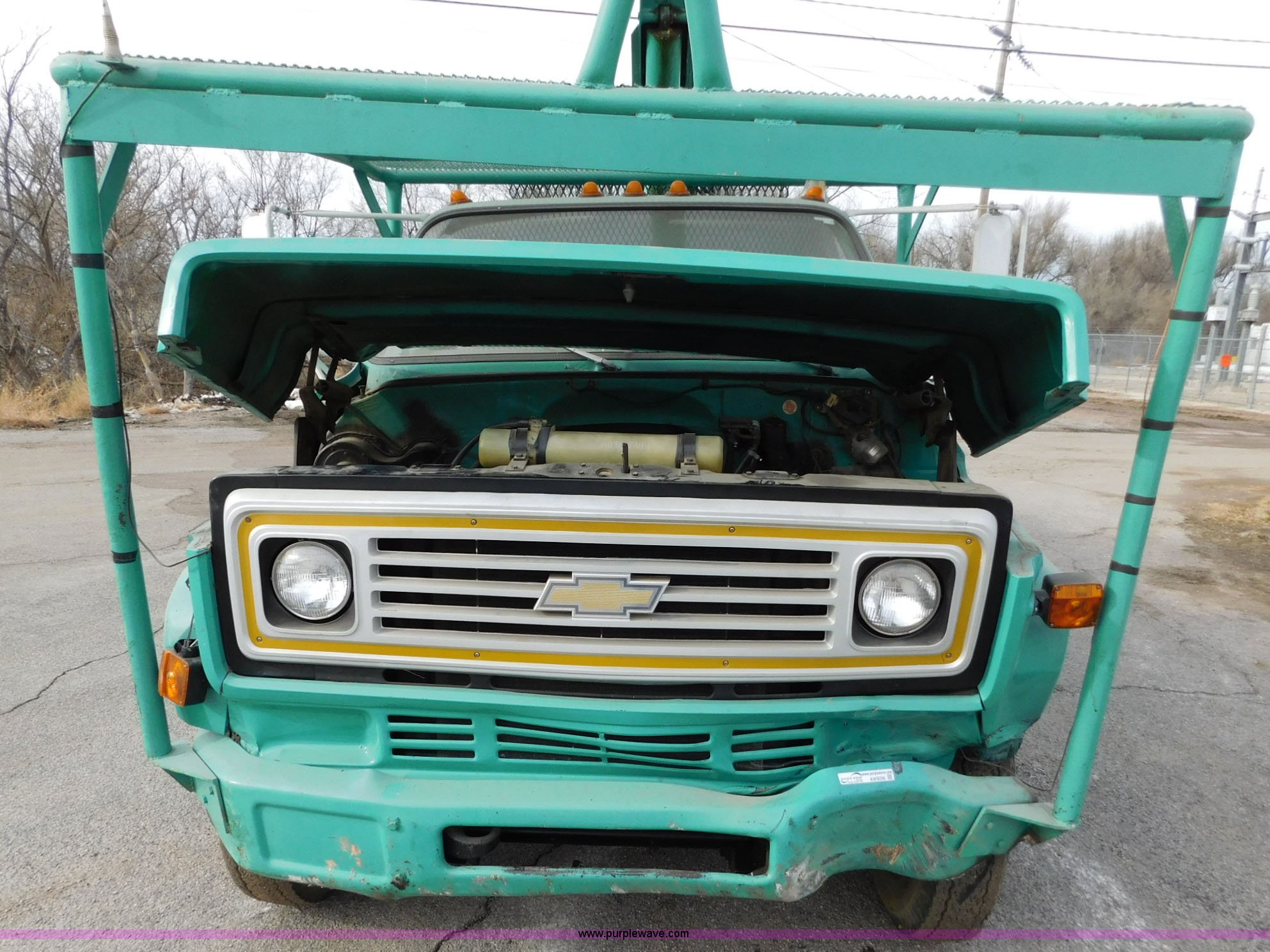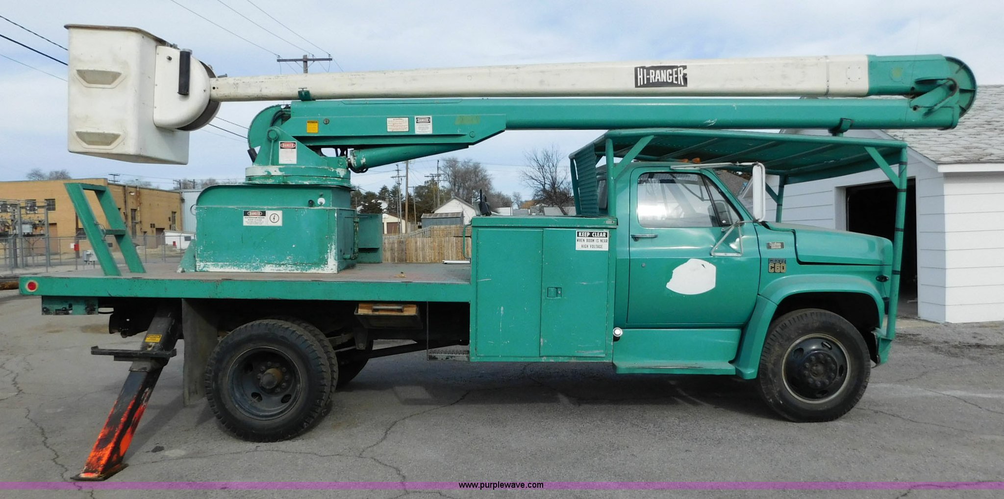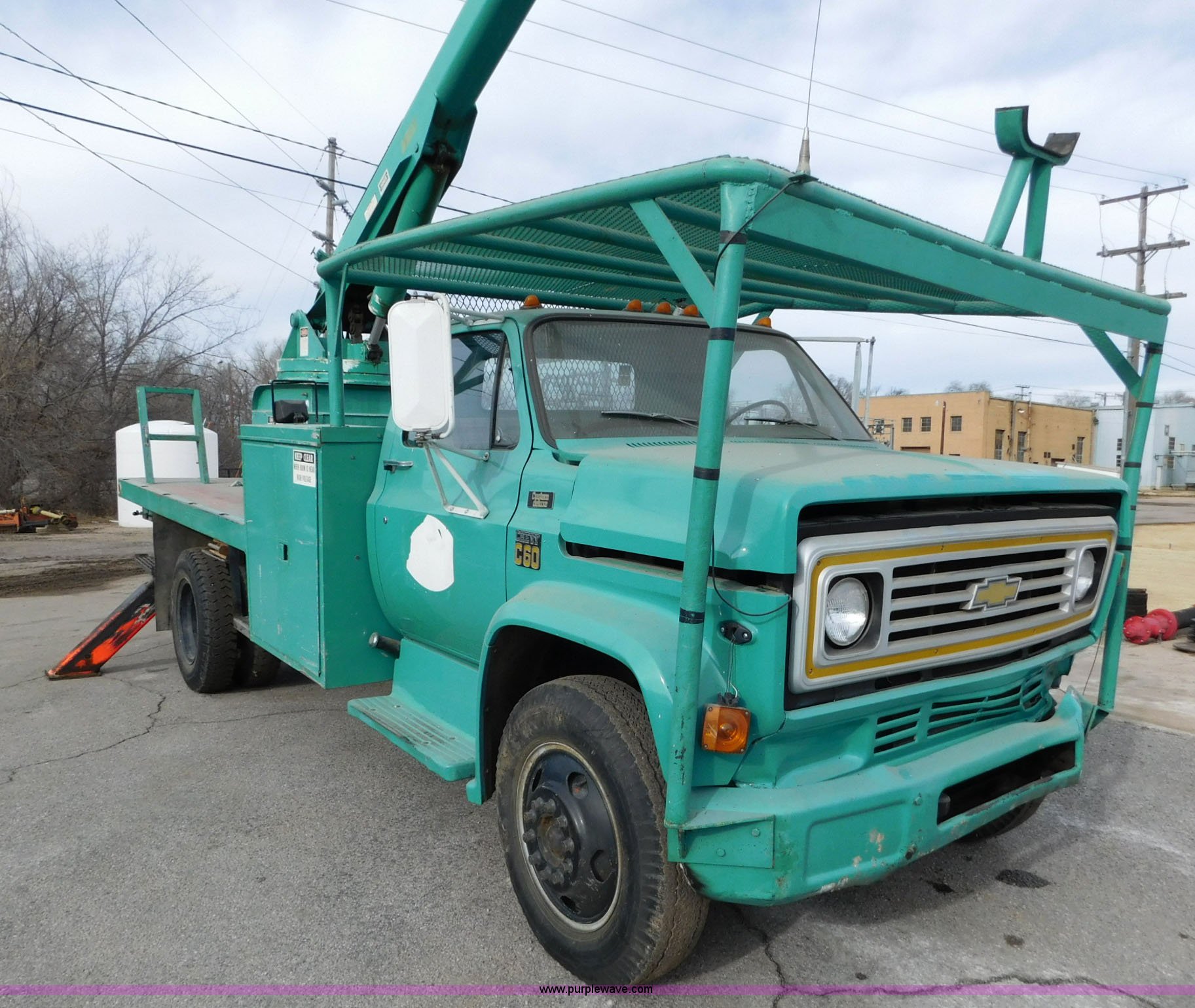 Purple Wave is selling a used Bucket Truck in Kansas. This item is a 1976 Chevrolet C60 bucket truck with the following: 10,045 miles on odometer, 3,290 hours on meter, Eight cylinder gas engine, Four speed manual transmission with hi/low, Heat, Suspension seat, Front tow hooks, PTO, 15'L service bed, Shelving, Work lights, Hi-Ranger 5F-48PBI boom, 500 lbs max lift capacity, Man basket, 53' max lift height, Ground boom controls, Boom rotation, (2) outriggers, Manual, Serial 10747244, Spring suspension, Hydraulic brakes, 174" wheelbase, Uniroyal 8.25-20 tires, GVWR 21,200 lbs, Hydraulic and air lines have been replaced on boom, Lift cable on boom needs replaced, Front end damage, Engine oil leak, Broken front glass, Unit will need to pass inspection prior to being put into service