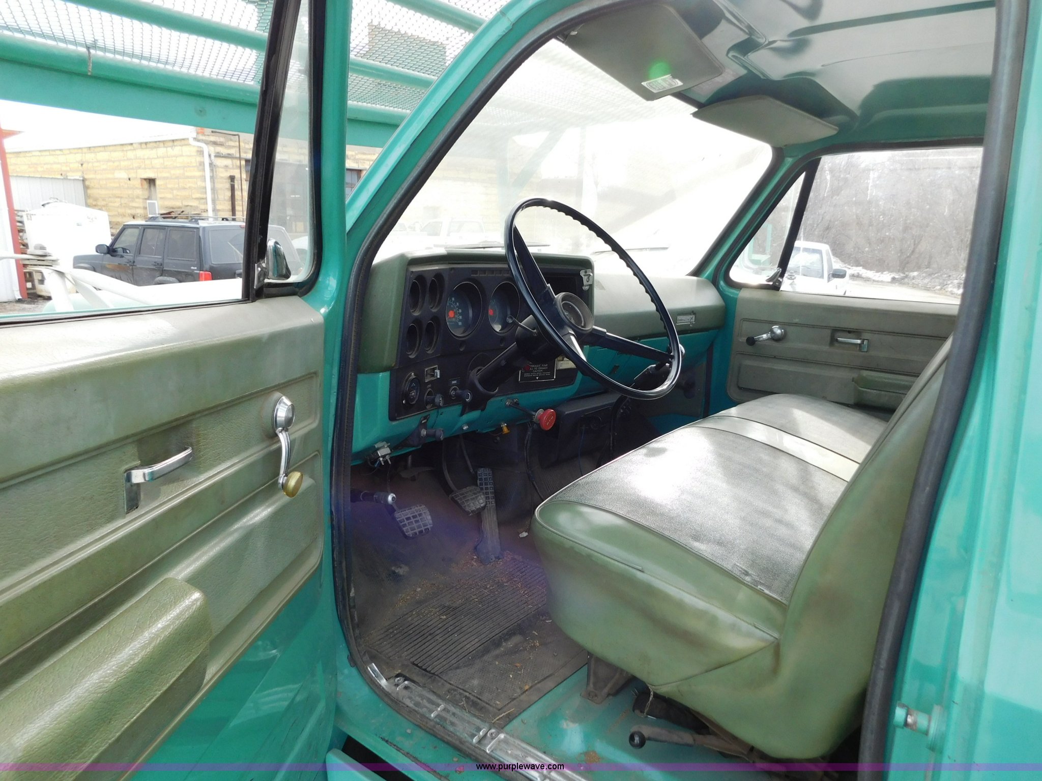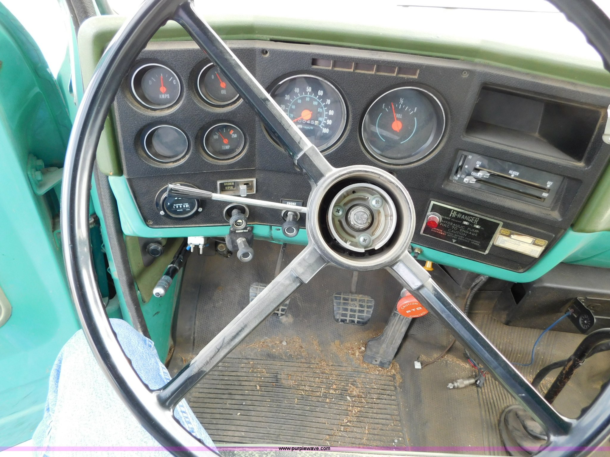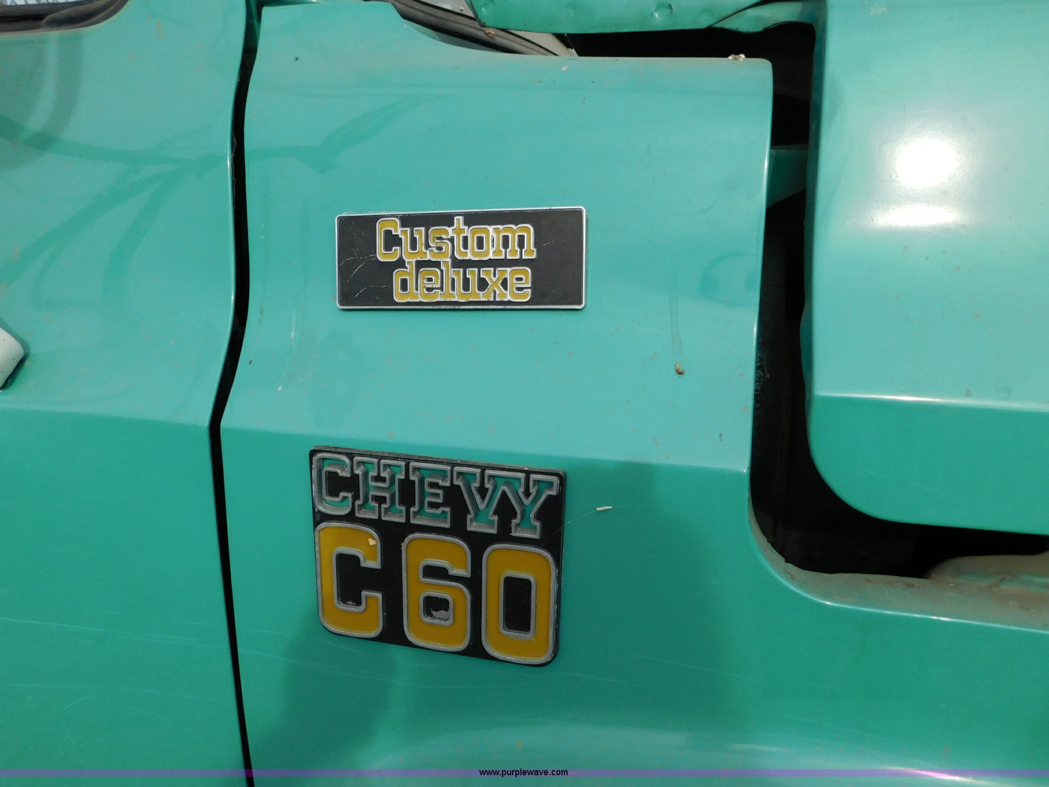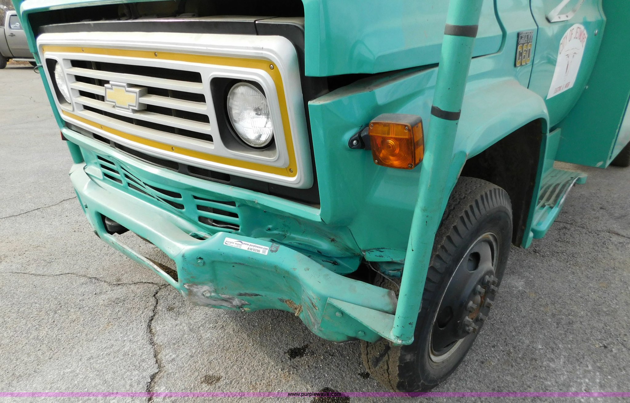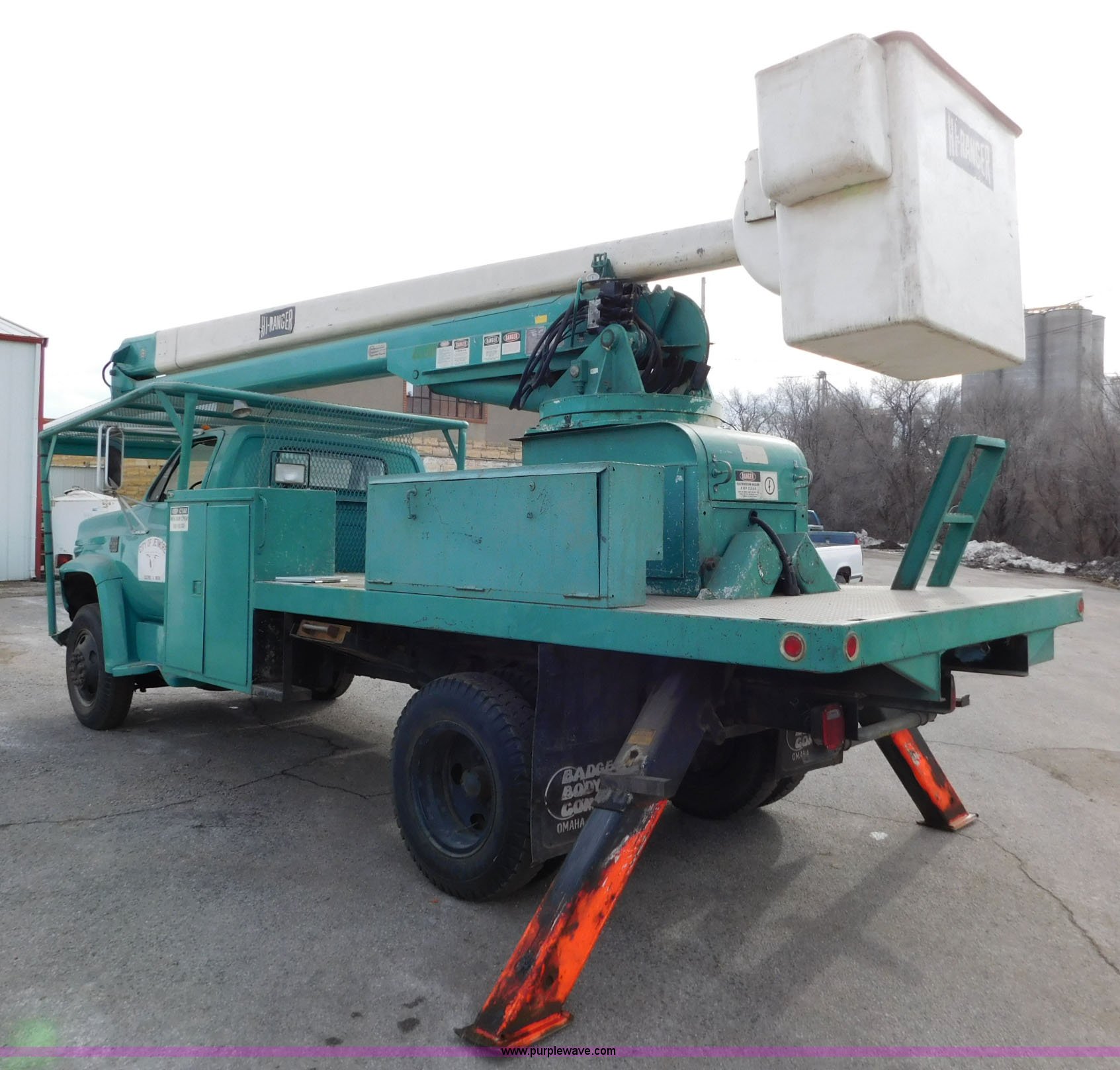 Purple Wave is selling a used Bucket Truck in Kansas. This item is a 1976 Chevrolet C60 bucket truck with the following: 10,045 miles on odometer, 3,290 hours on meter, Eight cylinder gas engine, Four speed manual transmission with hi/low, Heat, Suspension seat, Front tow hooks, PTO, 15'L service bed, Shelving, Work lights, Hi-Ranger 5F-48PBI boom, 500 lbs max lift capacity, Man basket, 53' max lift height, Ground boom controls, Boom rotation, (2) outriggers, Manual, Serial 10747244, Spring suspension, Hydraulic brakes, 174" wheelbase, Uniroyal 8.25-20 tires, GVWR 21,200 lbs, Hydraulic and air lines have been replaced on boom, Lift cable on boom needs replaced, Front end damage, Engine oil leak, Broken front glass, Unit will need to pass inspection prior to being put into service