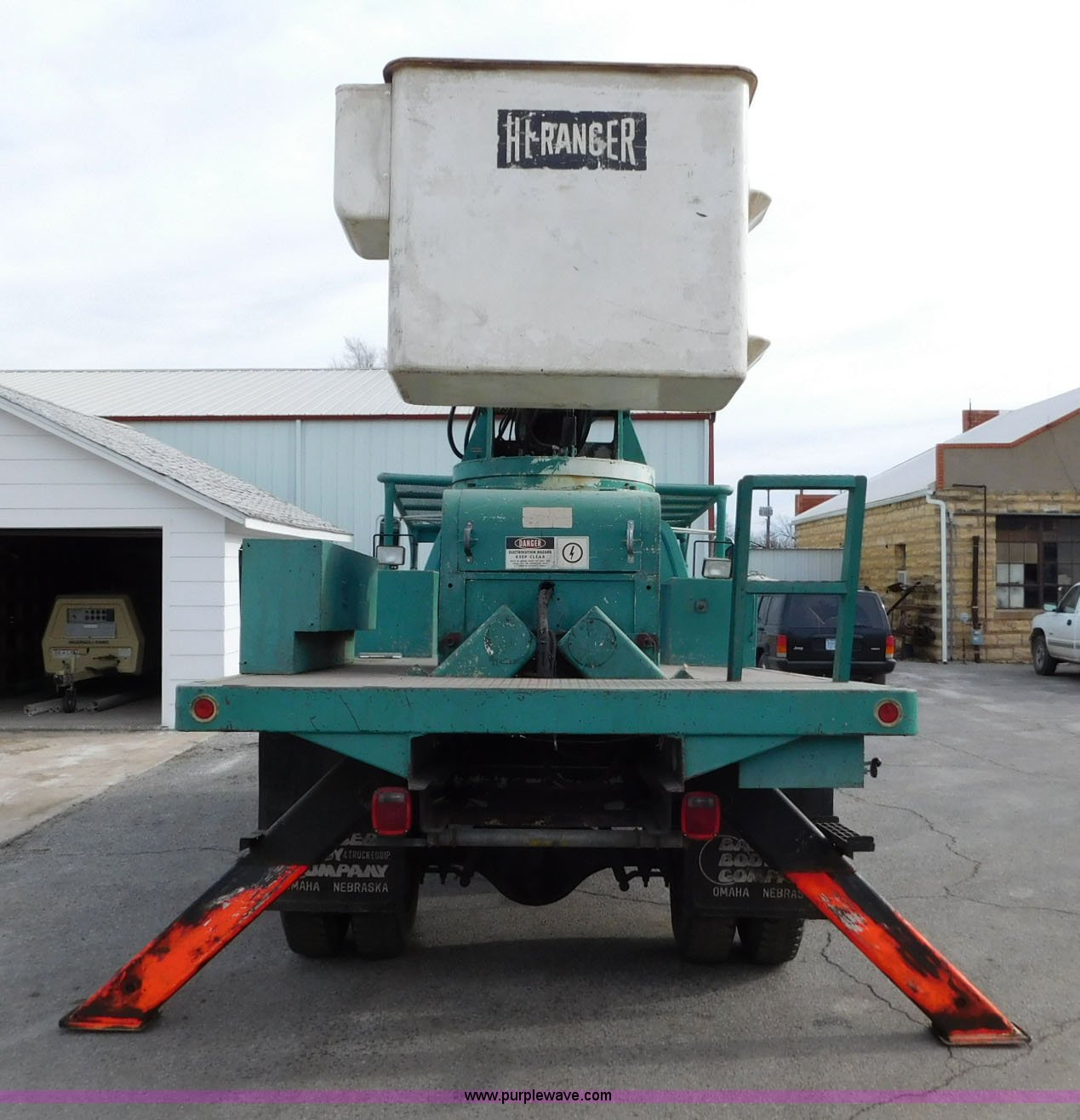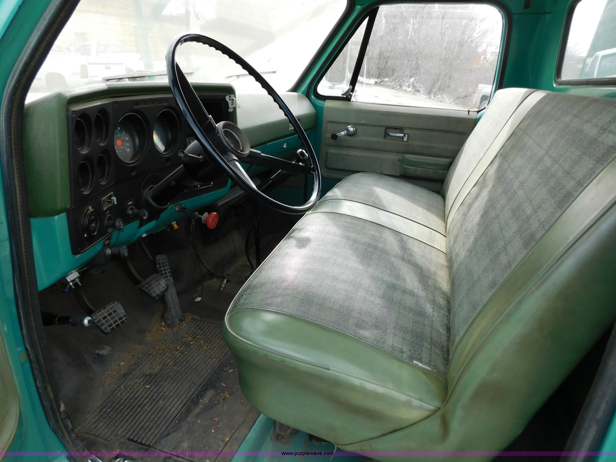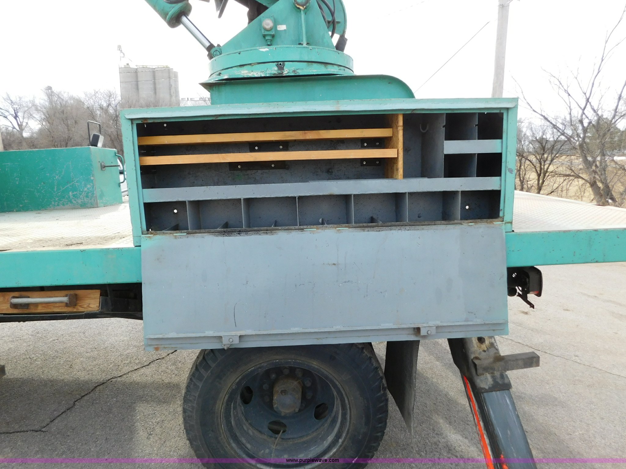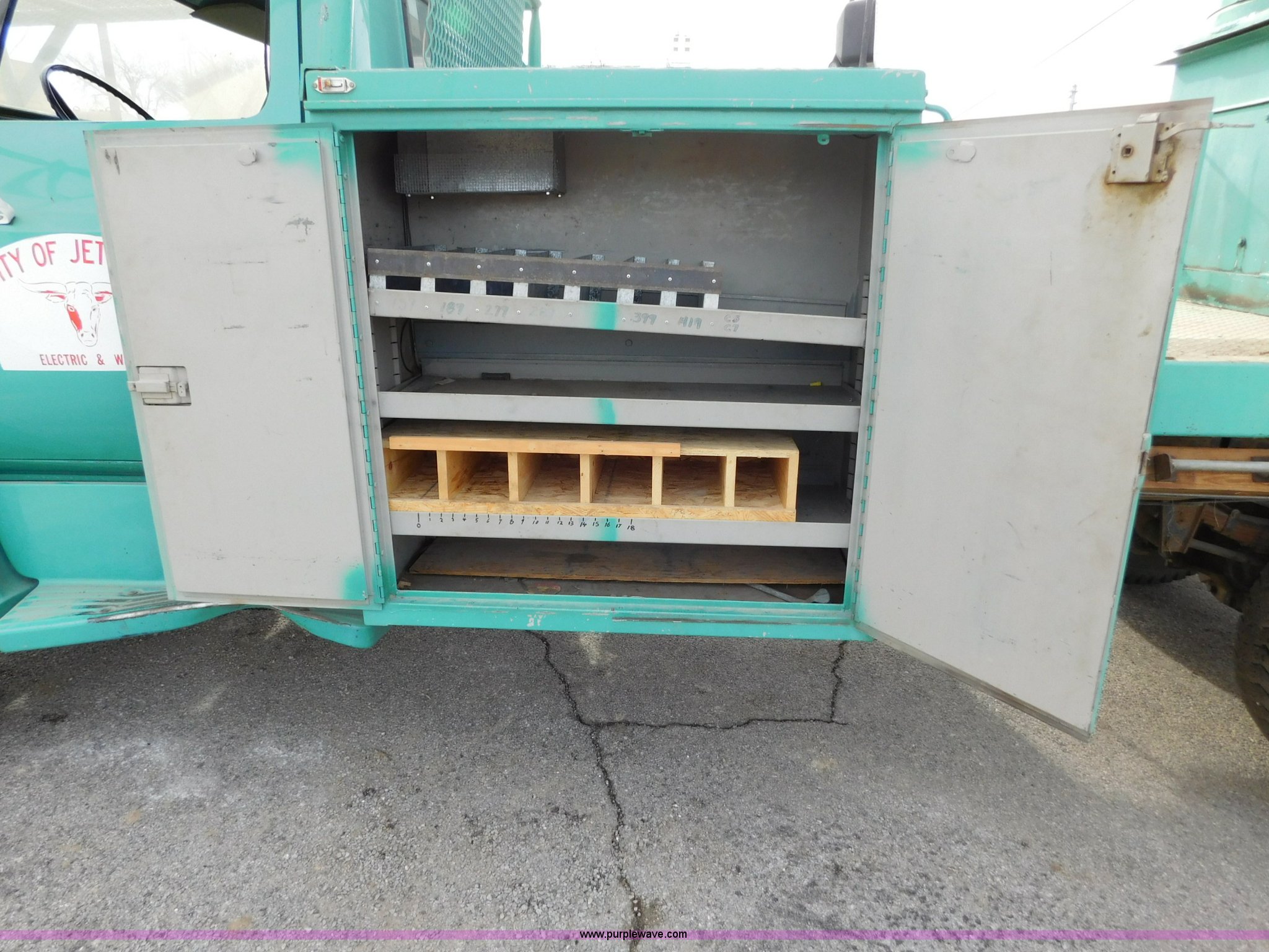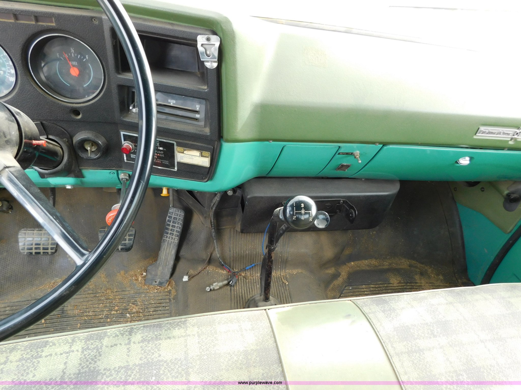 Purple Wave is selling a used Bucket Truck in Kansas. This item is a 1976 Chevrolet C60 bucket truck with the following: 10,045 miles on odometer, 3,290 hours on meter, Eight cylinder gas engine, Four speed manual transmission with hi/low, Heat, Suspension seat, Front tow hooks, PTO, 15'L service bed, Shelving, Work lights, Hi-Ranger 5F-48PBI boom, 500 lbs max lift capacity, Man basket, 53' max lift height, Ground boom controls, Boom rotation, (2) outriggers, Manual, Serial 10747244, Spring suspension, Hydraulic brakes, 174" wheelbase, Uniroyal 8.25-20 tires, GVWR 21,200 lbs, Hydraulic and air lines have been replaced on boom, Lift cable on boom needs replaced, Front end damage, Engine oil leak, Broken front glass, Unit will need to pass inspection prior to being put into service