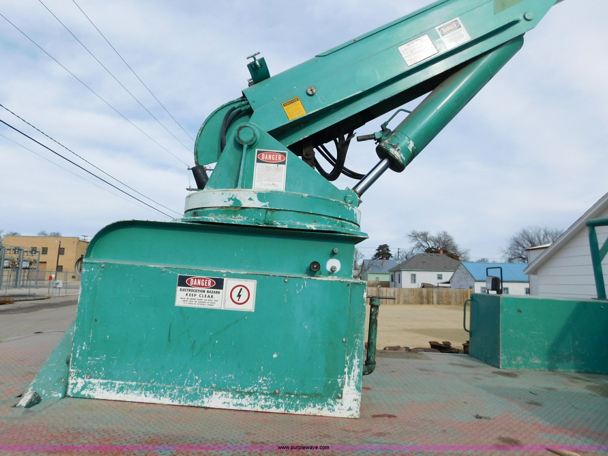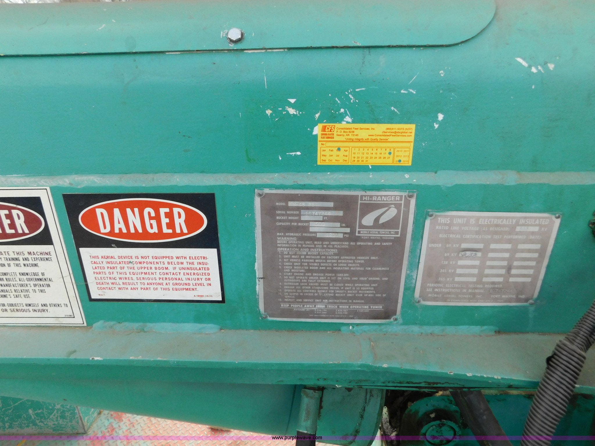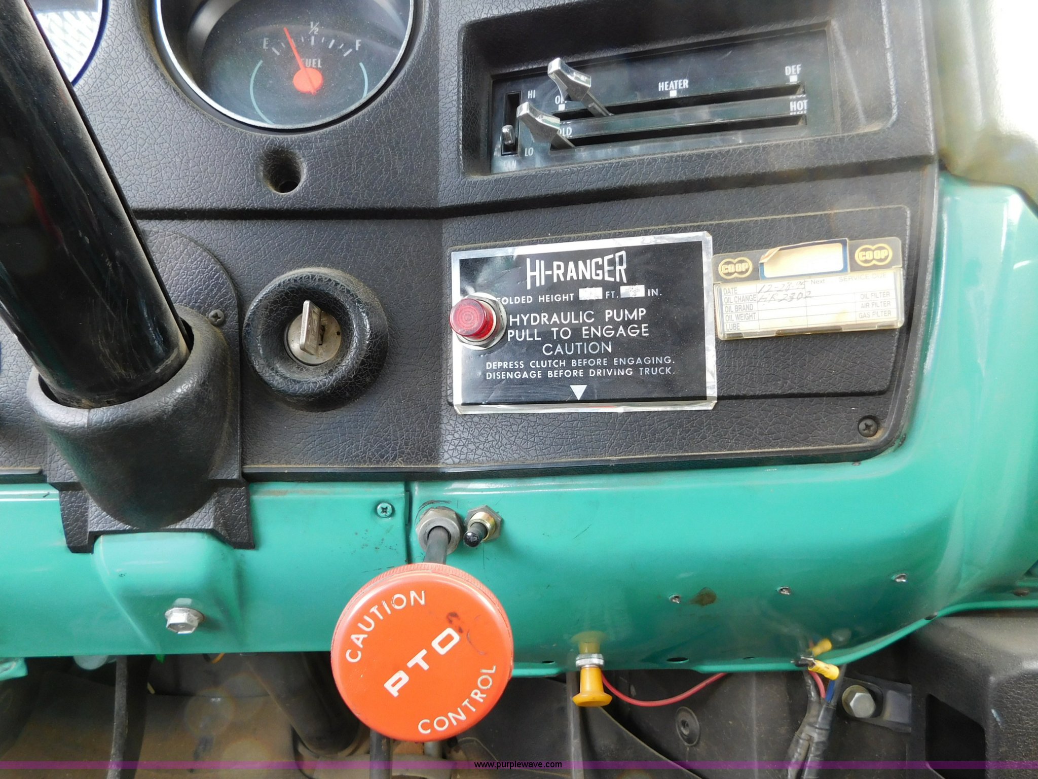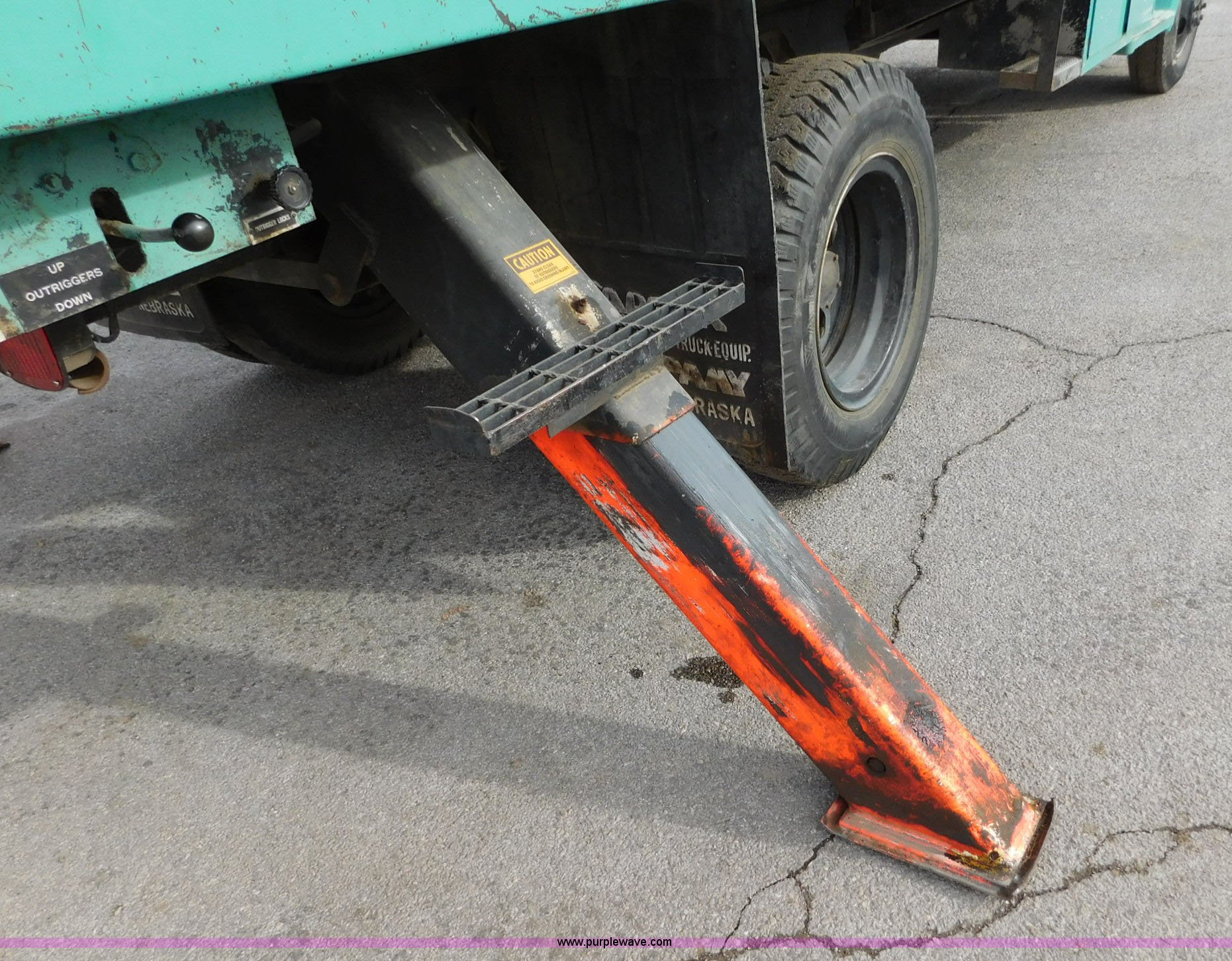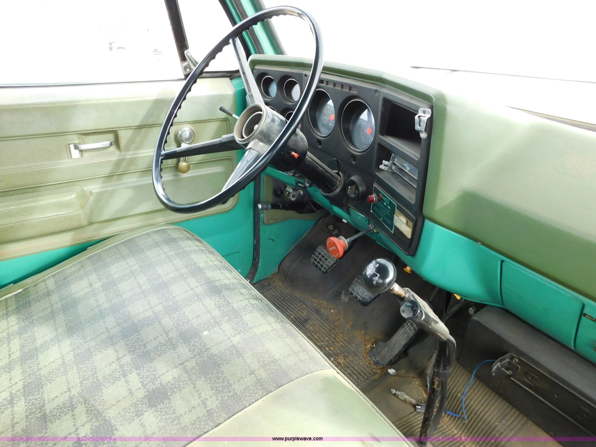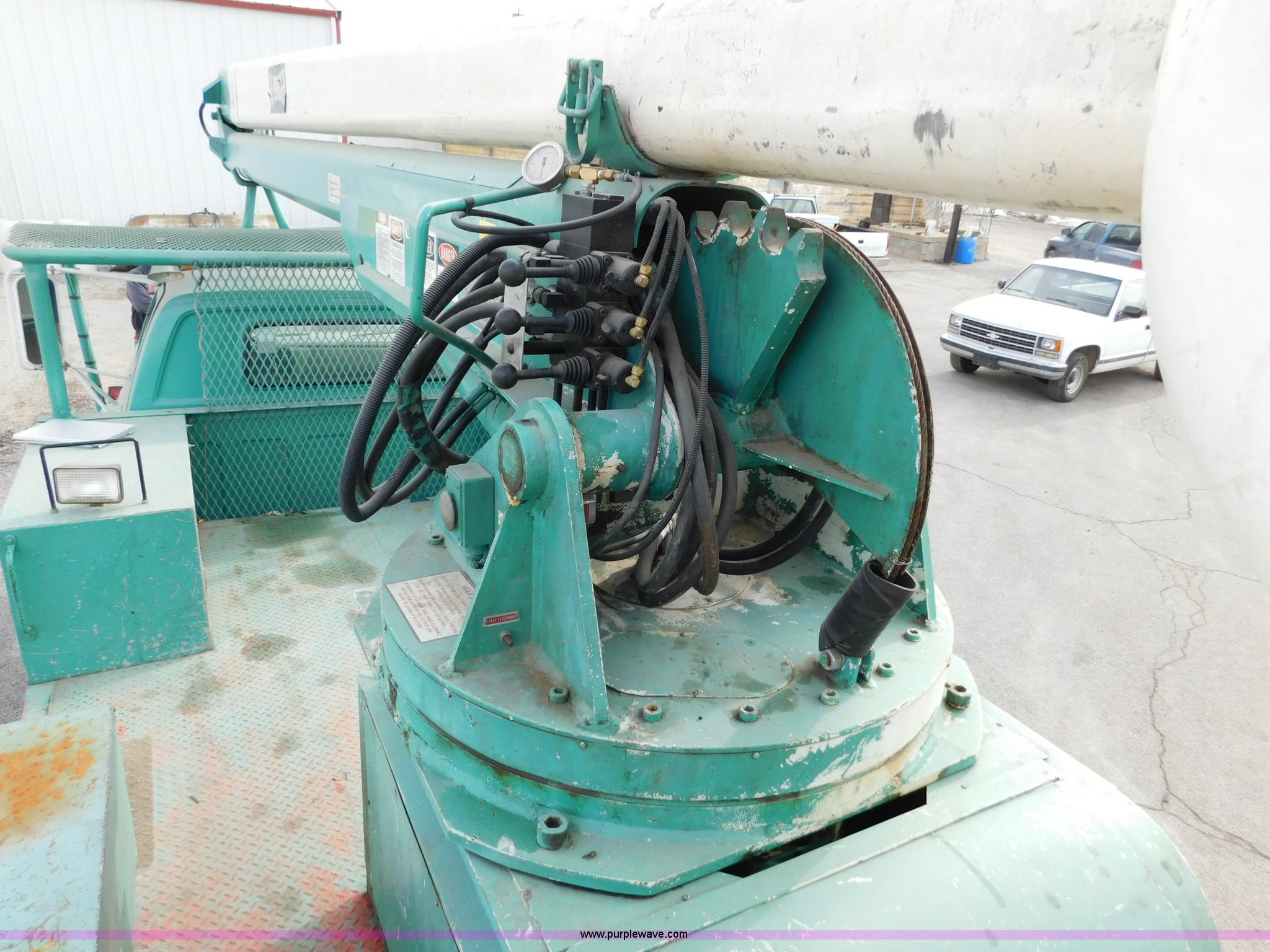 Purple Wave is selling a used Bucket Truck in Kansas. This item is a 1976 Chevrolet C60 bucket truck with the following: 10,045 miles on odometer, 3,290 hours on meter, Eight cylinder gas engine, Four speed manual transmission with hi/low, Heat, Suspension seat, Front tow hooks, PTO, 15'L service bed, Shelving, Work lights, Hi-Ranger 5F-48PBI boom, 500 lbs max lift capacity, Man basket, 53' max lift height, Ground boom controls, Boom rotation, (2) outriggers, Manual, Serial 10747244, Spring suspension, Hydraulic brakes, 174" wheelbase, Uniroyal 8.25-20 tires, GVWR 21,200 lbs, Hydraulic and air lines have been replaced on boom, Lift cable on boom needs replaced, Front end damage, Engine oil leak, Broken front glass, Unit will need to pass inspection prior to being put into service