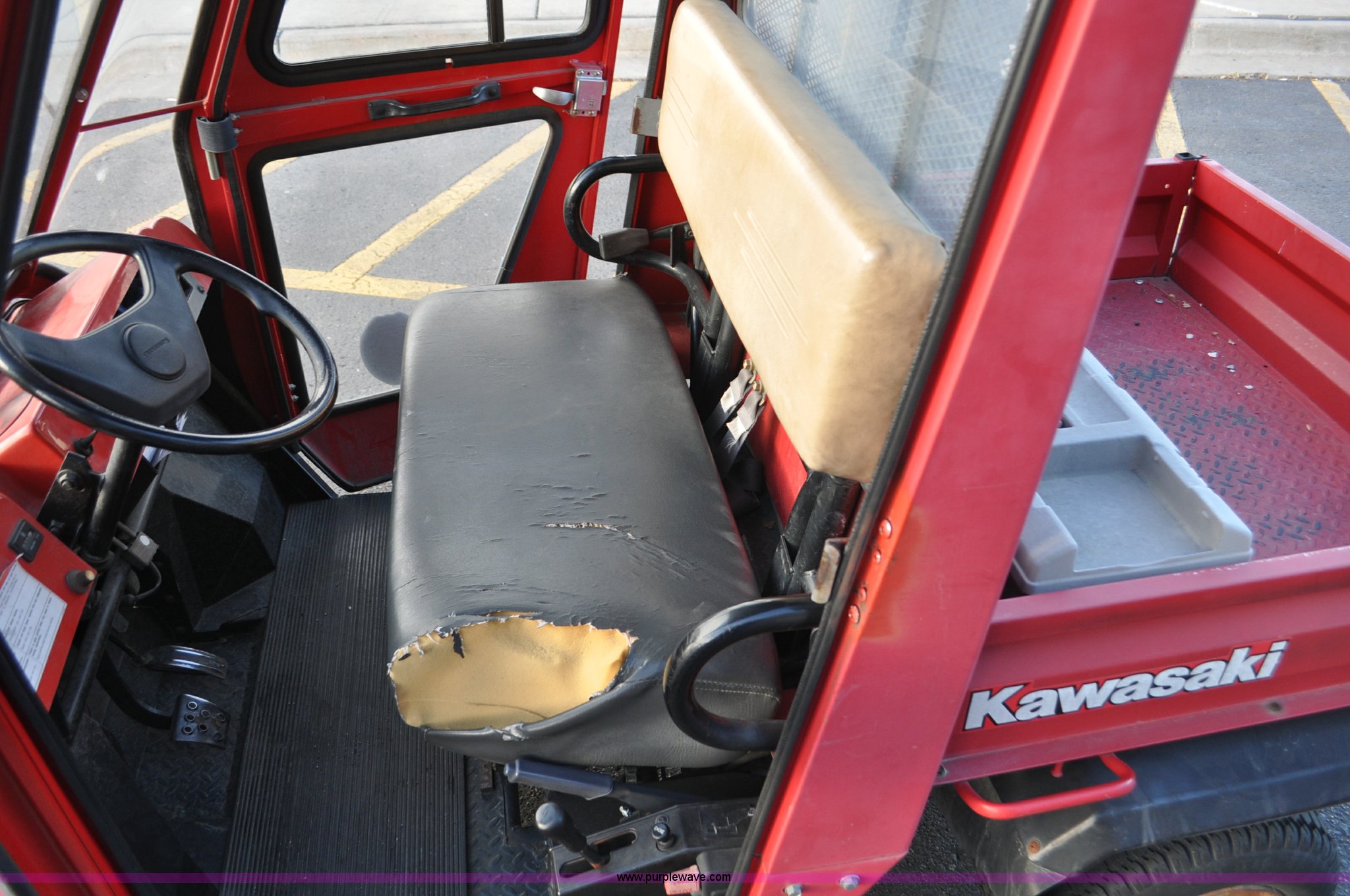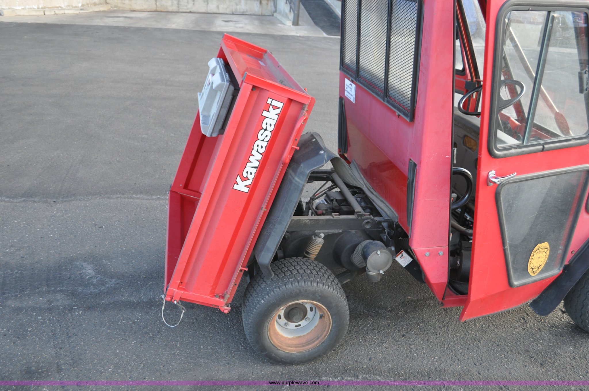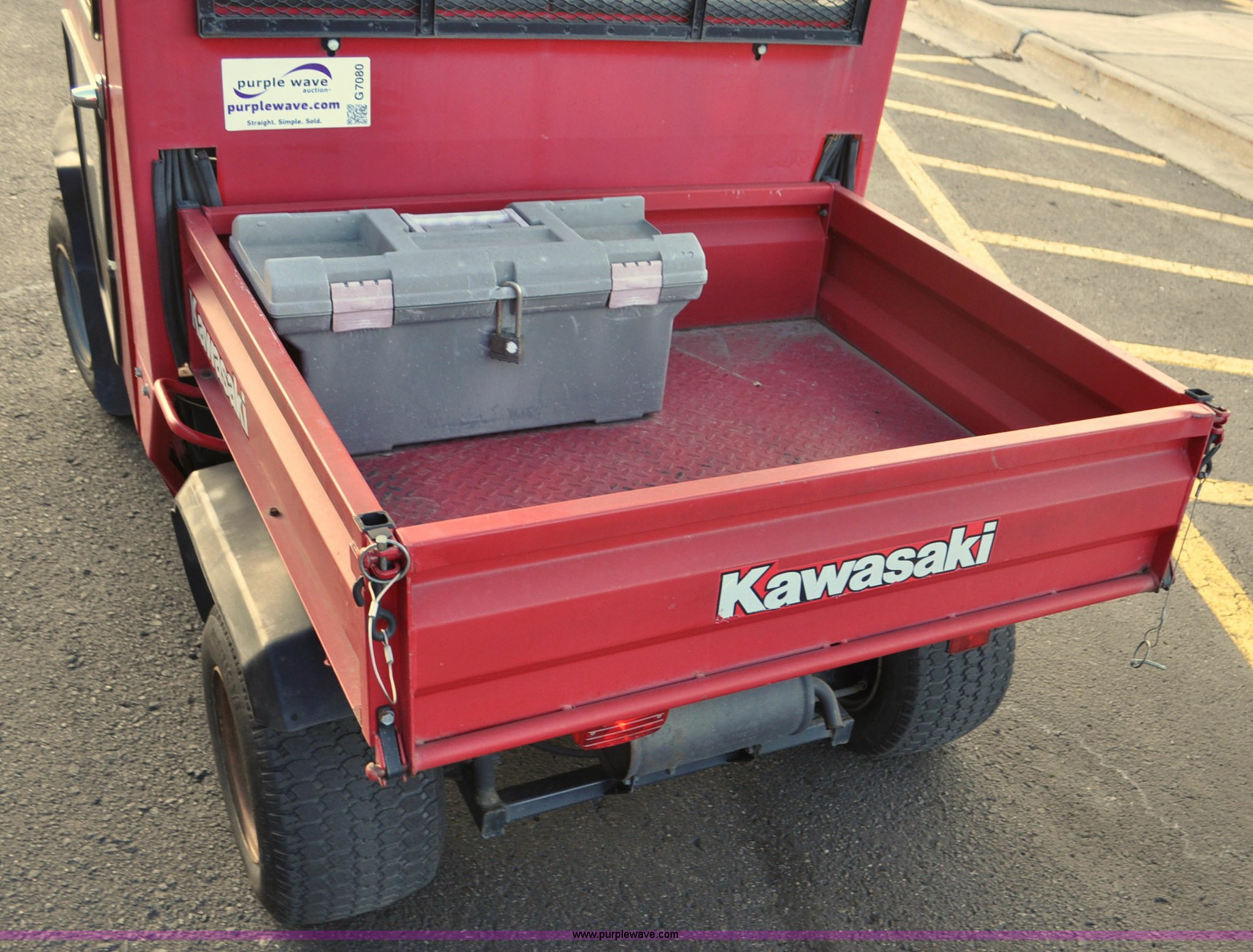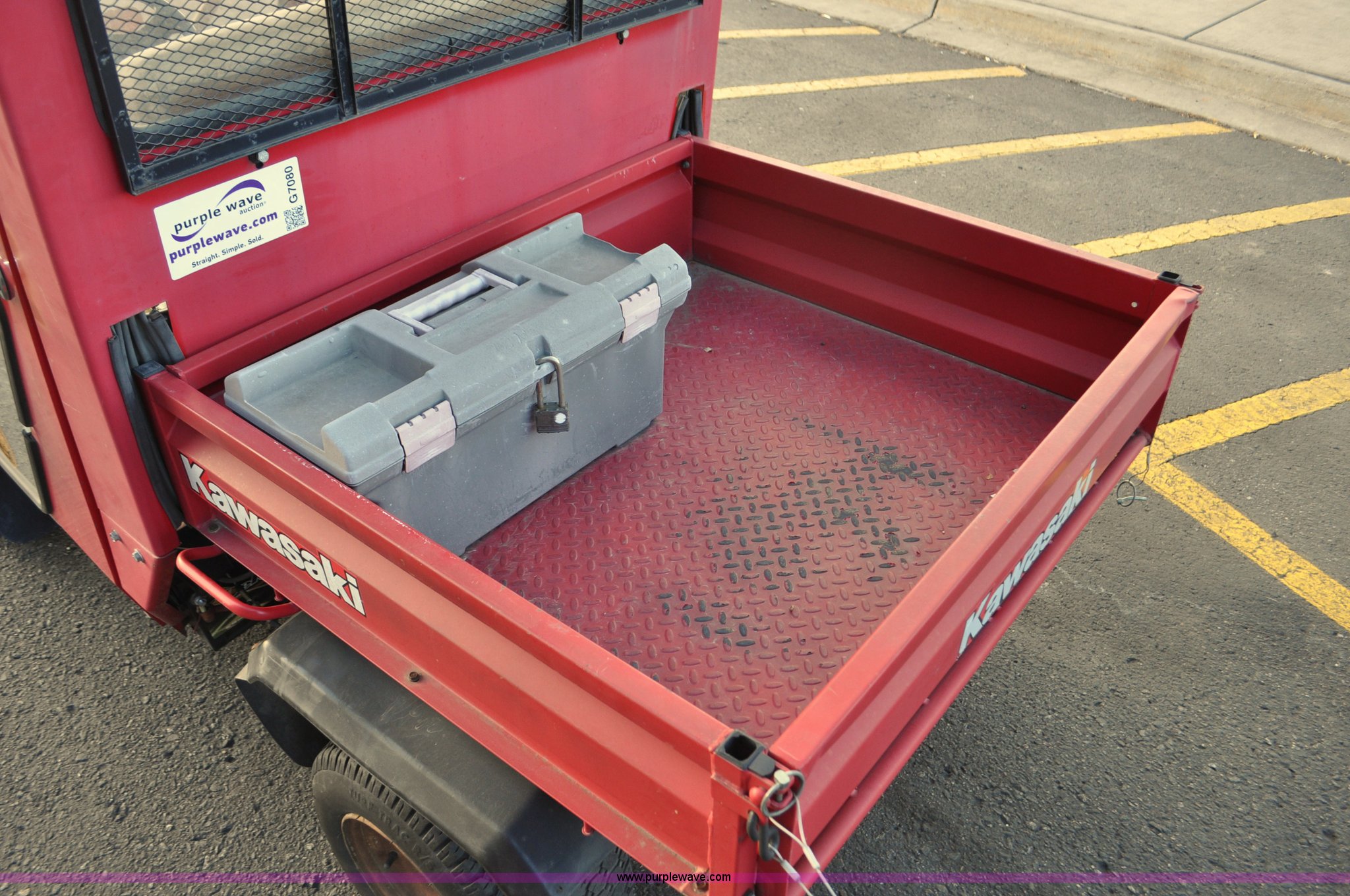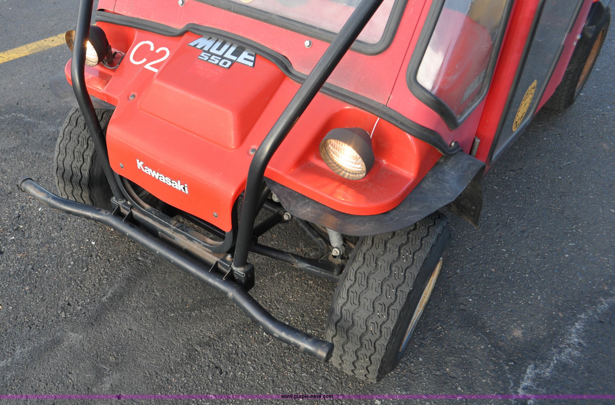 Purple Wave is selling a used ATV in Colorado. This item is a 2000 Kawasaki Mule 550 utility vehicle with the following: 2552 hours on meter, Kawasaki gas engine, Automatic transmission, Headlights, Windshield wiper, Enclosed cab, 3'L x 3'W manual lift dump bed, 20 x 8.0-10 front tires, 20 x 10.00-10 rear tires, Seat damaged