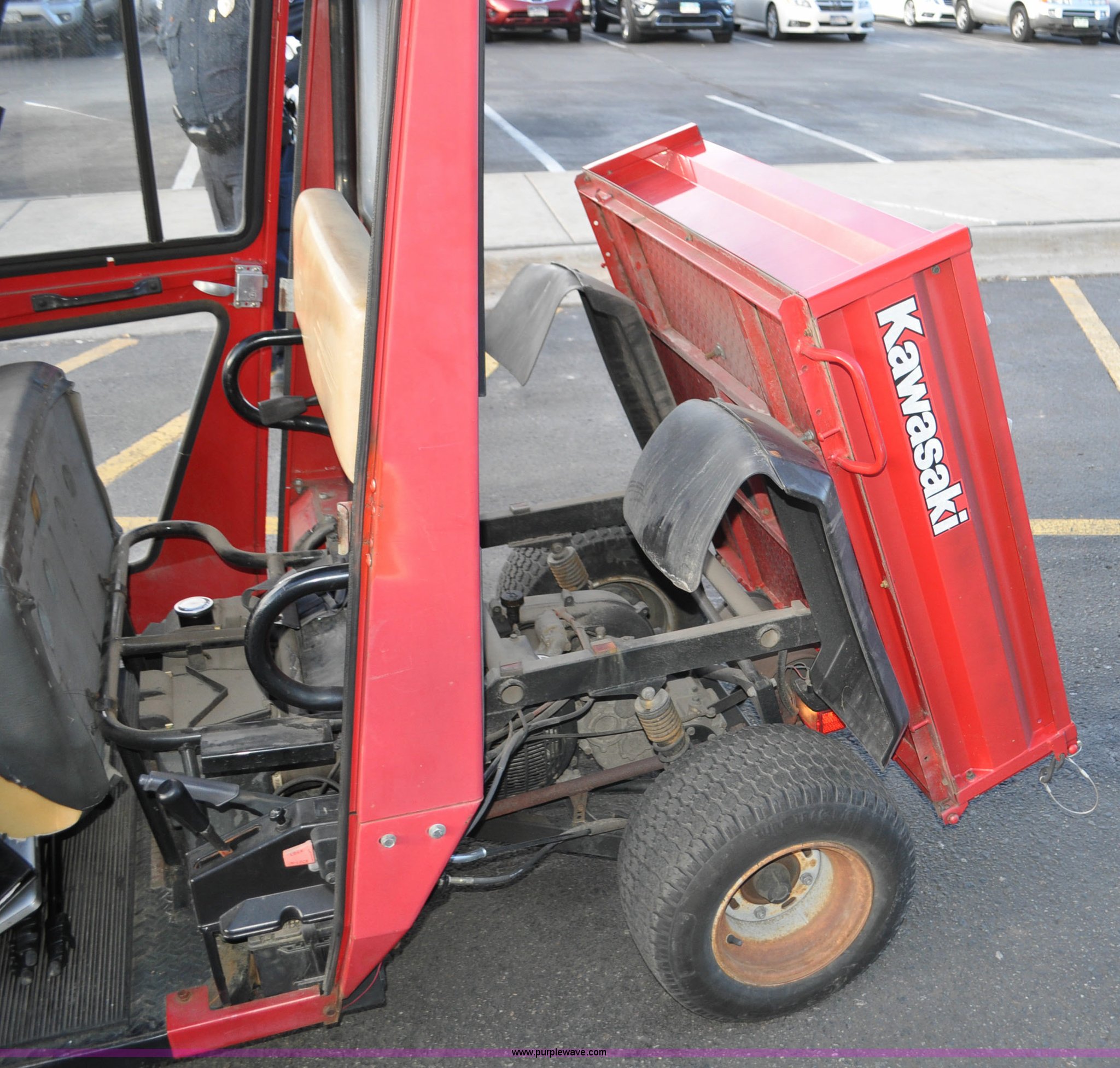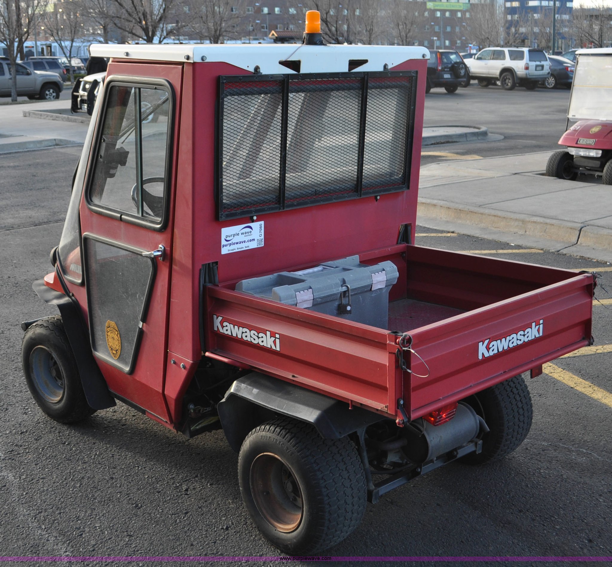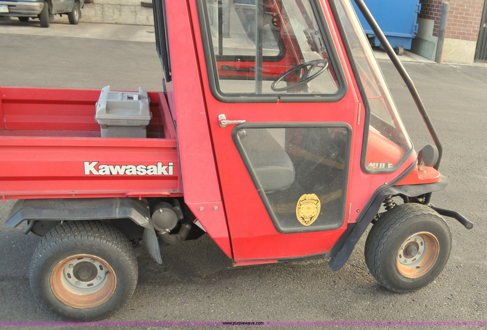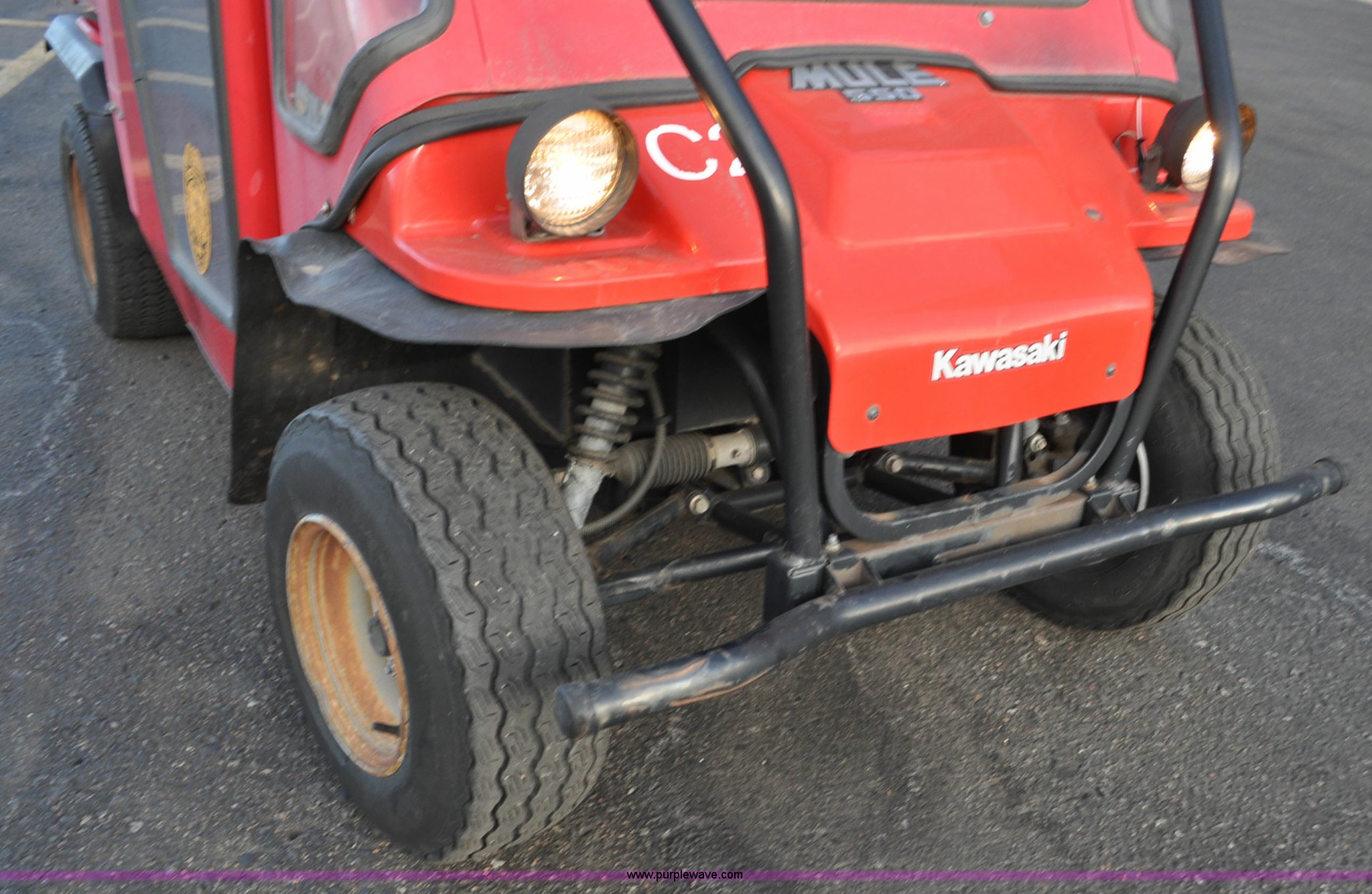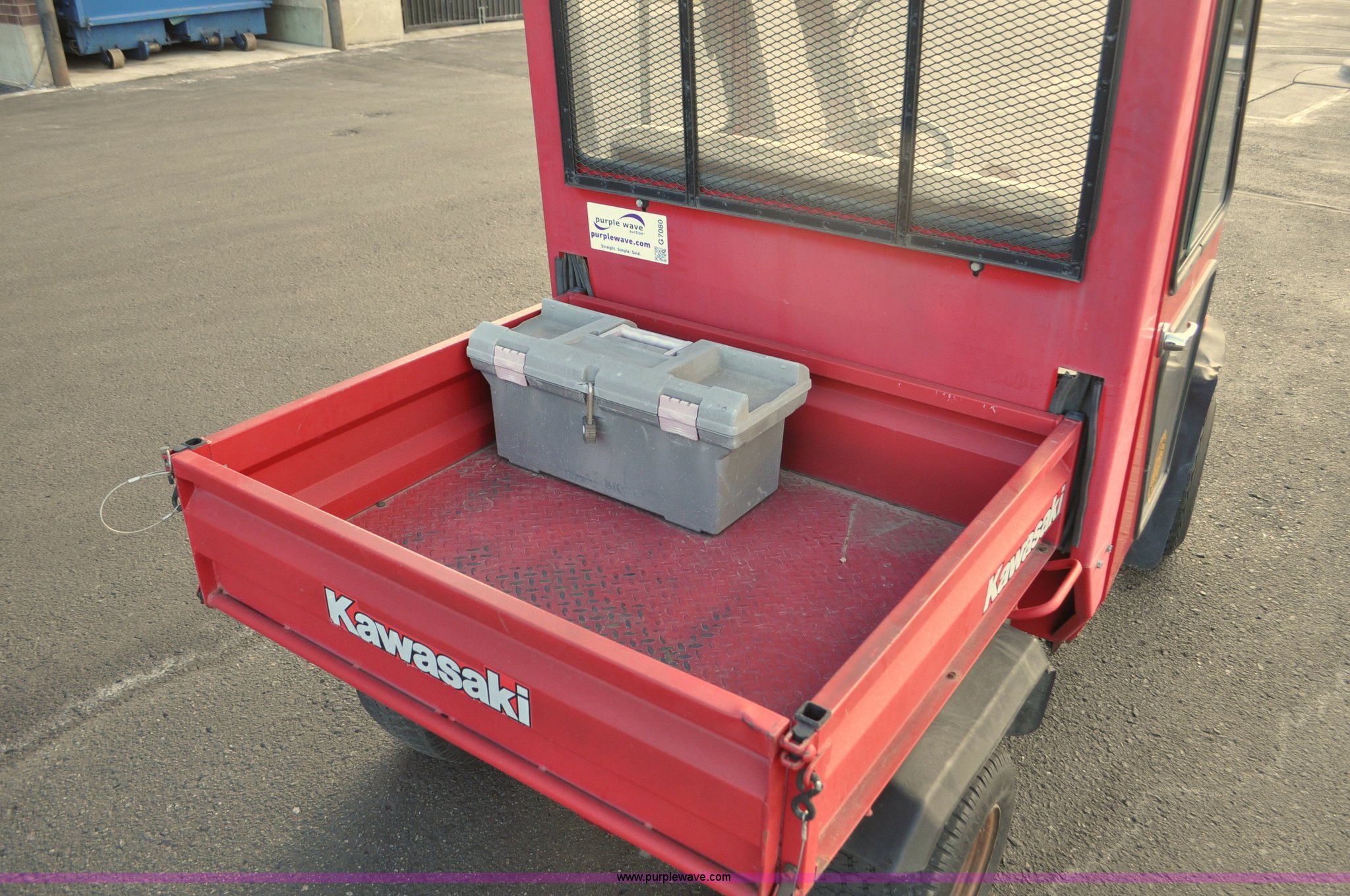 Purple Wave is selling a used ATV in Colorado. This item is a 2000 Kawasaki Mule 550 utility vehicle with the following: 2552 hours on meter, Kawasaki gas engine, Automatic transmission, Headlights, Windshield wiper, Enclosed cab, 3'L x 3'W manual lift dump bed, 20 x 8.0-10 front tires, 20 x 10.00-10 rear tires, Seat damaged