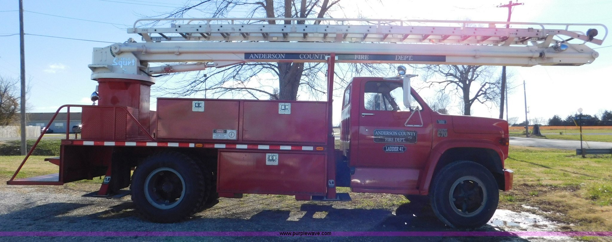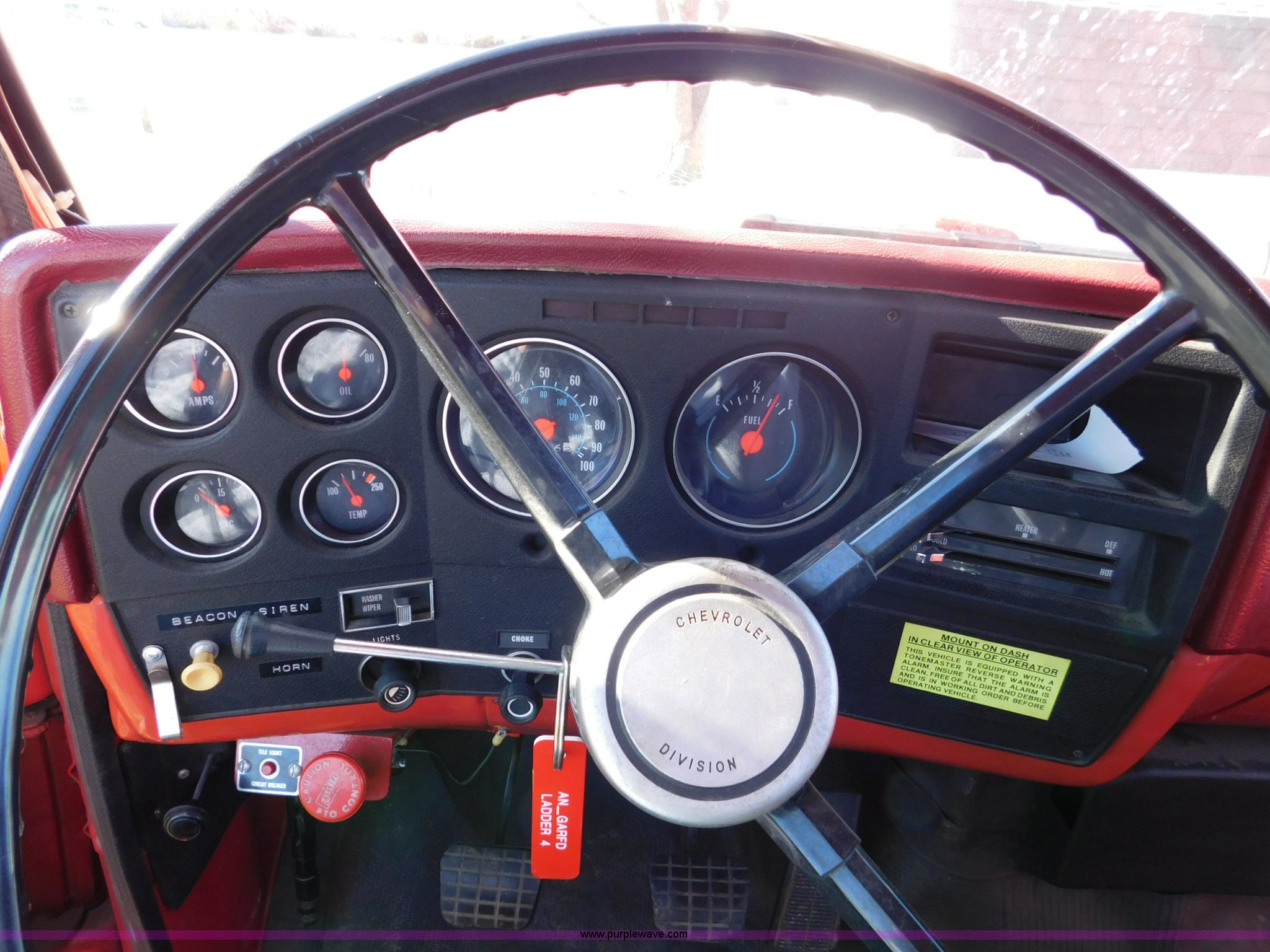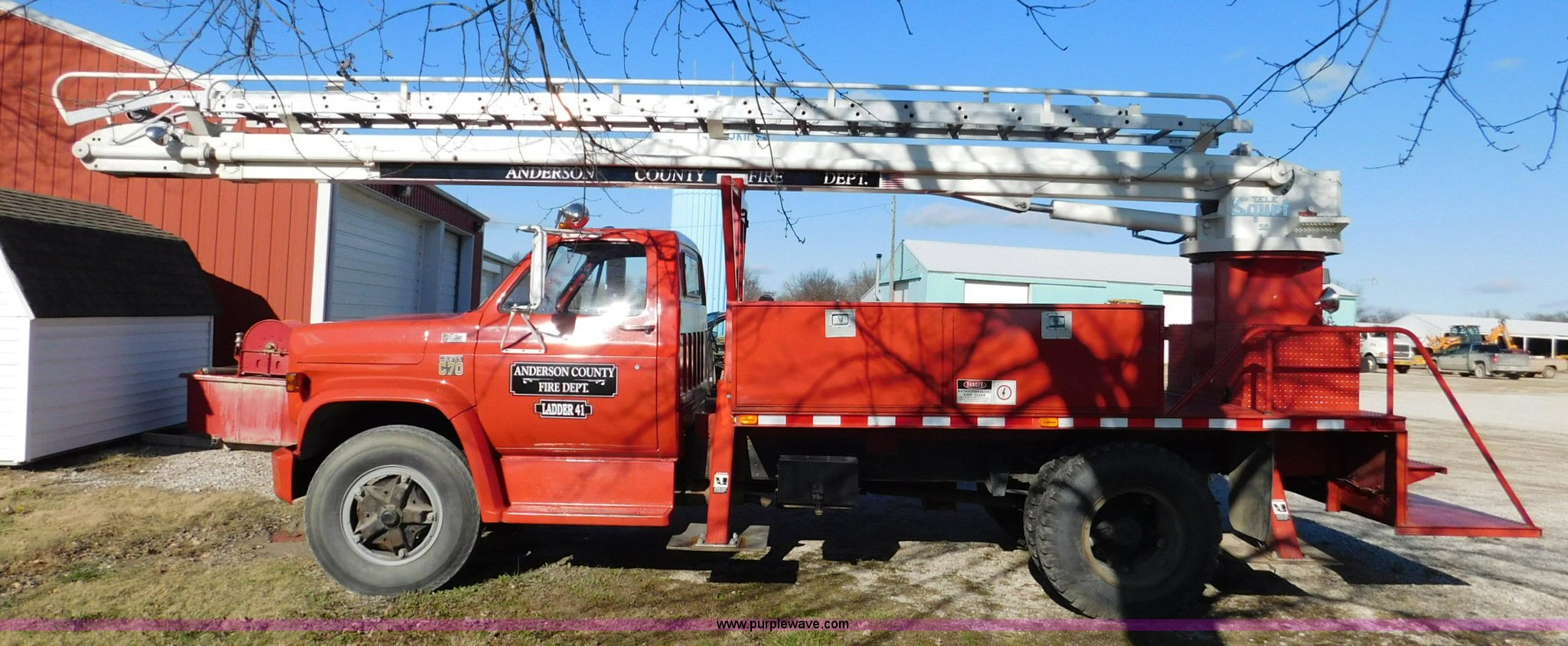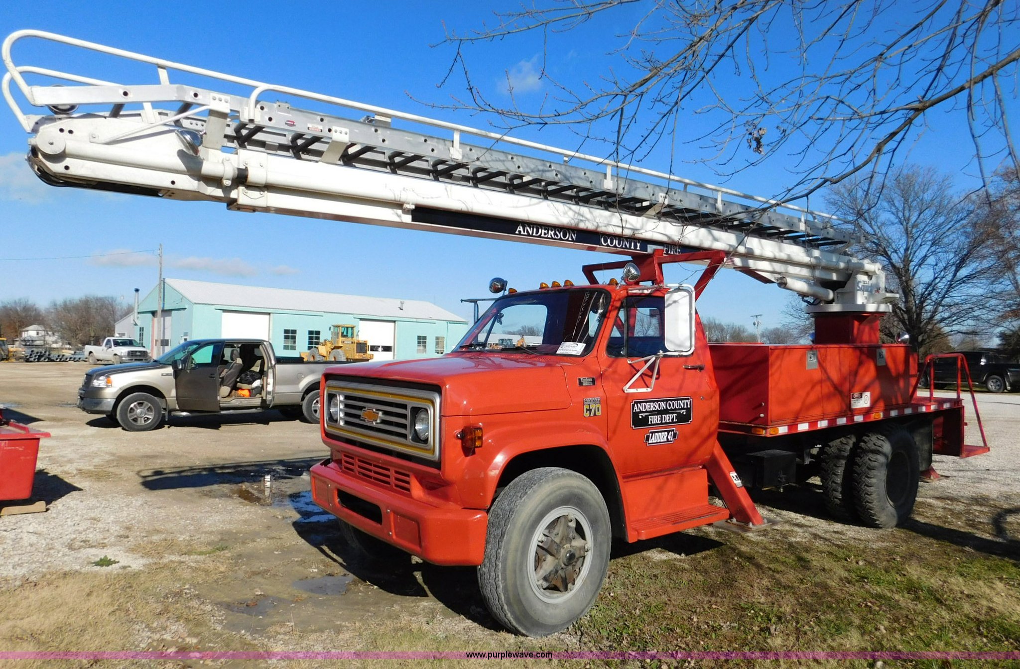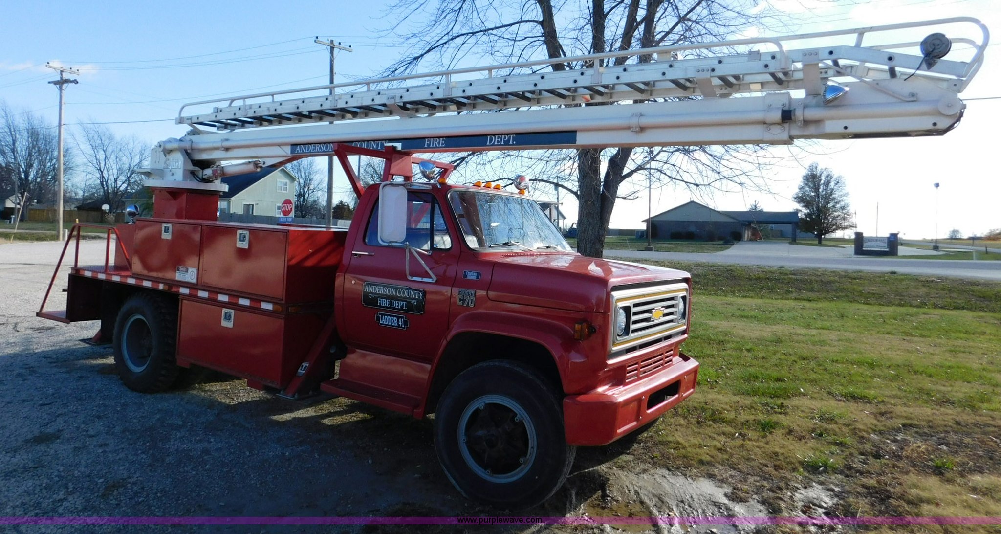 Purple Wave is selling a used Fire Truck or Emergency Vehicle in Kansas. This item is a 1979 Chevrolet C70 Custom Deluxe fire truck with the following: 4,296 miles on odometer, Eight cylinder gas engine, Five speed manual transmission, AC and heat, Ladder, 9.0-20 front tires, 10.00-20 rear tires, GVWR 27,500 lbs, No pump included