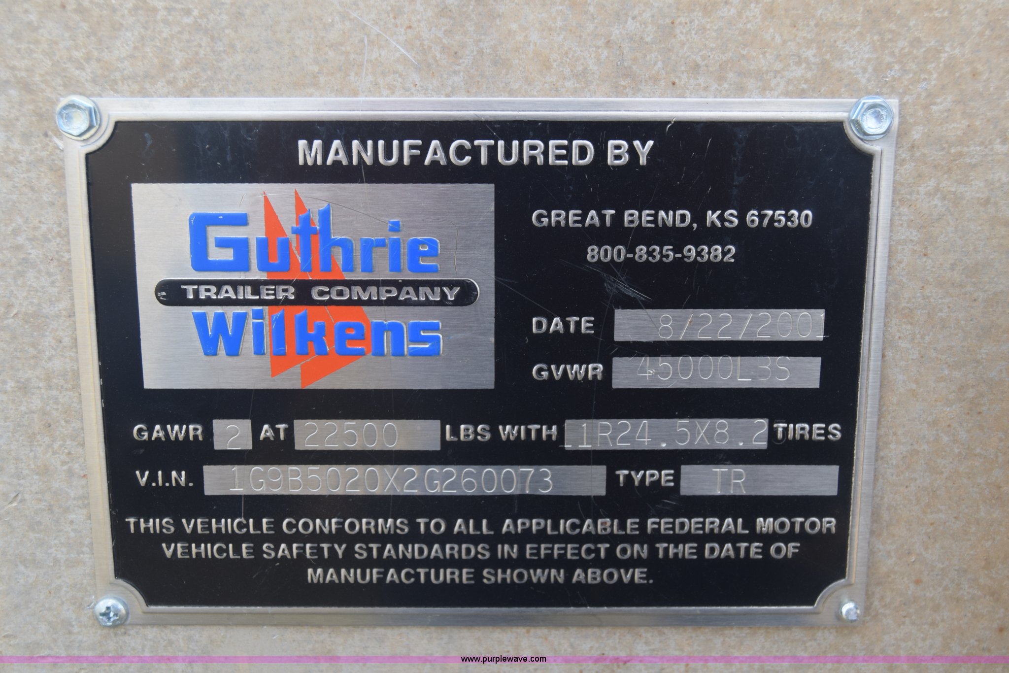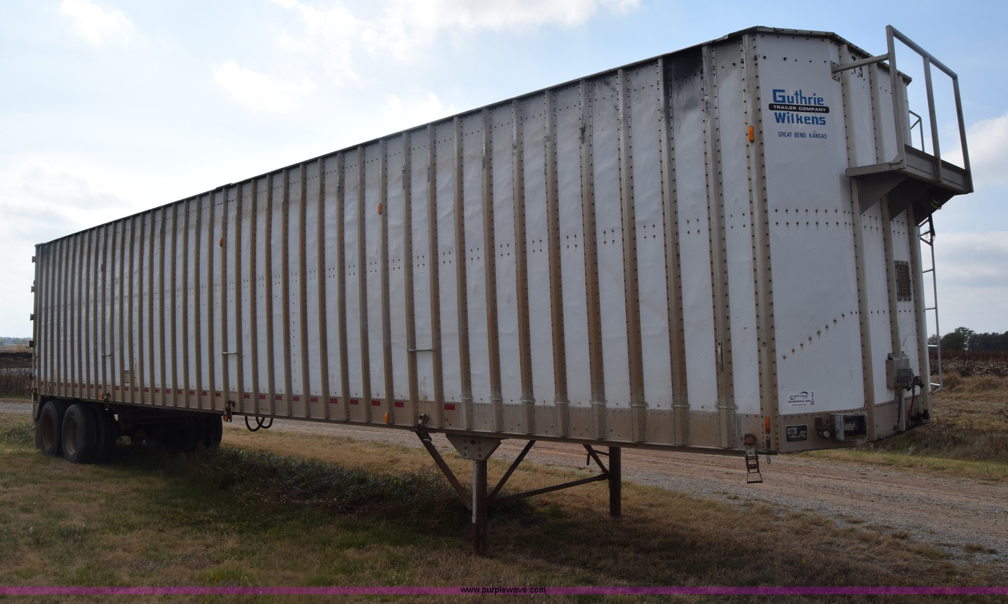 Purple Wave is selling a used Trailer Other in Kansas. This item is a 2002 Guthrie Wilkens live bottom trailer with the following: 50'L x 8'W, (2) rear swing doors, Keith walking floor, Aluminum floor, Dual leg landing gear, Air brakes, 11R24.5 tires, GVWR 45,000 lbs, Floor and wall damage, Holes in wall