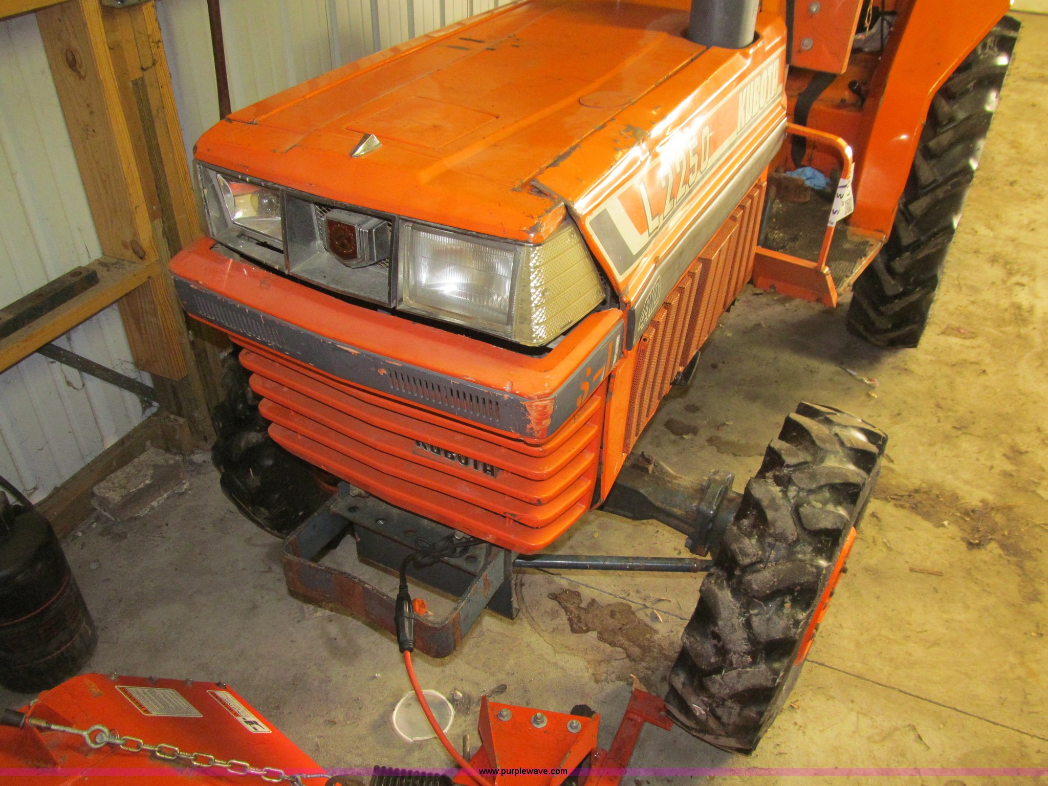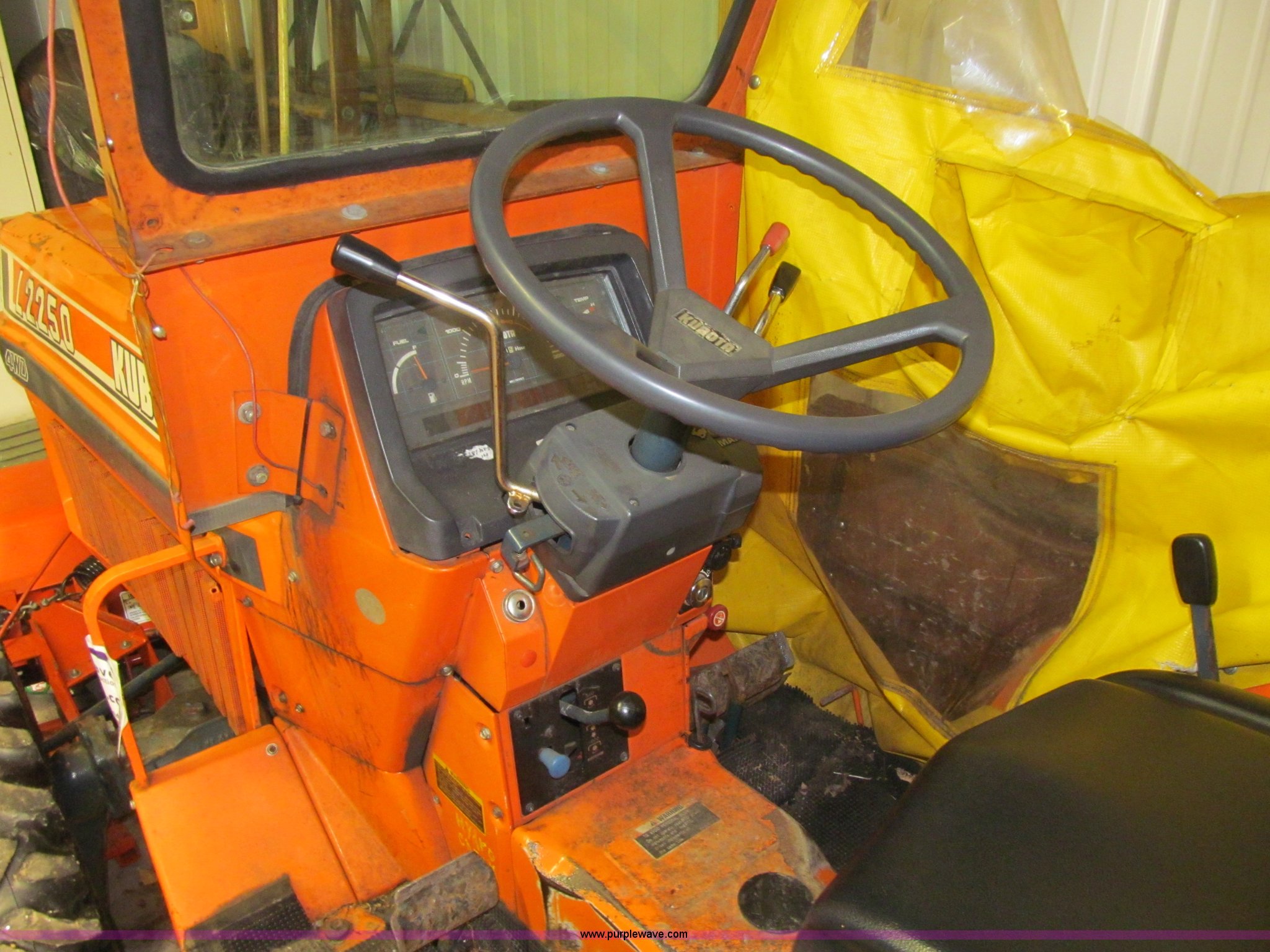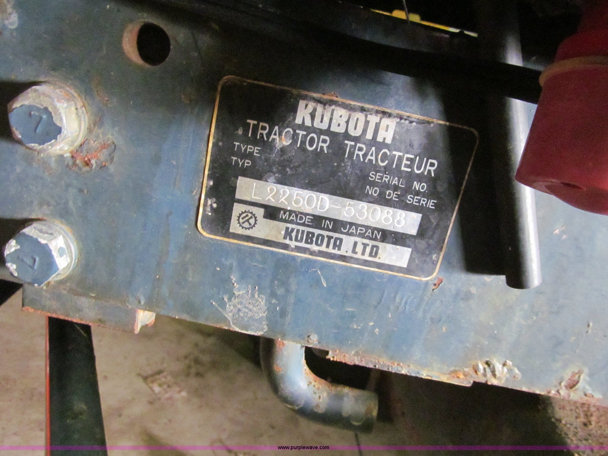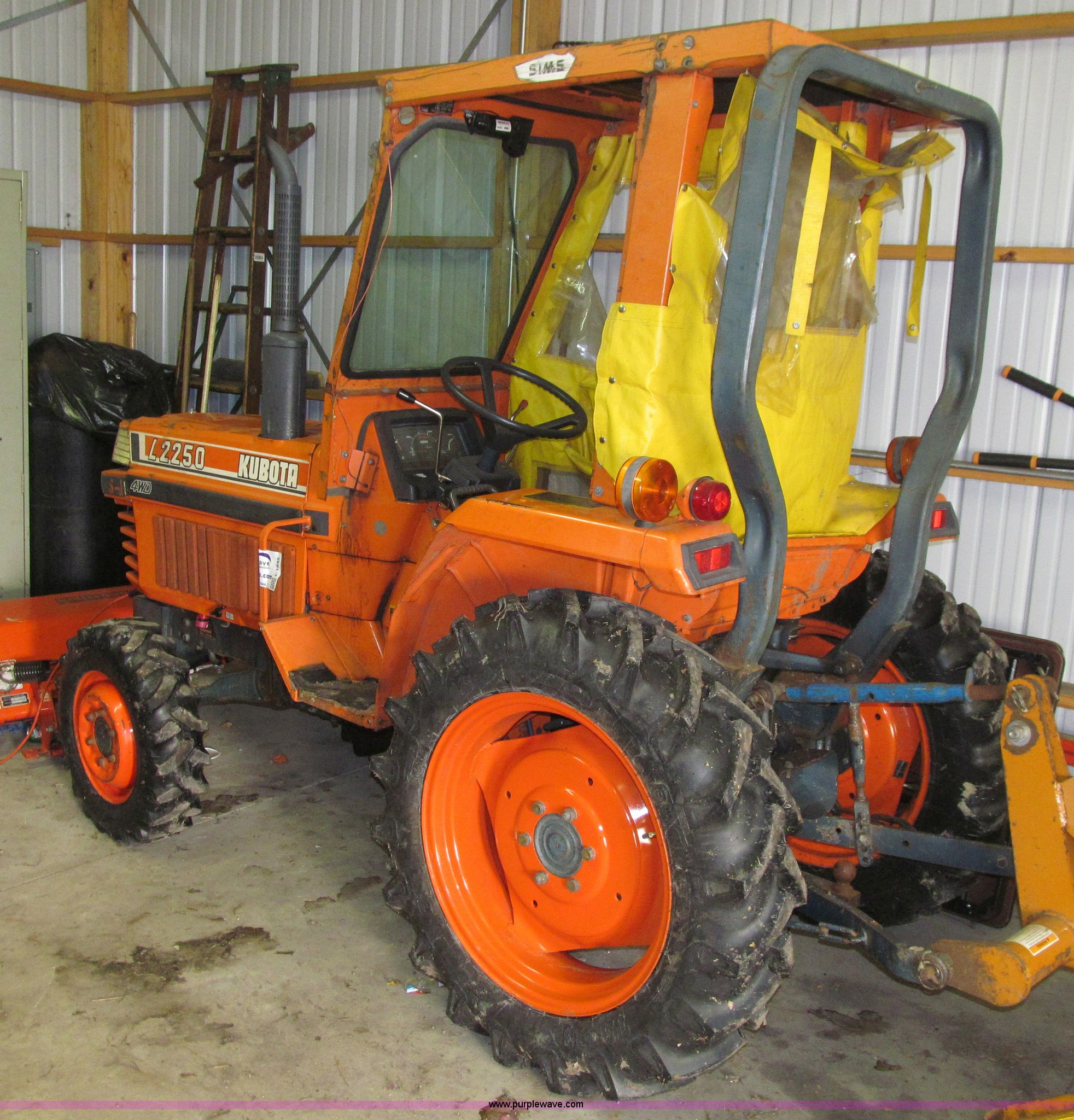 Purple Wave is selling a used Tractor in Iowa. This item is a Kubota L2250 MFWD tractor with the following: 1,631 hours on meter, Kubota D1402-DI-A three cylinder diesel engine, Mechanical shuttle transmission, 8F-7R gears, Differential lock, Spring suspension seat, Three point, Draw bar, 540 PTO, 7.7 gallon fuel tank, 65" wheelbase, 4.00-15 front tires, 9.5-24 rear tires, Serial L2250D-53088