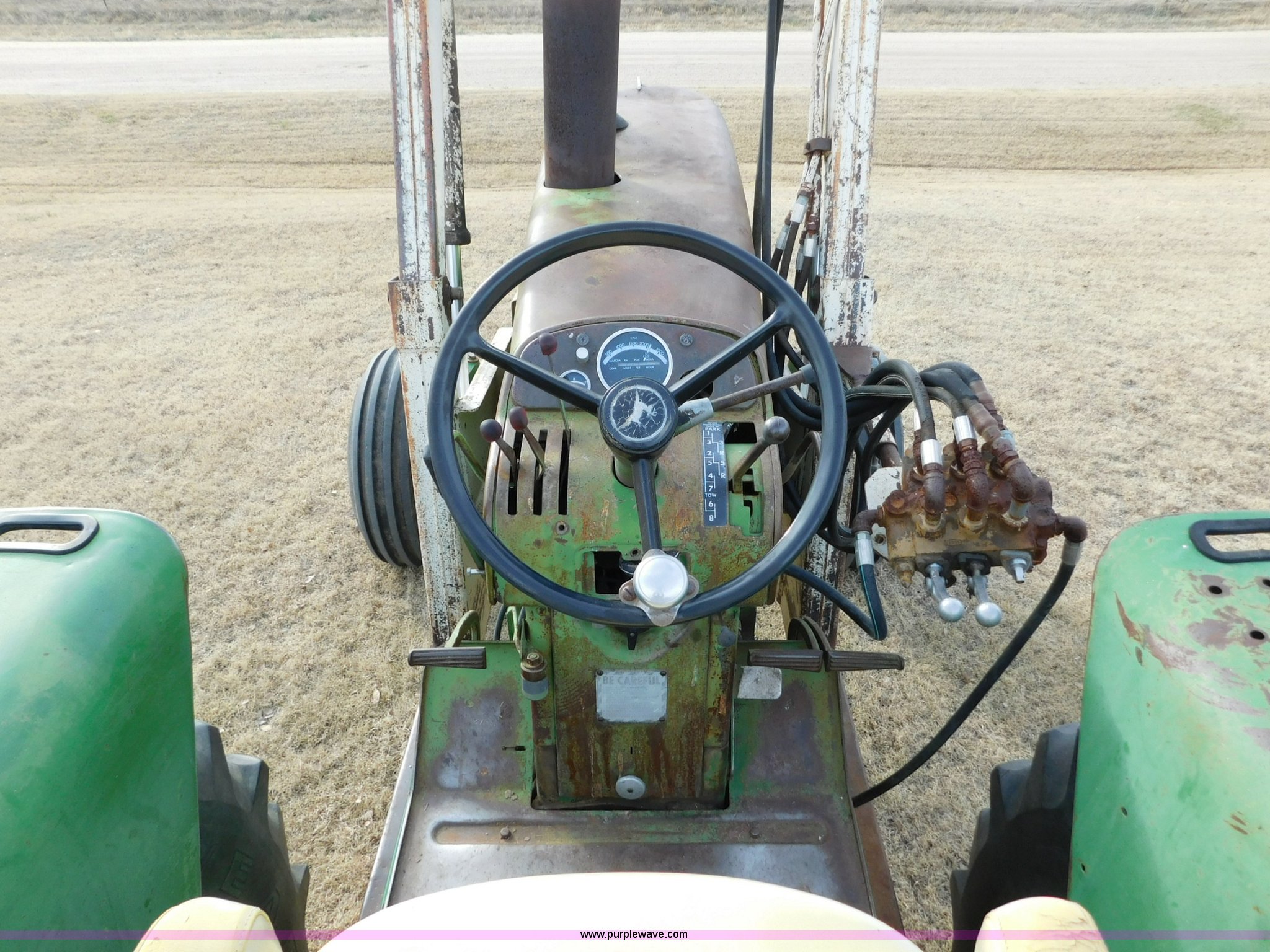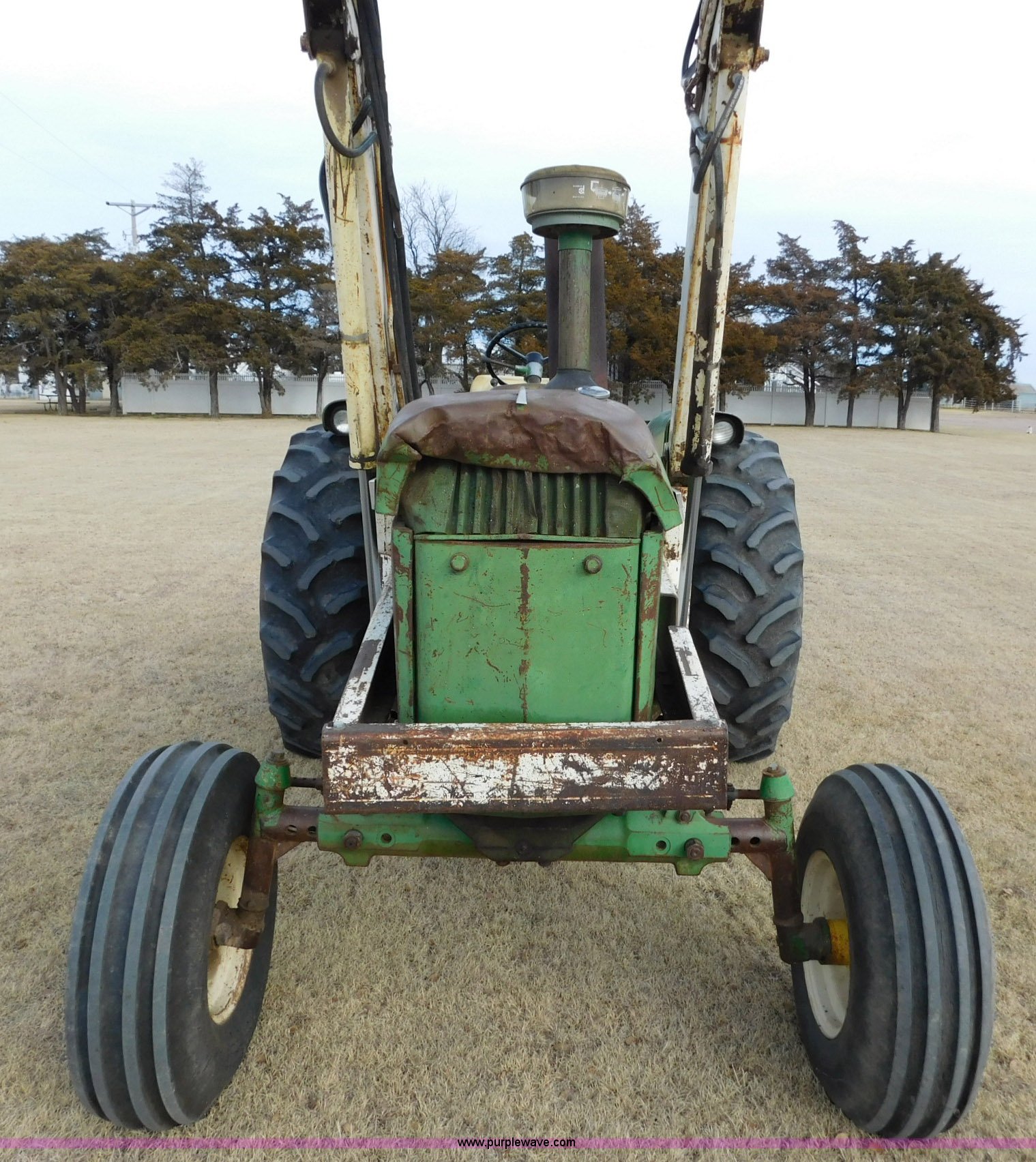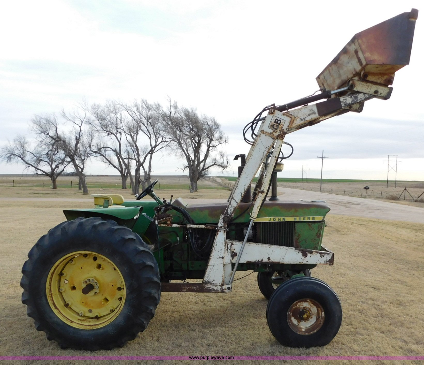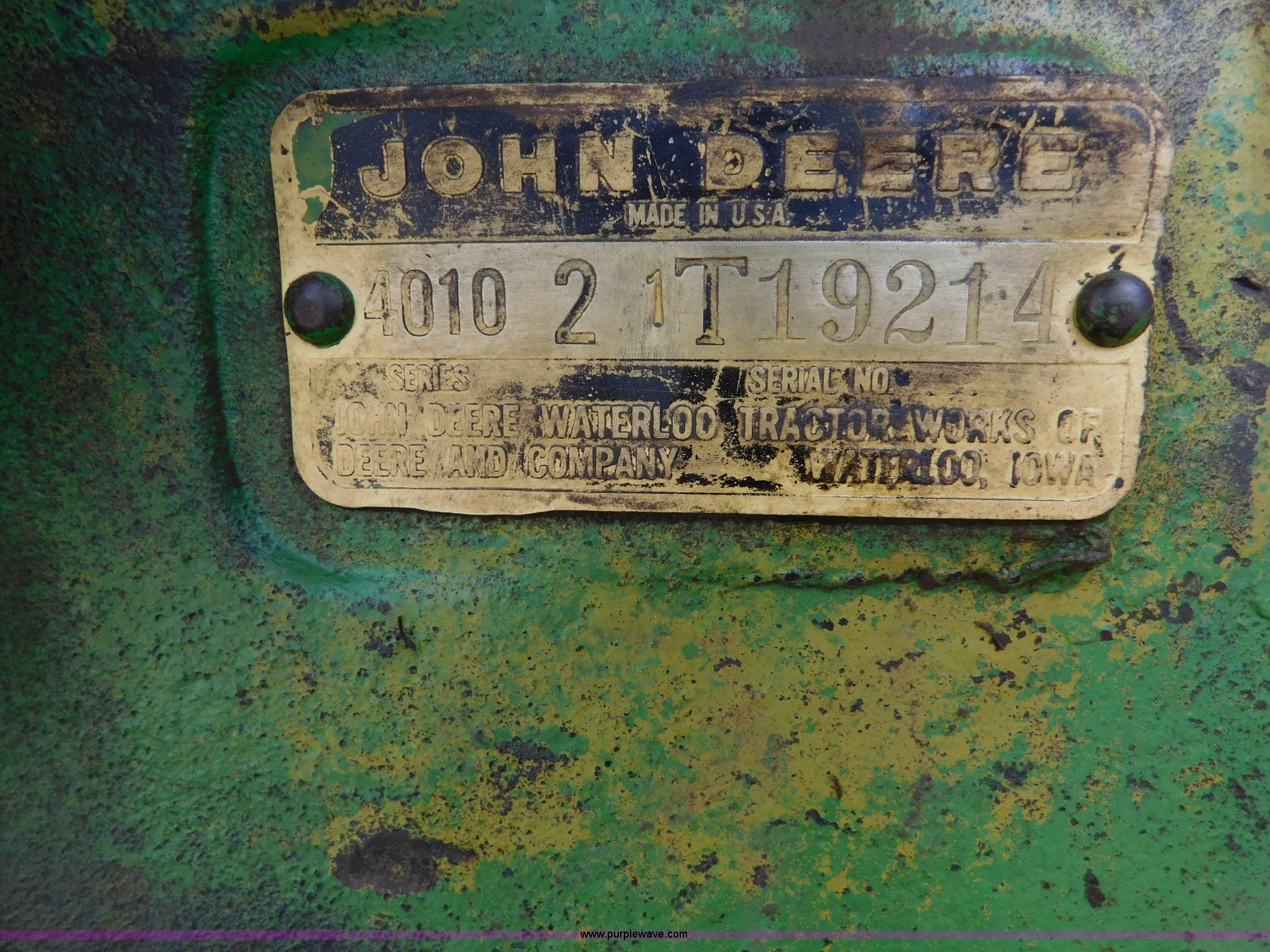 Purple Wave is selling a used Tractor in Kansas. This item is a John Deere 4010 tractor with the following: John Deere six cylinder diesel engine, Manual transmission, 8F-7R gears, Suspension seat, GB loader, 72"W bucket, Two-lever control, Third valve for grapple, Three point, Top link, 540/1000 PTO, Rear hydraulic remote sets, 101" wheelbase, 10.00-16 front tires, 18.4-34 rear tires, Converted from 24V to 12V, Recently replaced battery, Fuel gauge is not installed, Generator replaced with alternator, Hydraulic pump ticks when cold, Nose damage, Rust, Serial 21T19214