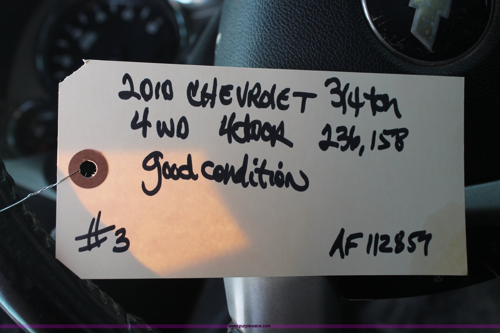 Purple Wave is selling a used 3/4 or 1 Ton Pickup or Van in Texas. This item is a 2010 Chevrolet Silverado 2500HD Crew Cab pickup truck with the following: 236,158 miles on odometer, 6.0L V8 OHV 16V FFV gas engine, Automatic transmission, Four wheel drive, AC and heat, Tilt, Cruise, AM/FM/CD, Power windows, locks, and seat, Cloth interior, Front tow hooks, Receiver hitch, Trailer wiring, 265/70R17 tires, Seat torn