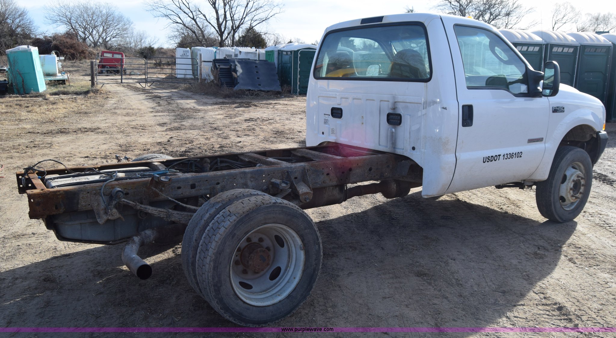 Purple Wave is selling a used Truck Chassis in Kansas. This item is a 2004 Ford F450 Super Duty truck chassis with the following: 117,286 miles on odometer, 6.0L V8 OHV 32V turbo diesel engine, Automatic transmission, AC and heat, AM/FM, Manual windows and locks, Vinyl interior, Block heater, Front tow hooks, Trailer wiring, 9.5' from cab to end of chassis, 225/70R19.5 tires