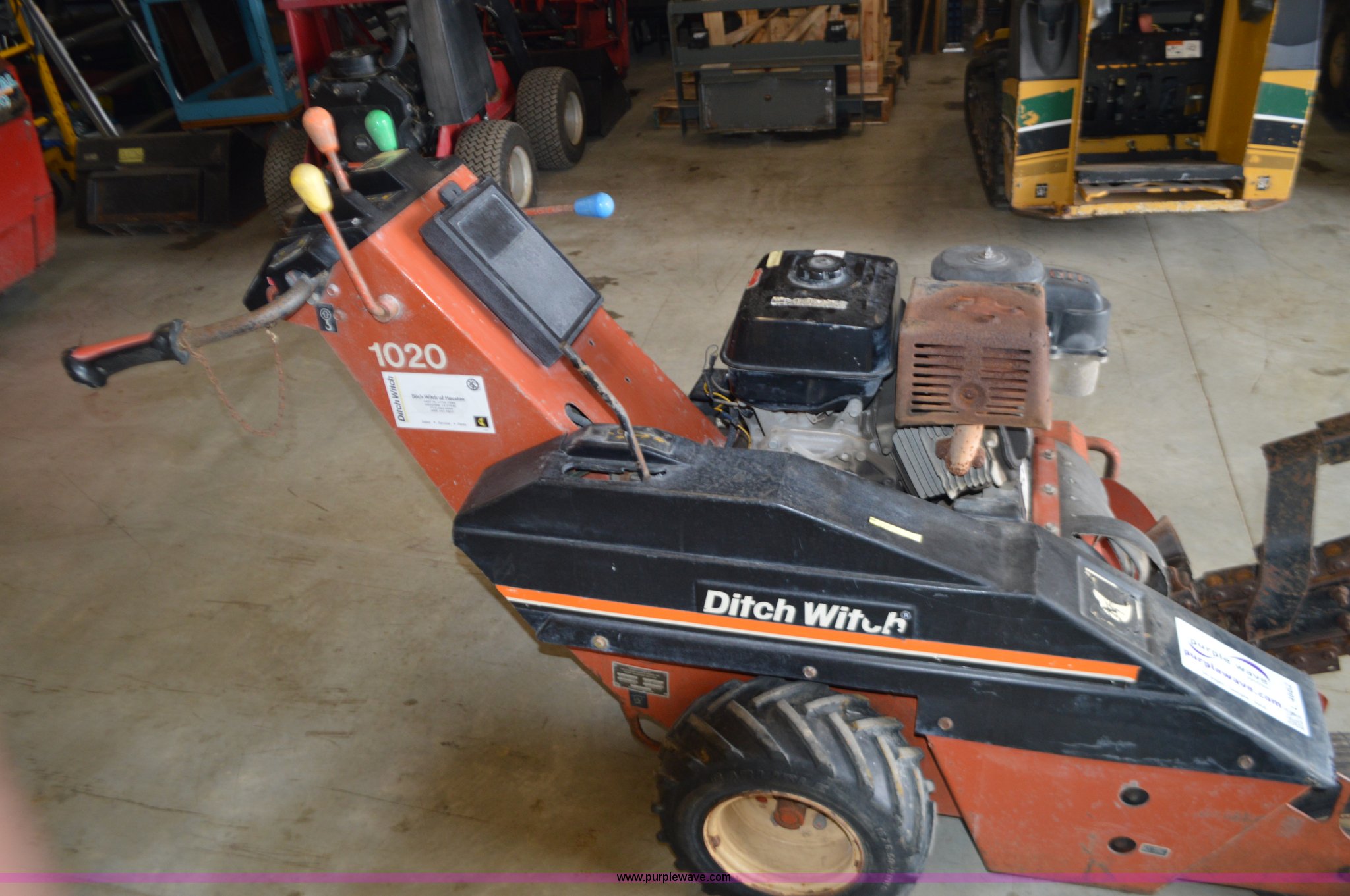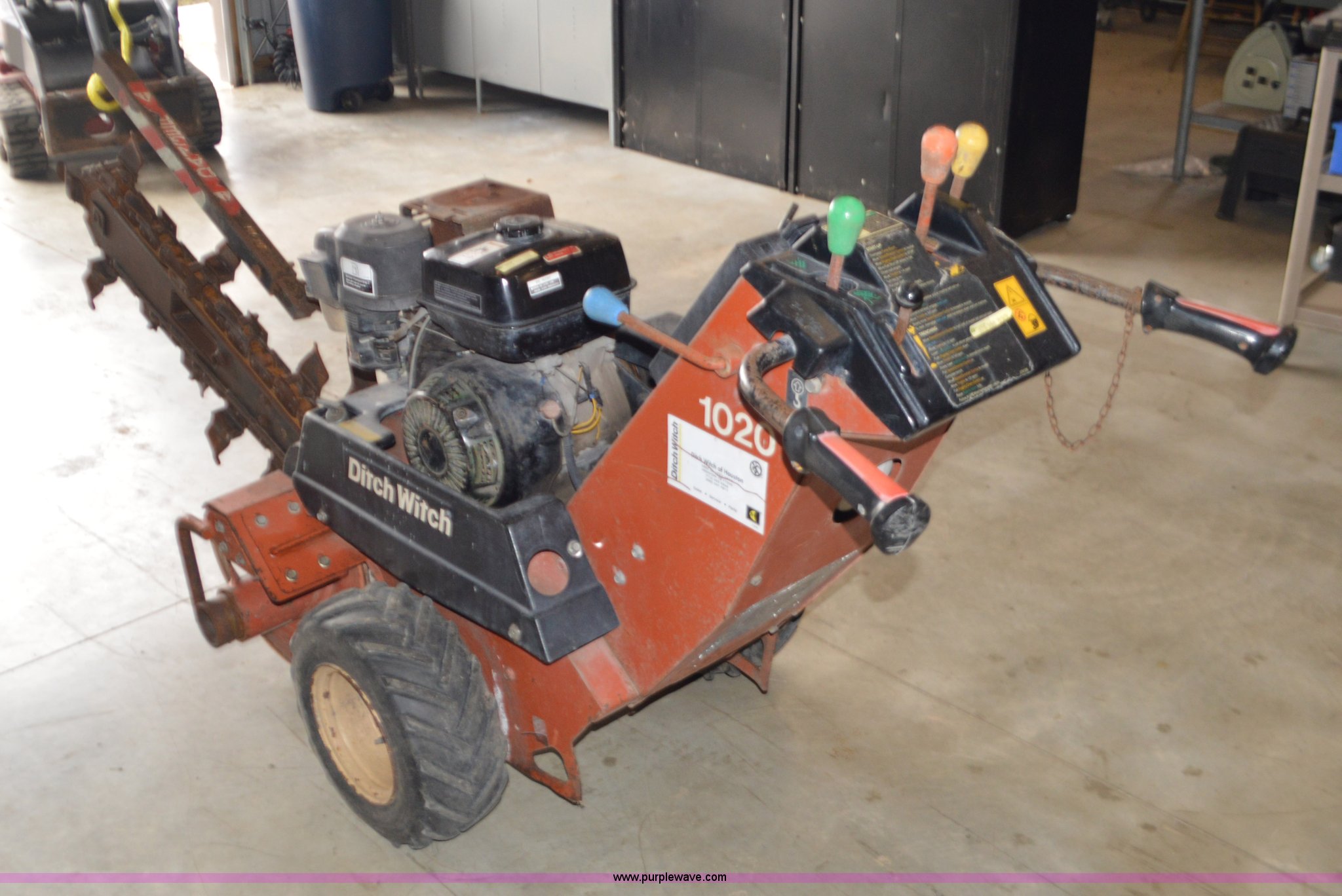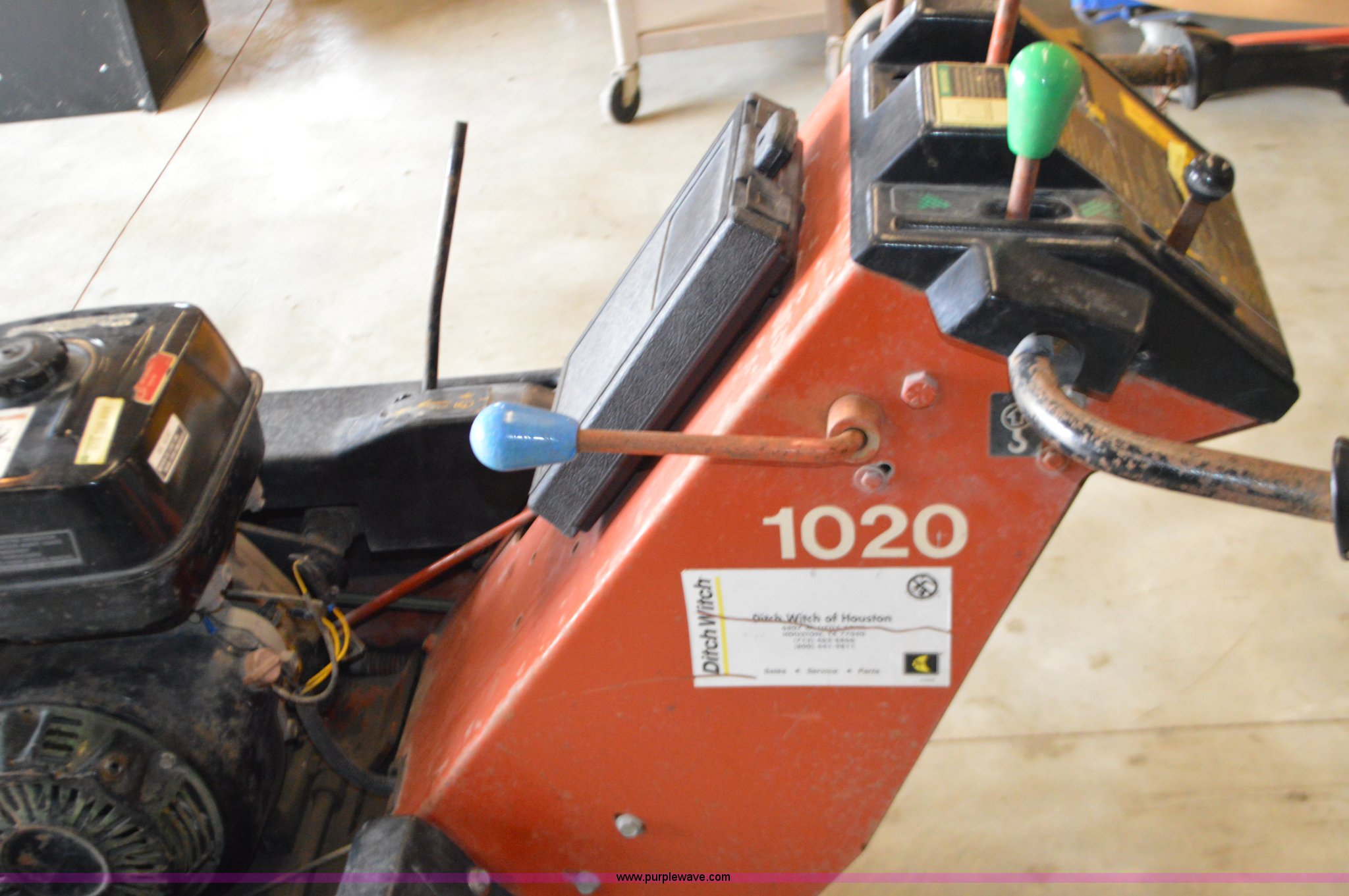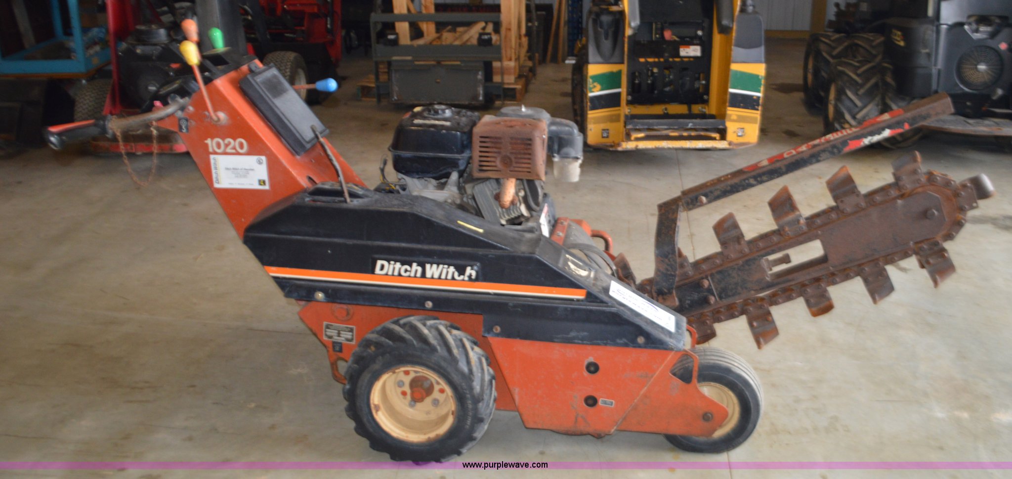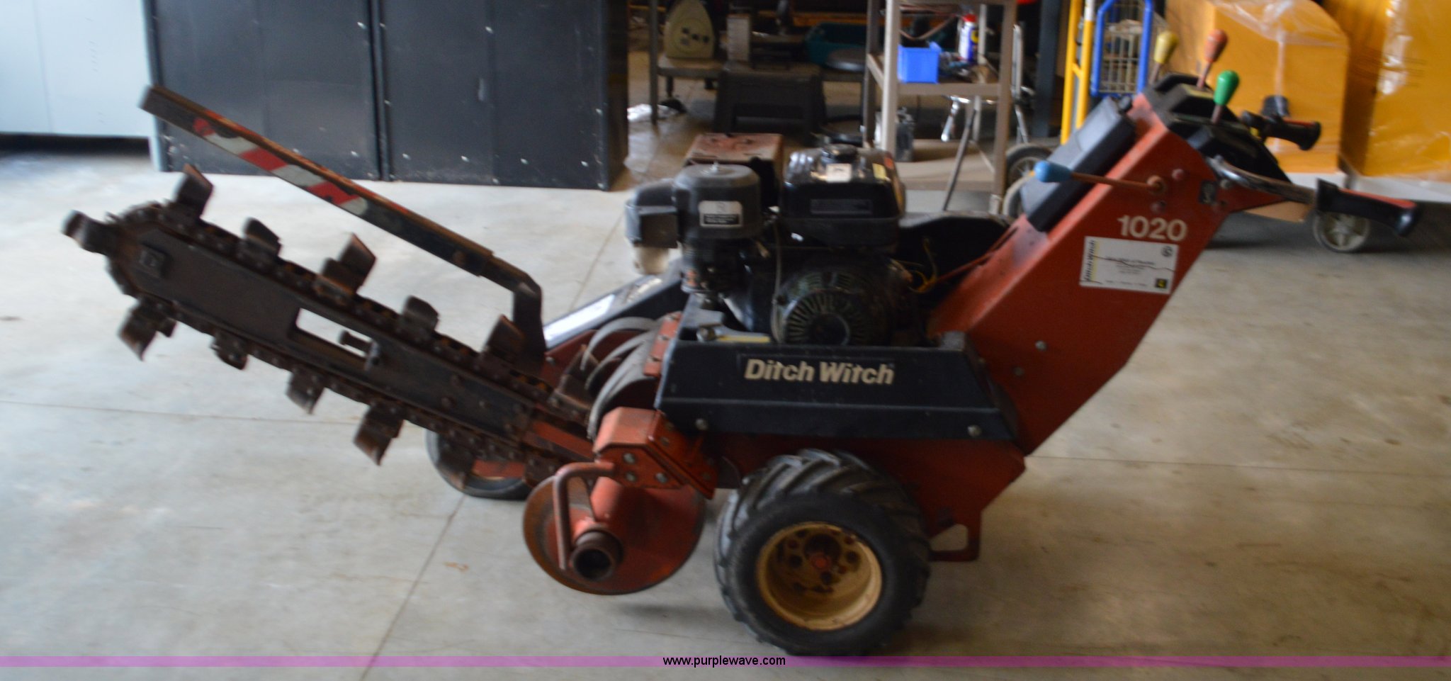 Purple Wave is selling a used Trencher or Rock Saw in Missouri. This item is a Ditch Witch 1020 walk-behind trencher with the following: Single cylinder gas engine, Hydrostatic transmission, 3.5' trench bar, 6" trench width, 13x5x6 front tire, 18x6.50-8 rear tires, Serial 1P1443