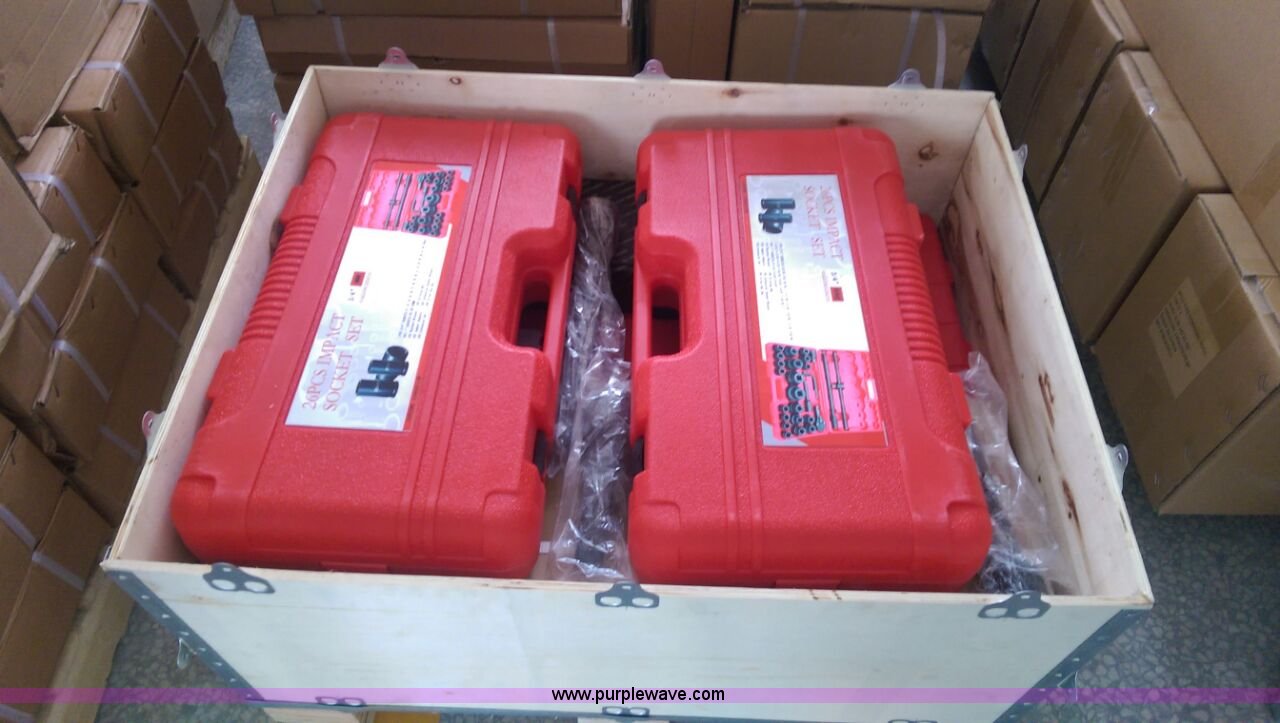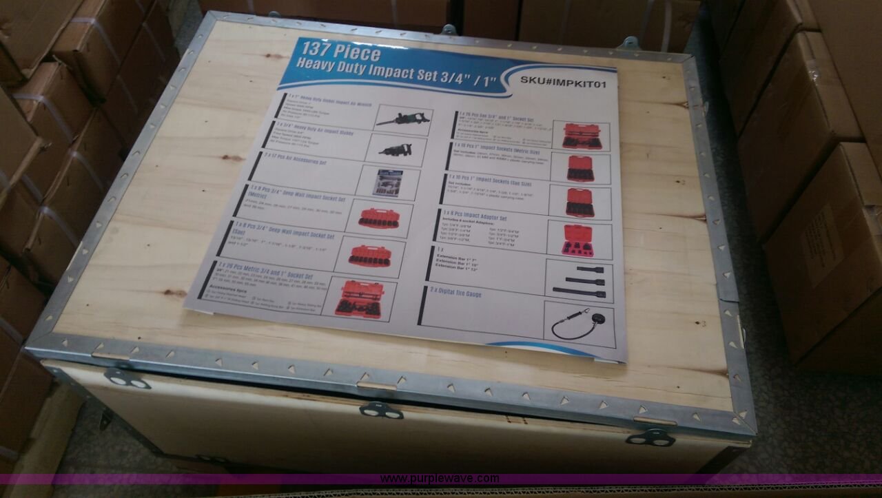 Purple Wave is selling a used Tools in Minnesota. This item is a (137) piece impact set with the following: Torque wrench, 1" chuck, 4,000 RPM, 1,843 lbs torque, Stubby impact wrench, 3/4" chuck, 1,327 lbs torque, 3,900 RPM, (8) piece 3/4" deep wall impact set, 21 mm, 24 mm, 26mm, 27 mm, 29 mm, 30 mm, 32 mm, and 38 mm, (8) piece 3/4" deep wall SAE impact set, 13/16", 15/16", 1 1/16", 1 1/8", 1 3/16", 1 1/4", and 1 1/2", (10) piece metric 1" socket set, 24 mm, 27 mm, 30 mm, 34 mm, 36 mm, 38 mm, 41 mm, and 46 mm, (10) piece SAE 1" socket set, 1 5/16", 1 1/16", 1 3/16", 1 1/4", 1 1/2", 1 9/16", 1 5/8", 1 3/4", 1 13/16", (3) extension bars, 1" chuck, 7", 10", and 13", Two piece digital tire gauge, (26) piece metric socket set, 3/4" chuck, 21 mm, 22 mm, 23 mm, 24 mm, 26 mm, 27 mm, 28 mm, 29 mm, 30 mm, 31 mm, 32 mm, 34 mm, 36 mm, 38 mm, 41 mm, 46 mm, and 50 mm, 1" chuck, 55 mm, 50 mm, 65 mm,, Ratchet, Bent bar, Heavy sliding bar, 3/4" to 1" sliding head, Force bar, Extension bar, (26) piece SAE socket set, 3/4" chuck, 13/16", 7/8", 15/16", 1 1/16", 1 1/8", 1 3/16", 2", 2 1/4", 1" chuck, 2 1/4", 2 3/8", 2 5/8", Ratchet, Bent bar, Sliding bar, 3/4" to 1" sliding head, Force bar, Extension bar, (8) Piece adapter set, 1/4" male to 3/8" female, 3/8" male to 1/4" female, 3/8" male to 1/2" female, 1/2" male to 3/8" female, 1/2" male to 3/4" female, 3/4" male to 1/2" female, 3/4" male to 1" female, 1" male to 3/4" female, Unused