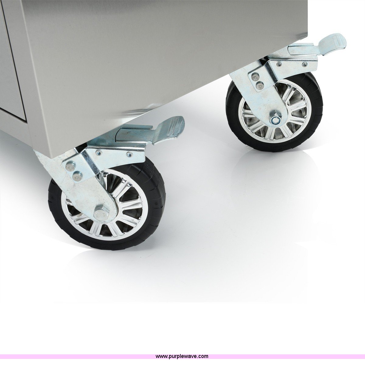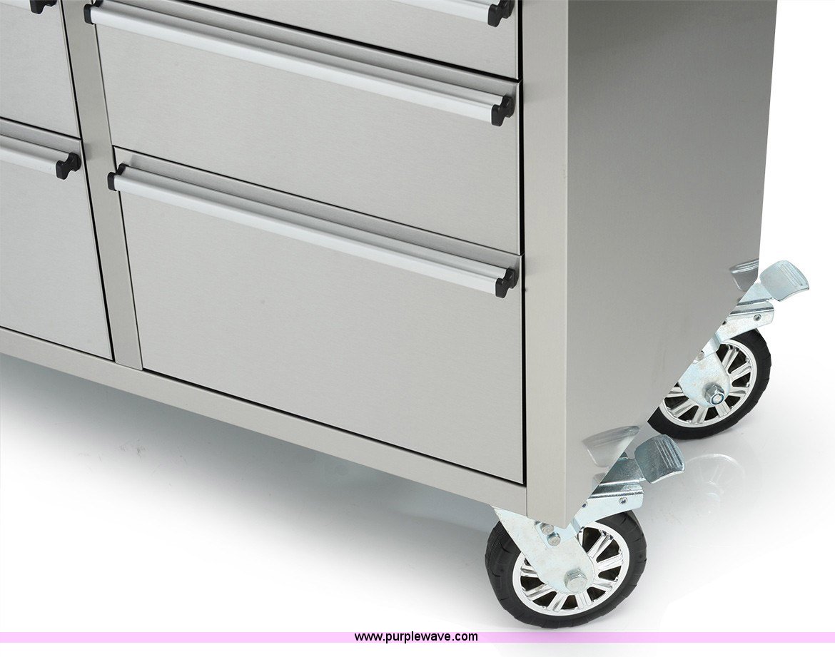 Toolbox. 96"W, (24) drawers Master lock slider drawers, Full extension drawer slides 100 lbs capacity, Full length aluminum drawer pulls, Anti-slip drawer liners, Anti-slip pads, 430 stainless steel construction Anti finger print finish, 1.5" thick hardwood work surface, Dual side handles, 2,400 lbs total capacity, Unused. Seller provided shipping available to a commercial address in the lower 48 states for $235. Optional insurance $25. Representative photo. Canada West Supply. 1100 McKinley Street. Anoka, MN 55303
