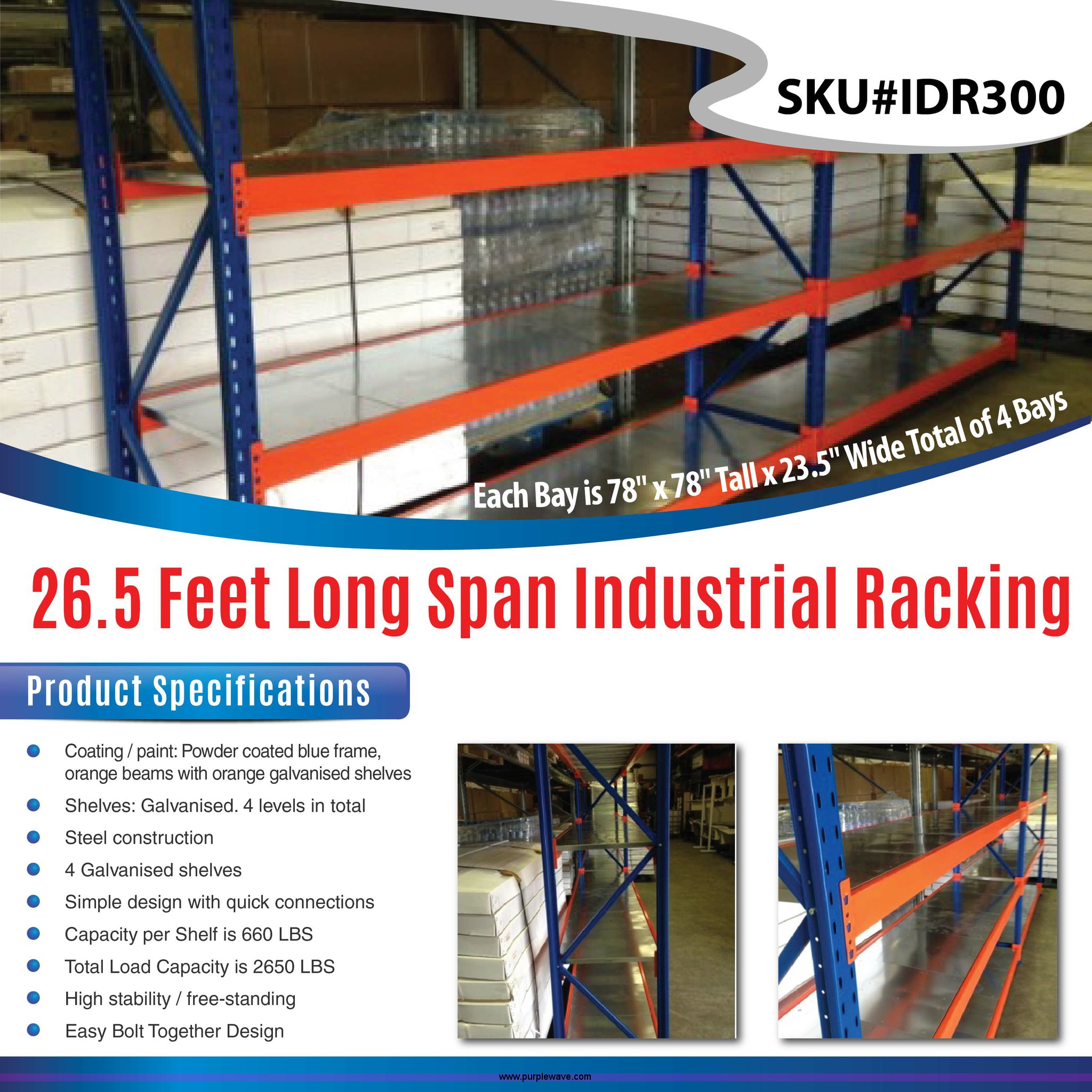 Industrial shelving. 78"L x 23.5"W x 78"H per bay, 26.5 long span of shelving/racking, 2,650 lbs per bay capacity, Easy bolt together design, Epoxy coated, 82x24x33 crate, 580 lbs. Seller shipping available to a commercial address in the lower 48 states for $195.00. Representative photo. Canada West Supply. 1100 McKinley Street. Anoka, MN 55303