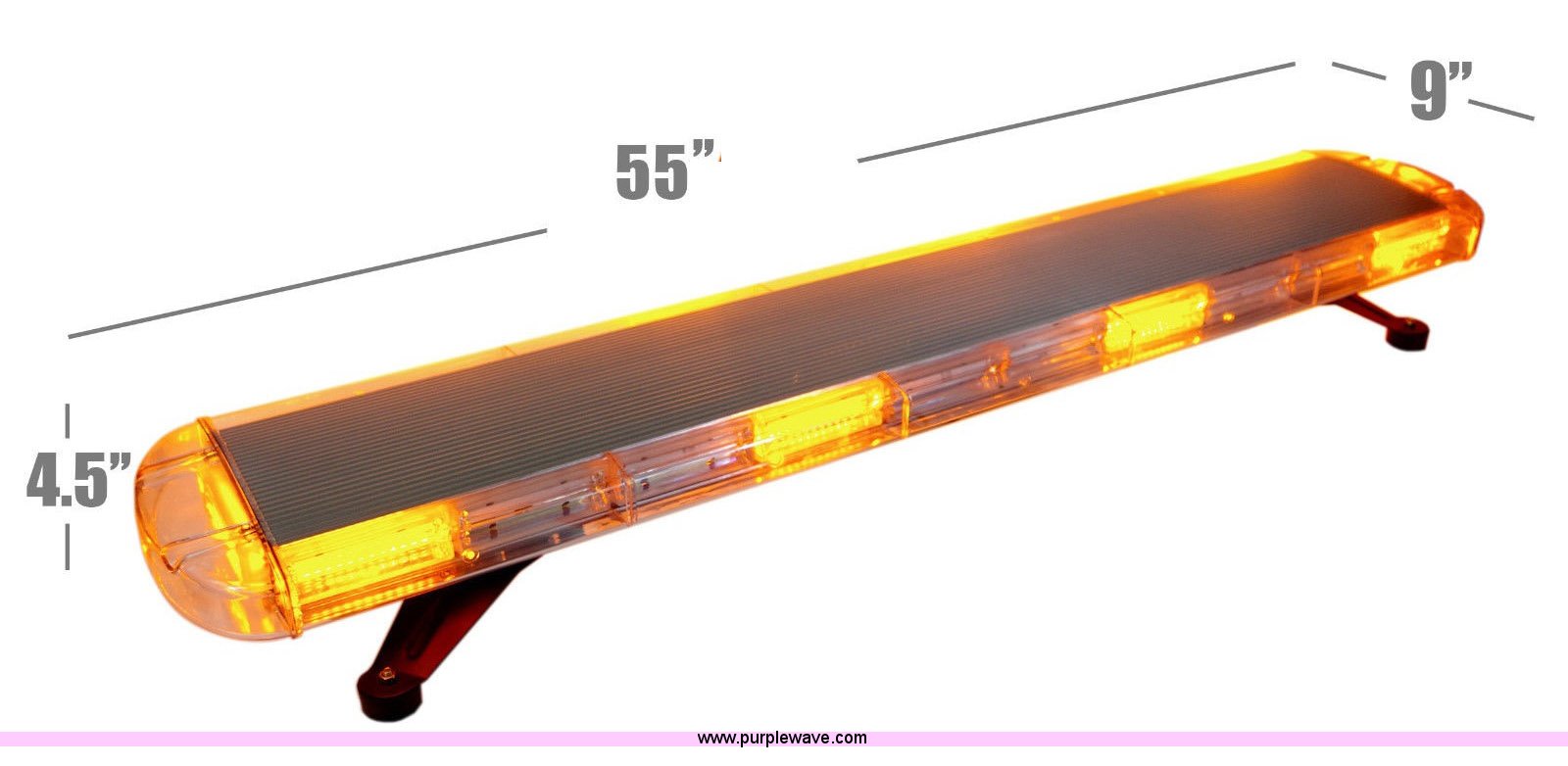 Purple Wave is selling a used Automotive Parts or Acces. in Minnesota. This item is a 55" flashing light bar with the following: Amber 104 LED 55" COB high intensity, 15 modes, Emergency hazard warning flashing car truck construction, LED top roof strobe light bar with mounting base, (88) high intensity LEDs, 12/24V, 55"W x 9"D x 4.55"H panel, 104 watts, IP67 weatherproof, Unused