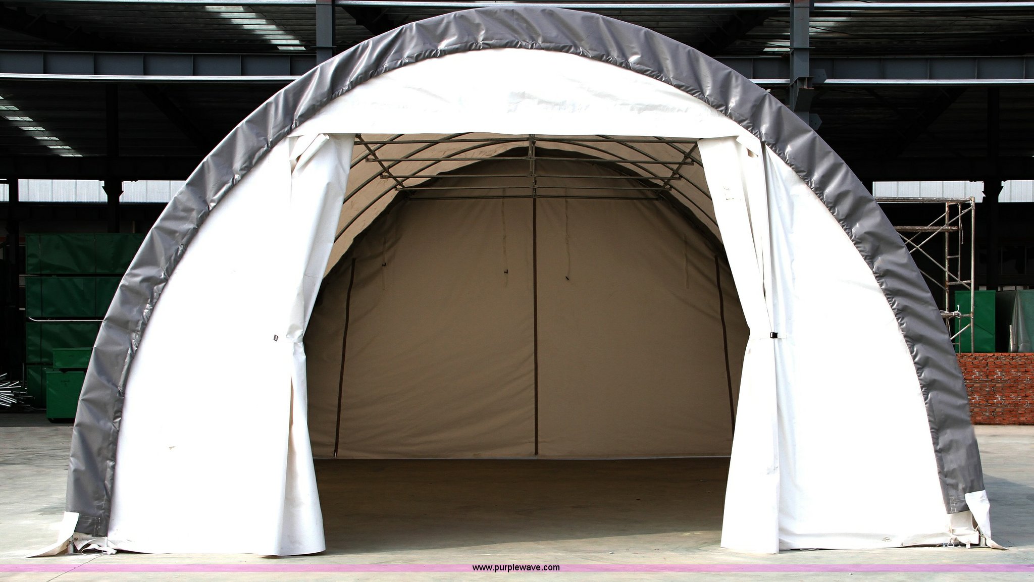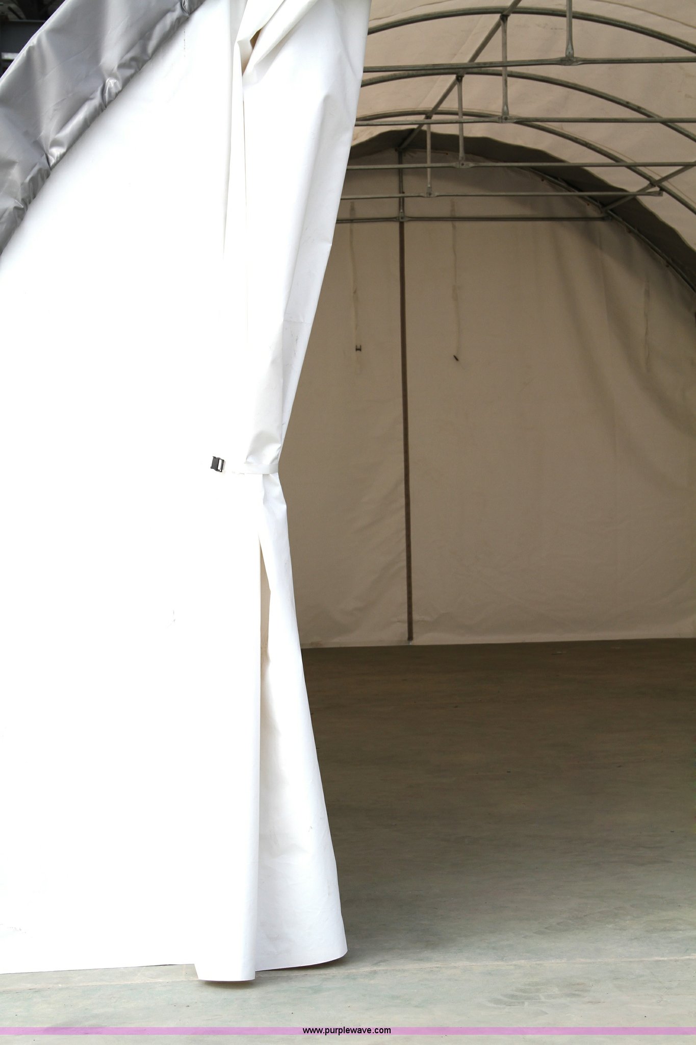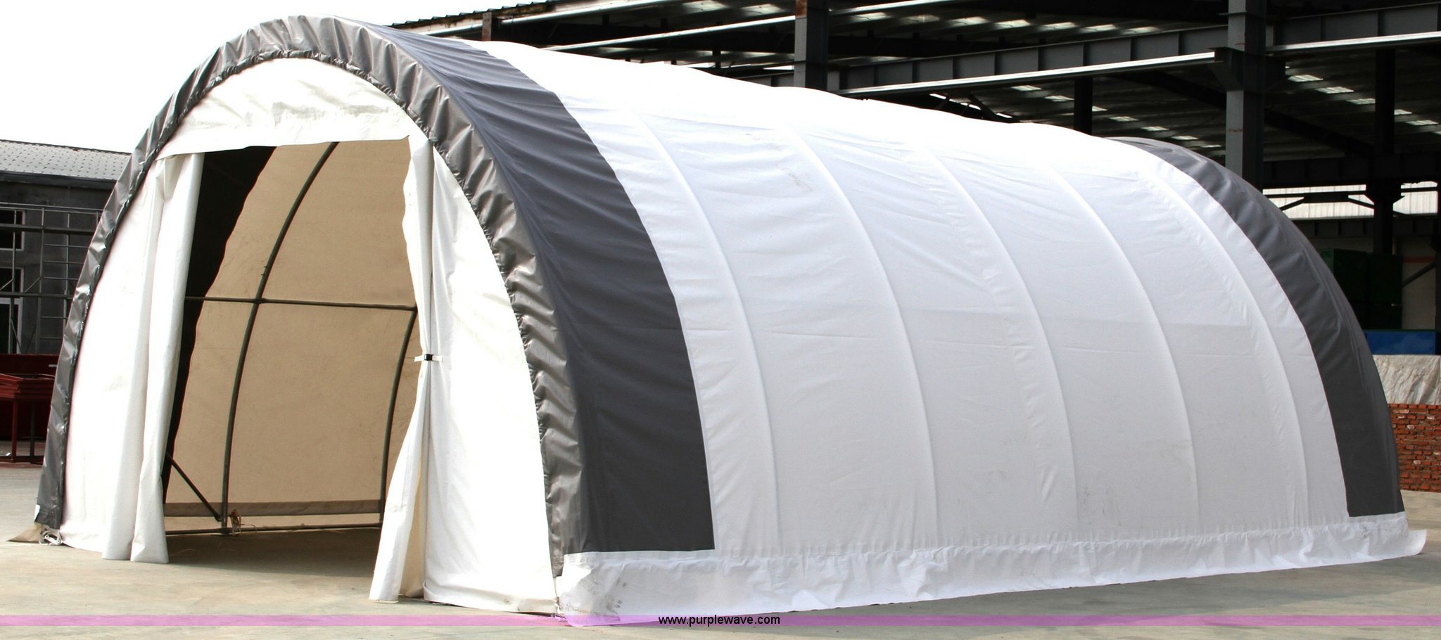 Purple Wave is selling a used Building Materials in Minnesota. This item is a Storage building with the following: 30' x 20' x 12', Curtain front with full zipper back, Galvanized finish, steel frame, Anchoring system, 14.5 oz rip stop PVC fabric cover, Unused, Steel shipping crate 6' x 2' x 2'