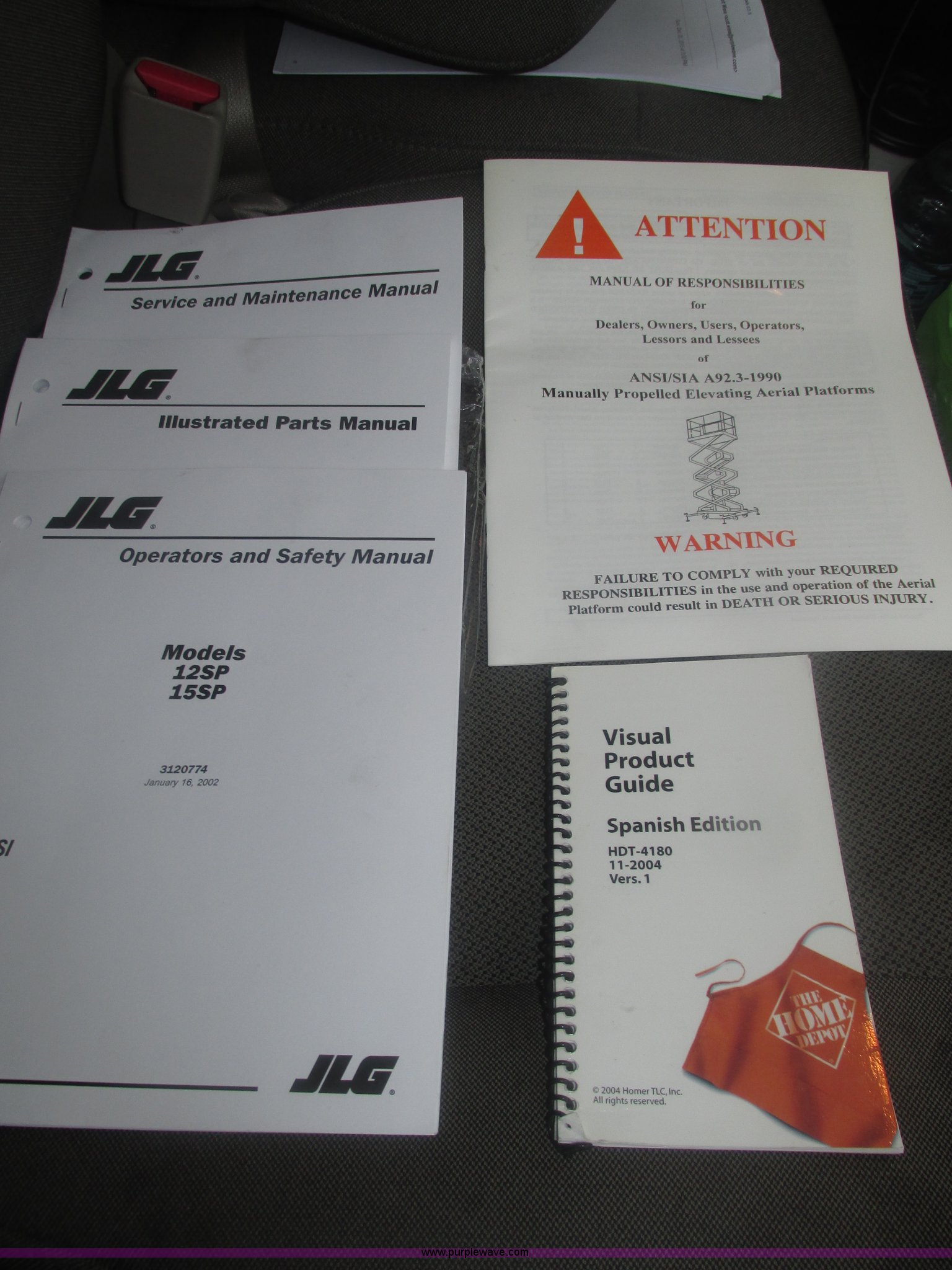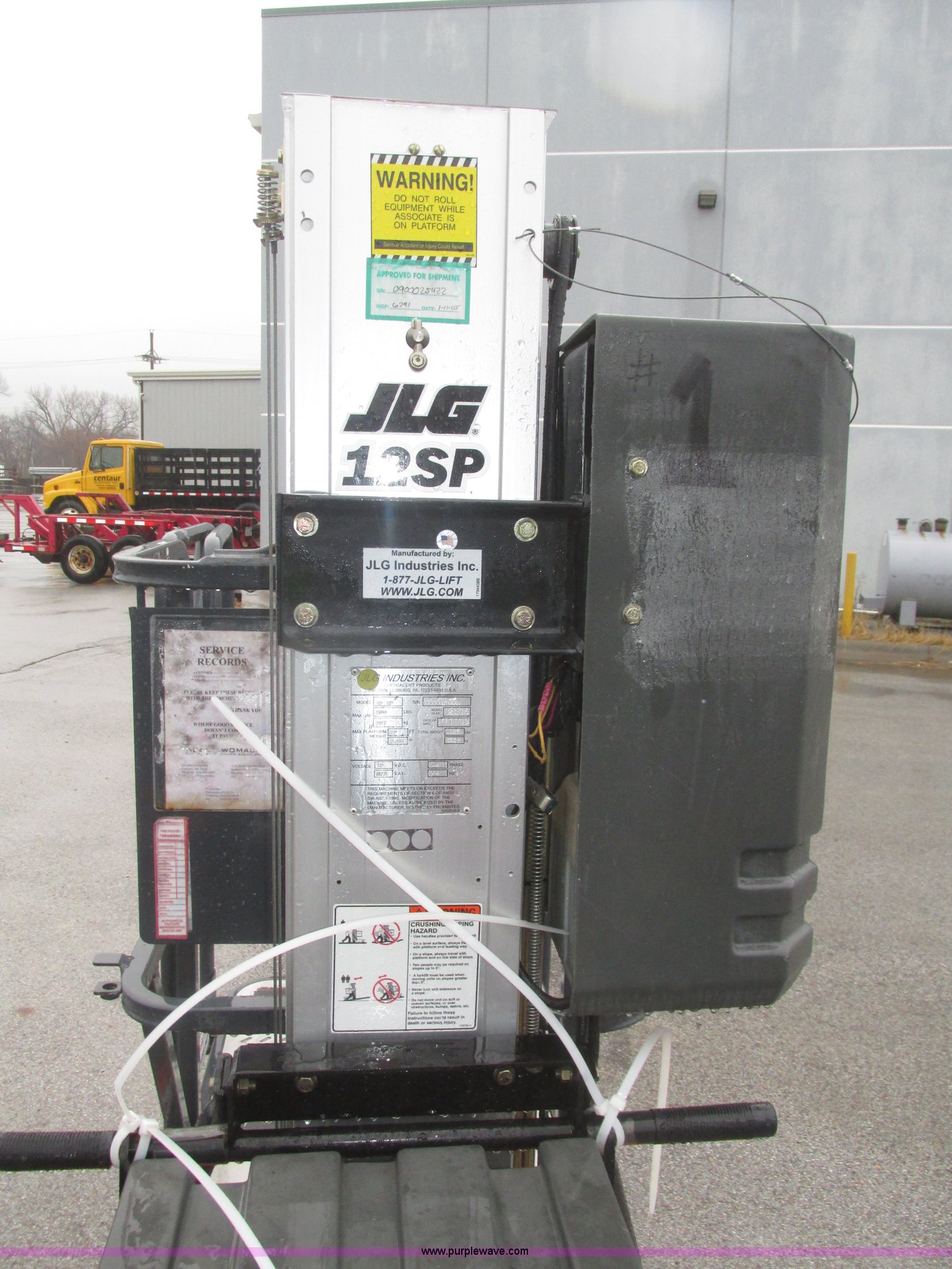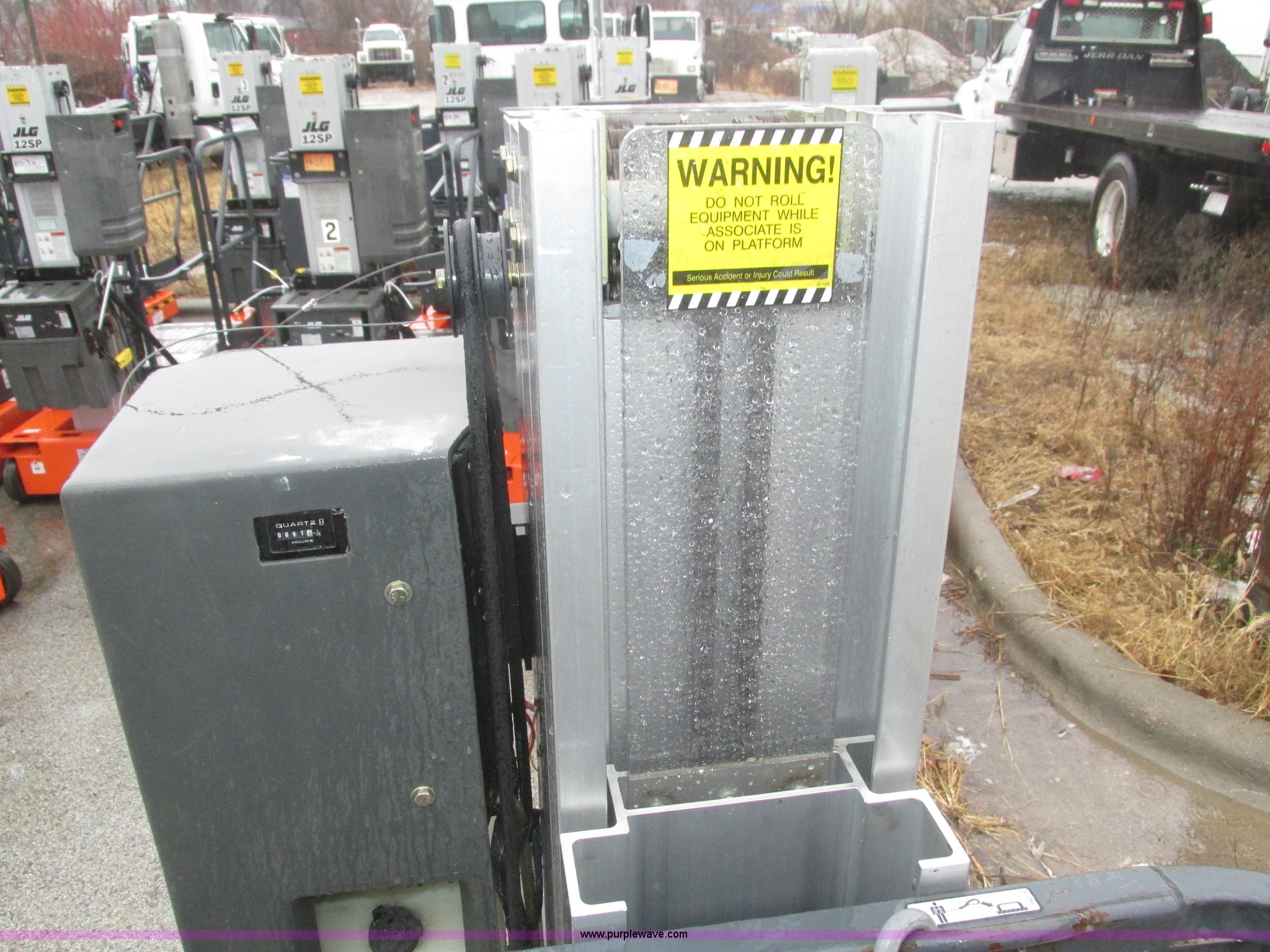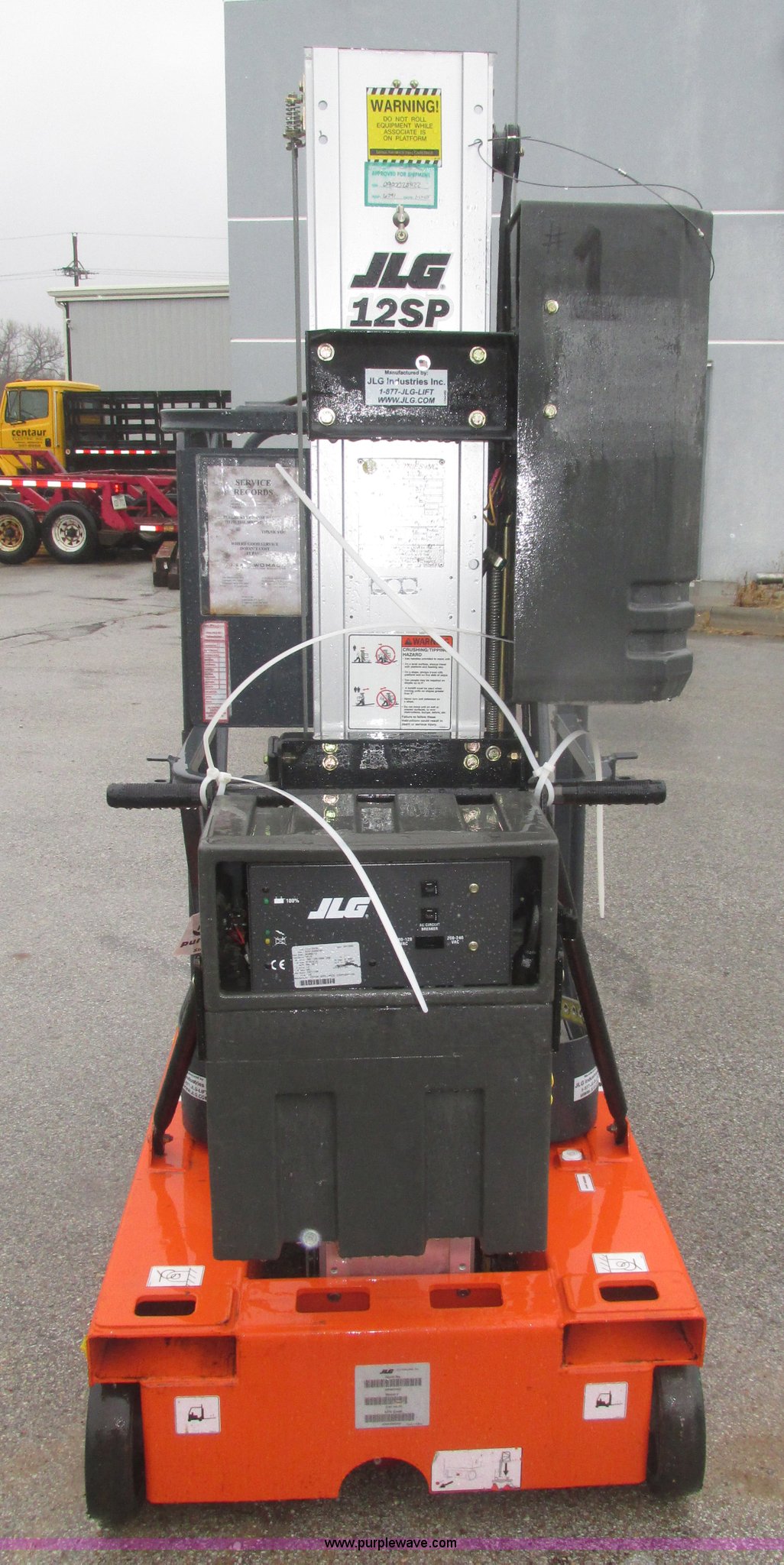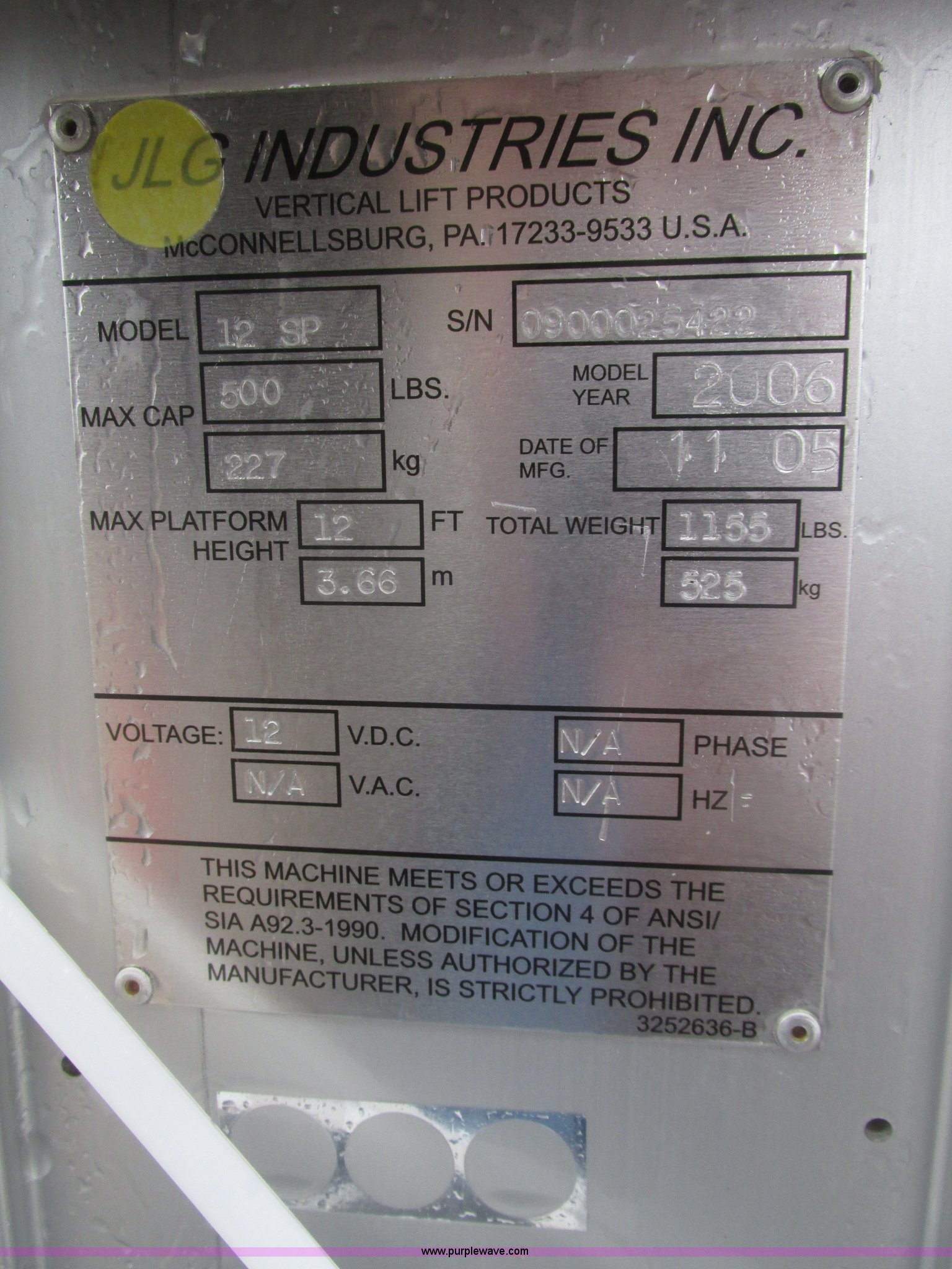 2006 JLG 12SP vertical lift. 91 hours on meter, Electric operation, 500 lbs maximum lift capacity, 12' maximum lift height, 48"L x 28"W platform, 43 3/4"H rails, Extended deck, 77" lowered height, 66"L x 33"W base, Platform controls, Belt and lanyard, Manual emergency lowering valve, 6 x 2 casters, 10 x 2 1/2 rear tires, SCR122097B1 battery charger Serial 14313438, Operators, parts, service, and ANSI manuals, 1,155 lbs tare weight, Serial 0900025422. Jordan Machinery. 6905 N. 94th Plaza. Omaha, NE 68122