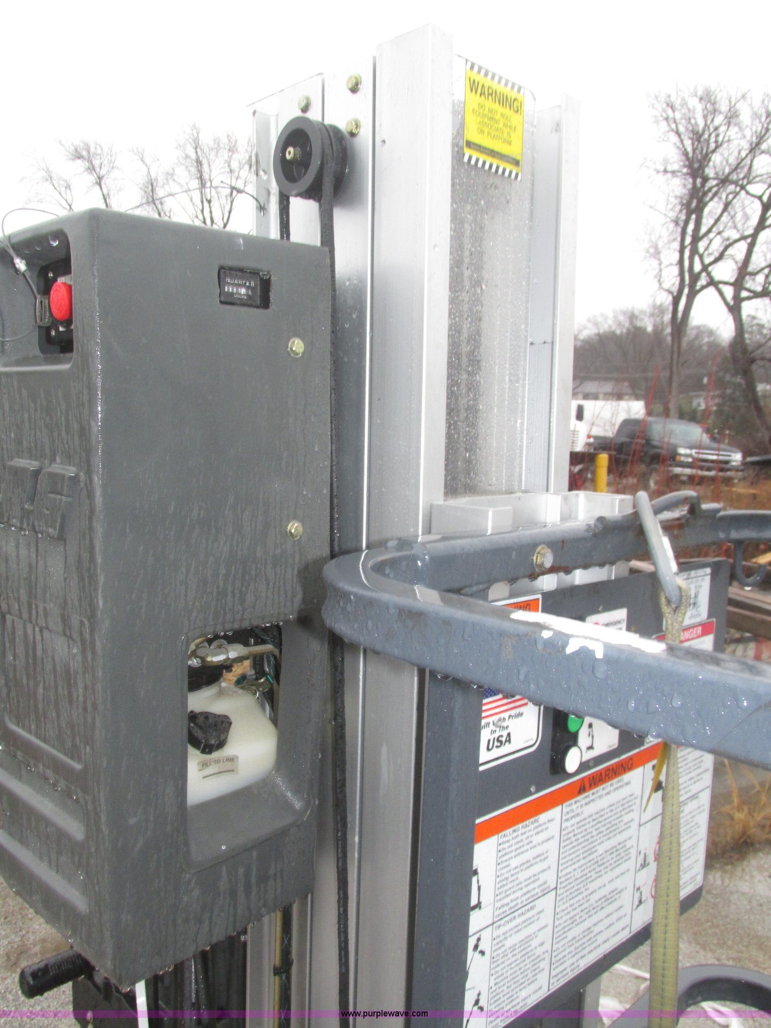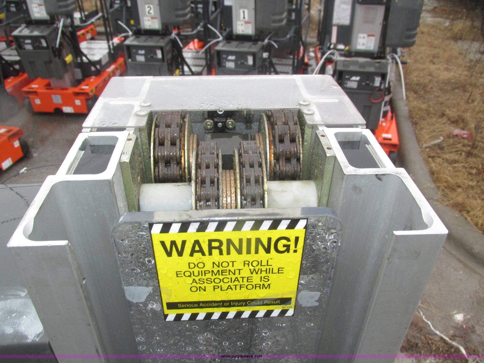 Purple Wave is selling a used Scissor or Vertical Lift in Nebraska. This item is a 2006 JLG 12SP vertical lift with the following: 91 hours on meter, Electric operation, 500 lbs maximum lift capacity, 12' maximum lift height, 48"L x 28"W platform, 43 3/4"H rails, Extended deck, 77" lowered height, 66"L x 33"W base, Platform controls, Belt and lanyard, Manual emergency lowering valve, 6 x 2 casters, 10 x 2 1/2 rear tires, SCR122097B1 battery charger, Serial 14313438, Operators, parts, service, and ANSI manuals, 1,155 lbs tare weight, Serial 0900025422