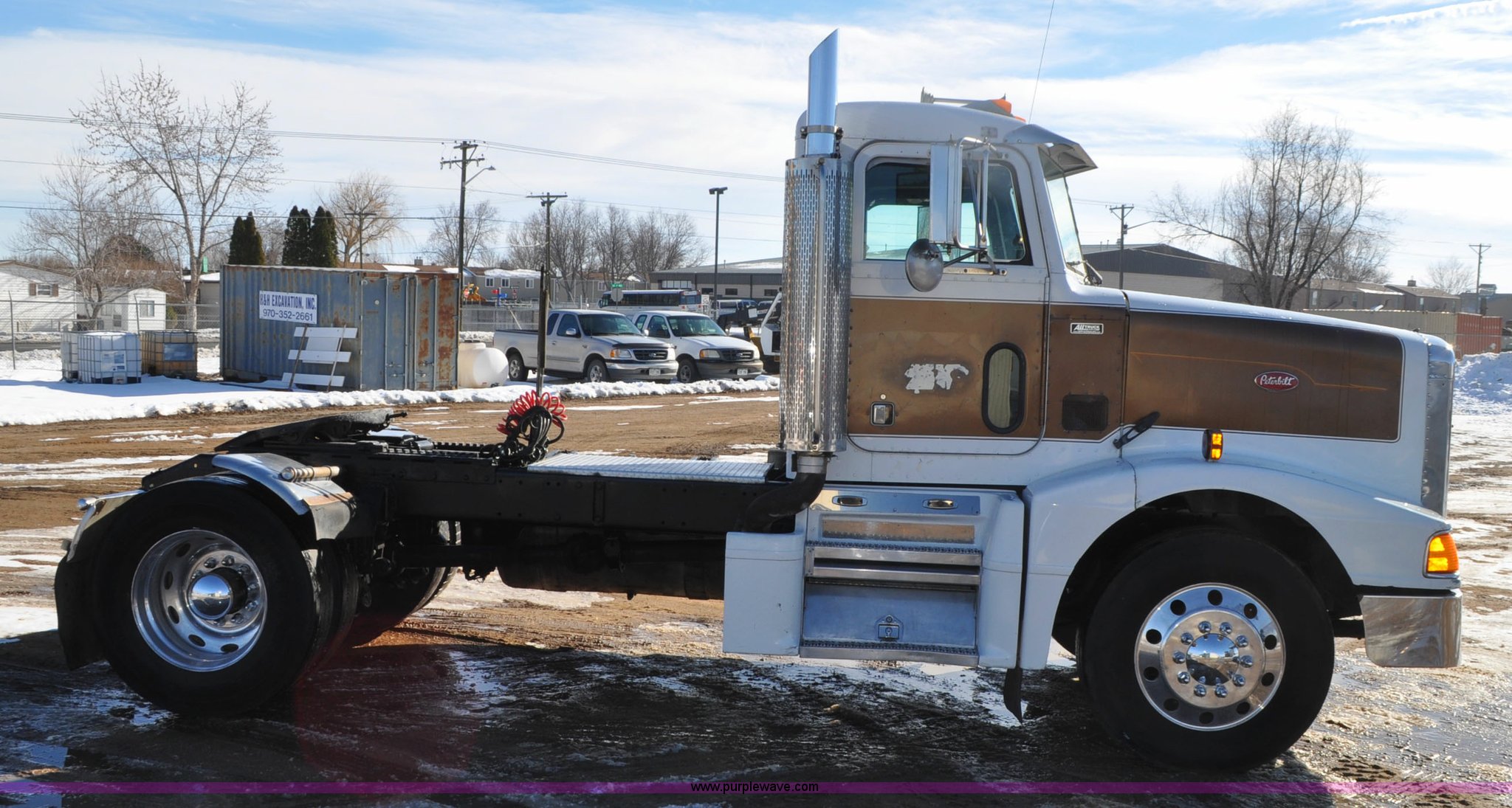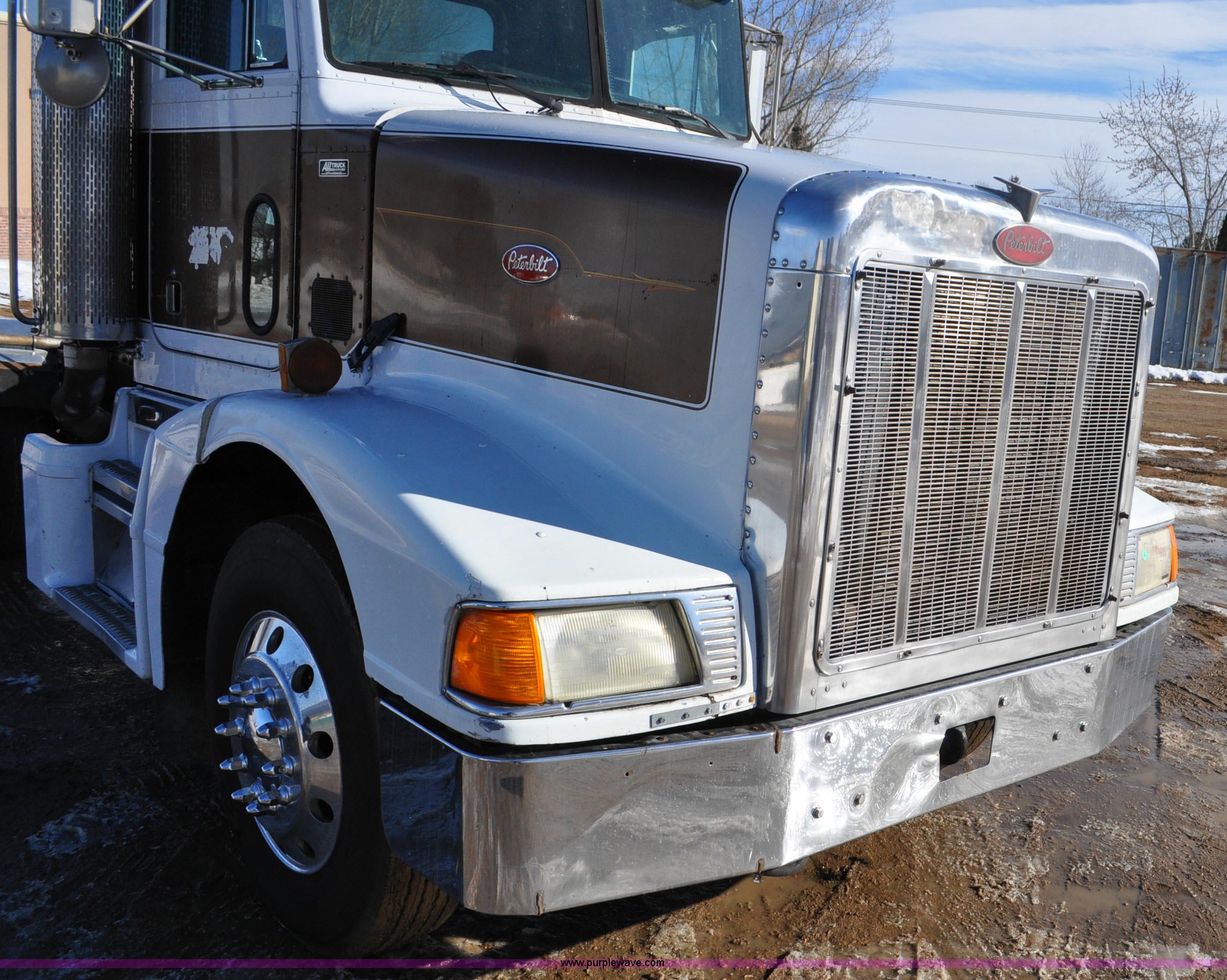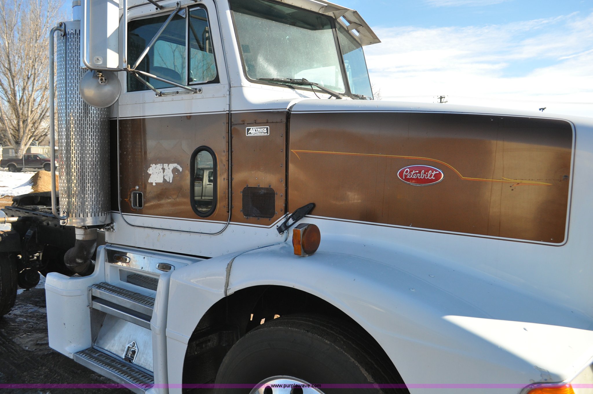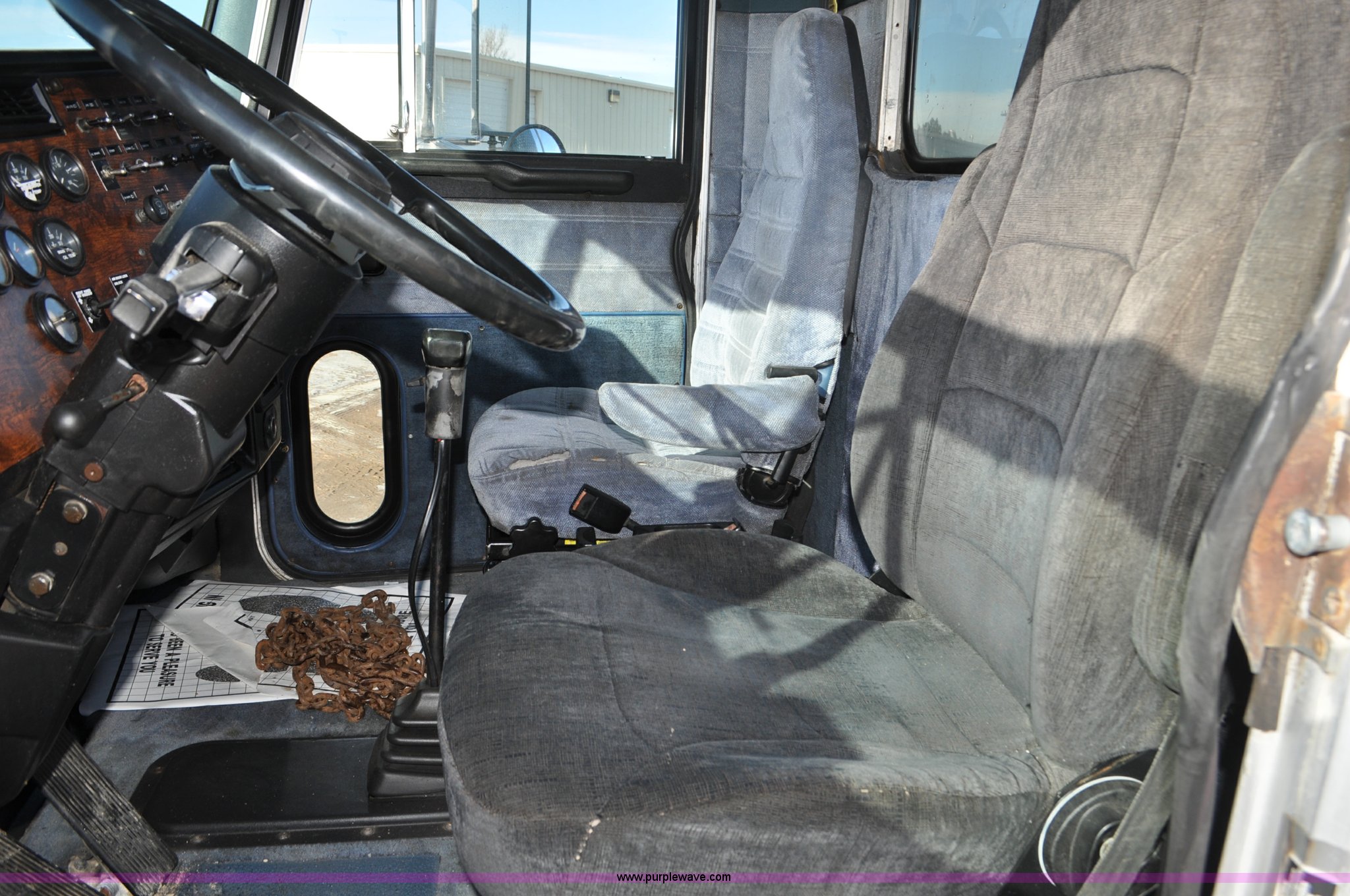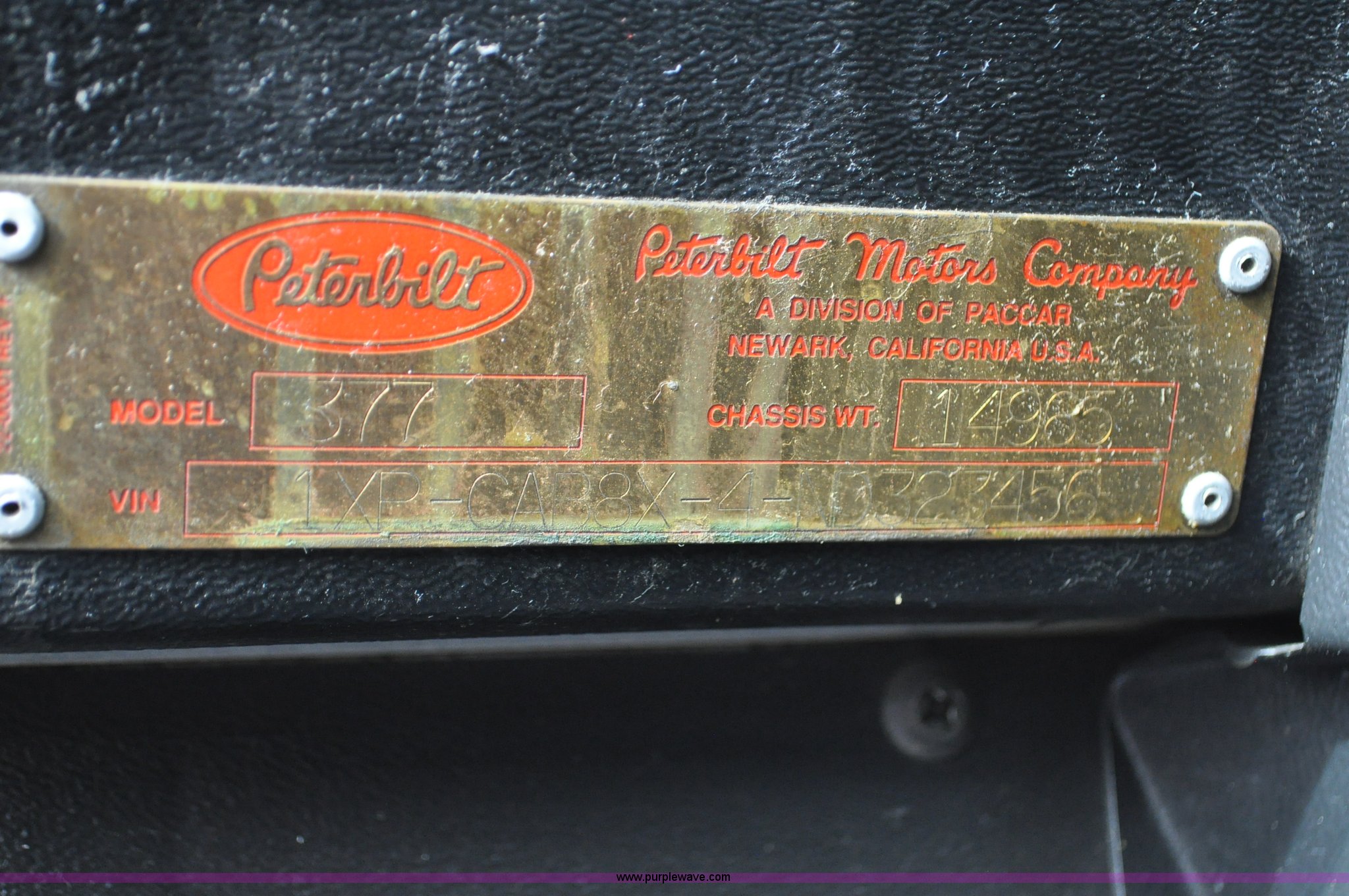 Purple Wave is selling a used Truck Chassis in Colorado. This item is a 1992 Peterbilt 377 truck cab and chassis with the following: 1,197,210 miles on odometer, Caterpillar 3406 14.6L L6 turbo diesel engine, 415 HP, Eaton Fuller eight speed manual transmission, Single axle, Inter-axle differential lock, Heat, Air suspension seat, Dump valves, Front tow hooks, Single rear exhaust stack, Aluminum deck plate, Air operated sliding fifth wheel plate, Stainless steel quarter fenders, Mud flaps, Air suspension, Air brakes, 11R24.5 tires, GVWR 34,700 lbs, FAWR 12,000 lbs, RAWR 22,700 lbs, 174" wheel base, Hood and grill damage