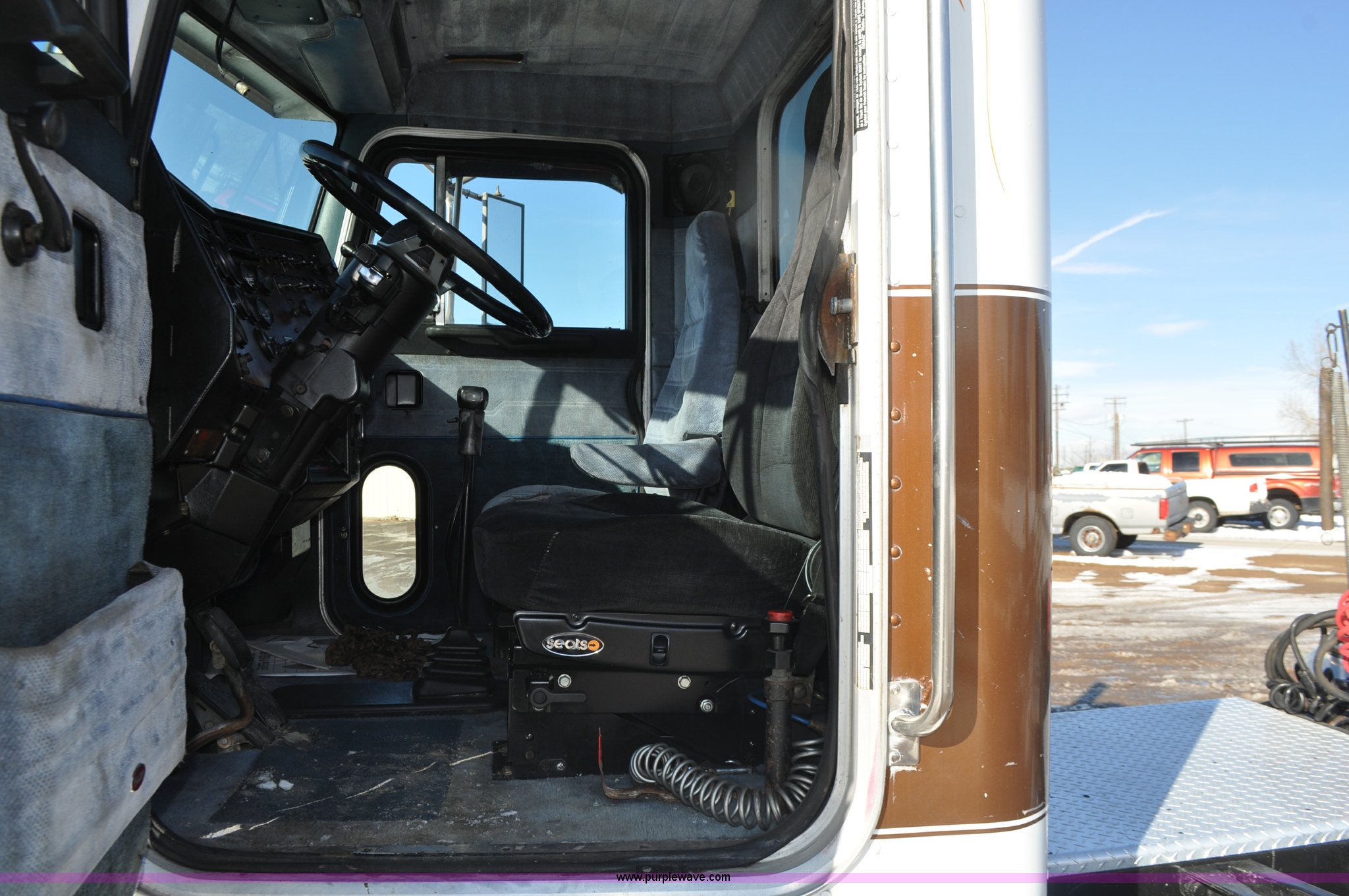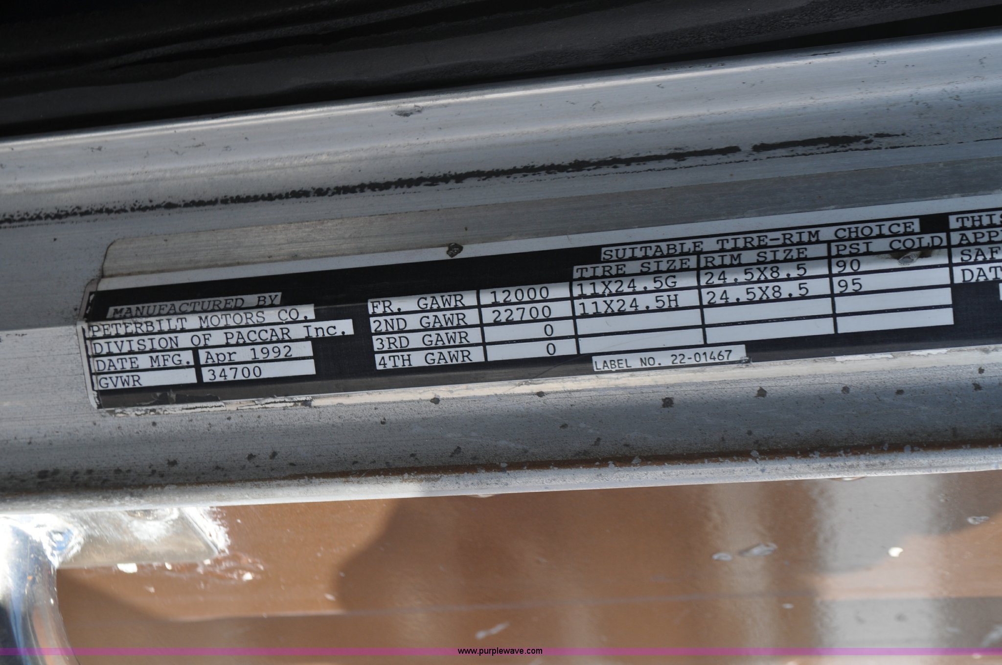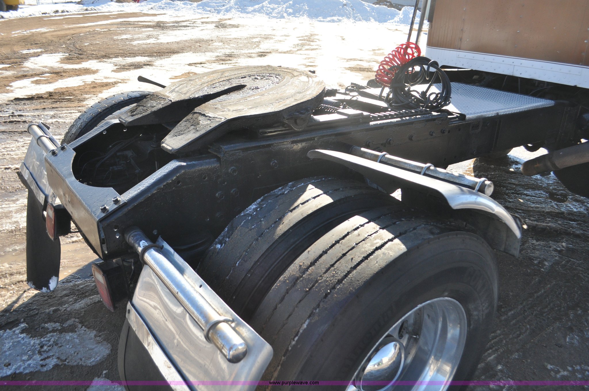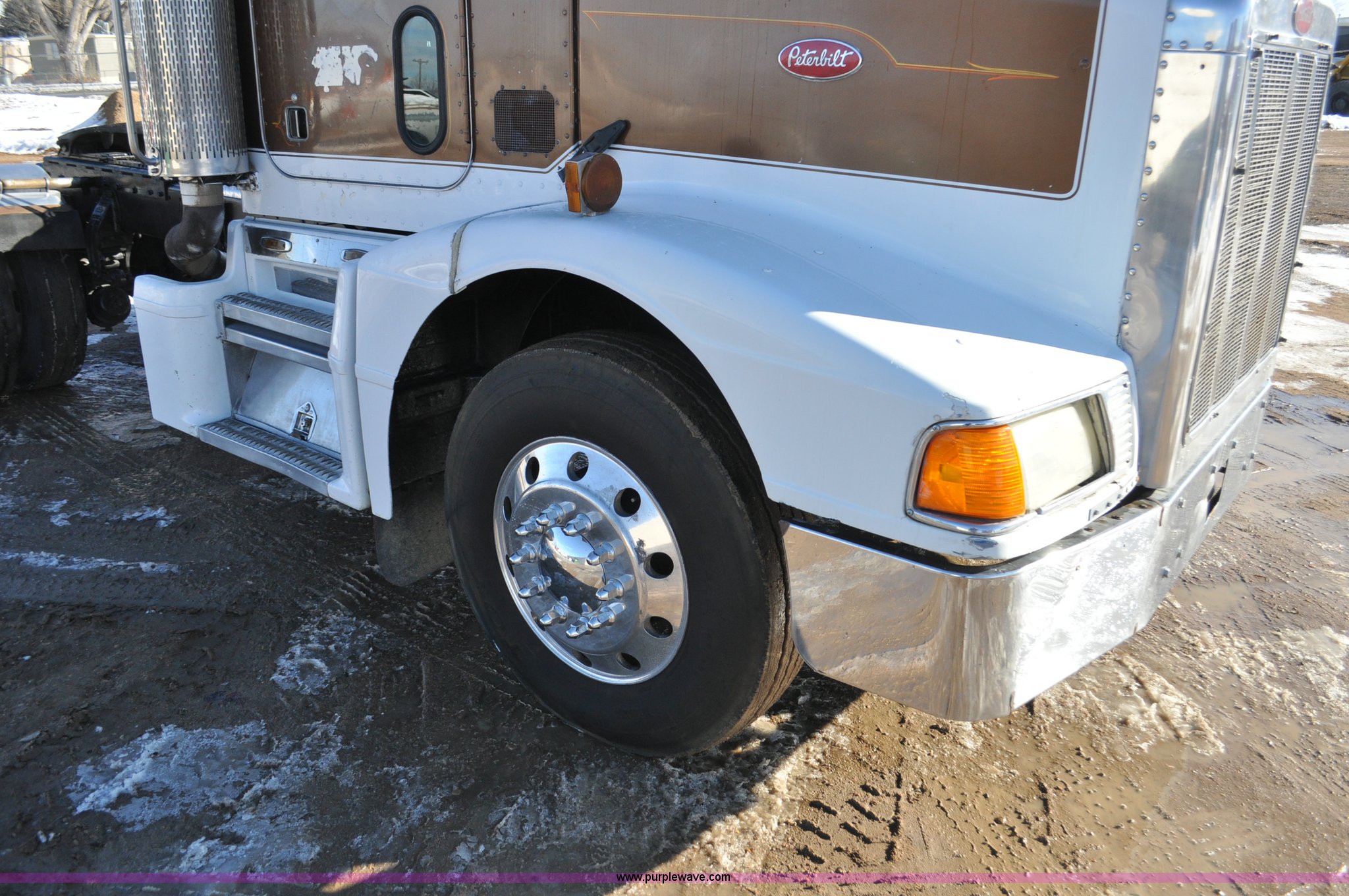 Purple Wave is selling a used Truck Chassis in Colorado. This item is a 1992 Peterbilt 377 truck cab and chassis with the following: 1,197,210 miles on odometer, Caterpillar 3406 14.6L L6 turbo diesel engine, 415 HP, Eaton Fuller eight speed manual transmission, Single axle, Inter-axle differential lock, Heat, Air suspension seat, Dump valves, Front tow hooks, Single rear exhaust stack, Aluminum deck plate, Air operated sliding fifth wheel plate, Stainless steel quarter fenders, Mud flaps, Air suspension, Air brakes, 11R24.5 tires, GVWR 34,700 lbs, FAWR 12,000 lbs, RAWR 22,700 lbs, 174" wheel base, Hood and grill damage