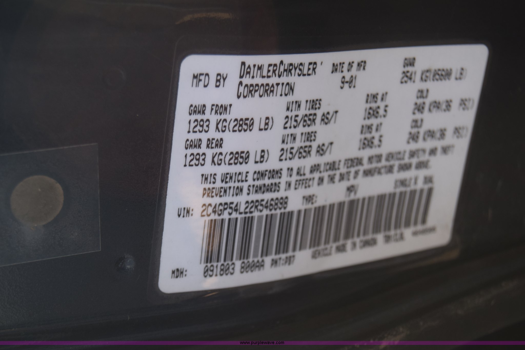 Purple Wave is selling a used Passenger Vehicle in Kansas. This item is a 2002 Chrysler Town & Country LXi van with the following: Unknown miles on odometer, 3.8L V6 OHV 12V gas engine, Automatic transmission, AC and heat, Tilt, Cruise, AM/FM/cassette, Power windows, locks, and mirrors, Leather interior, 215/65R16 tires, Interior/exterior cosmetic damage, Dents, Scratches, Cracked windshield, Front driver's side fender damaged, Case# 15C70714