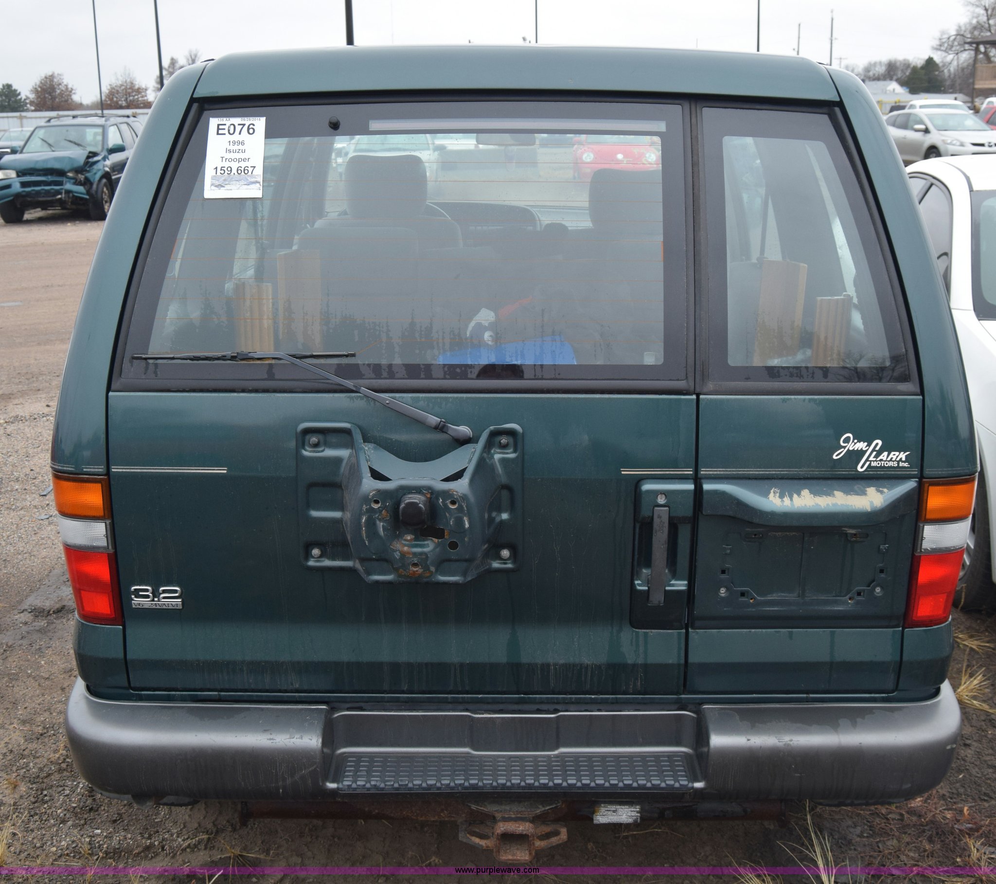 Purple Wave is selling a used Passenger Vehicle in Kansas. This item is a 1996 Isuzu Trooper SUV with the following: 163,611 miles on odometer, 3.2L V6 SOHC 24V gas engine, Automatic transmission, AC and heat, Tilt, Cruise, AM/FM/CD, Power windows, locks, and mirrors, Cloth interior, Receiver hitch, Hood will not open, Dents and scratches, Interior/exterior cosmetic damage, 245/70R16 tires, Case# 15C064649
