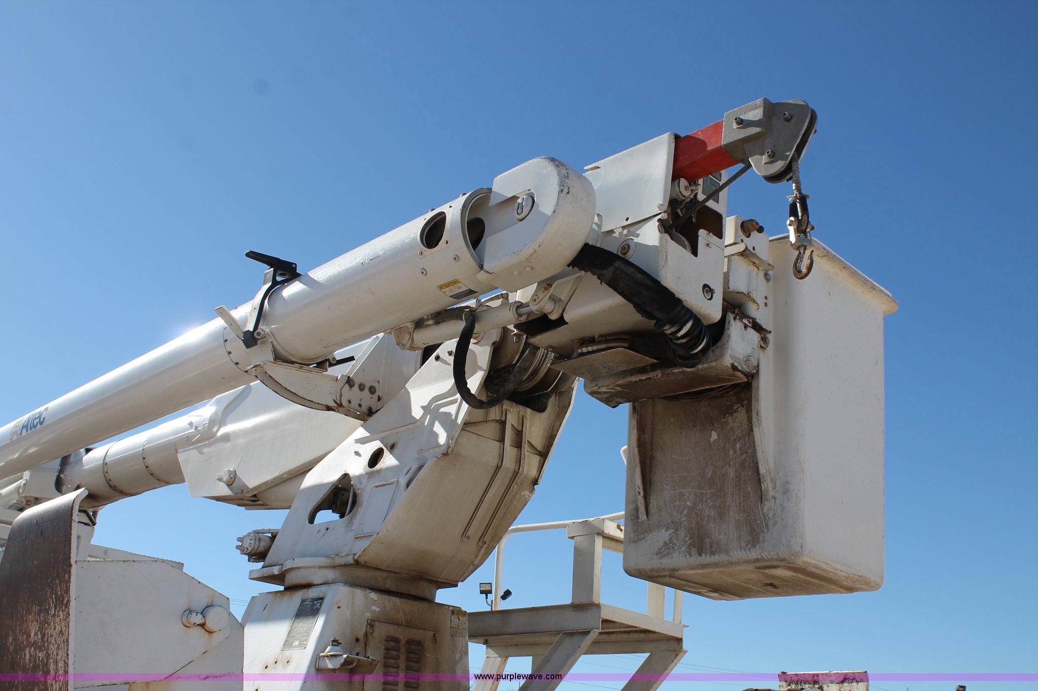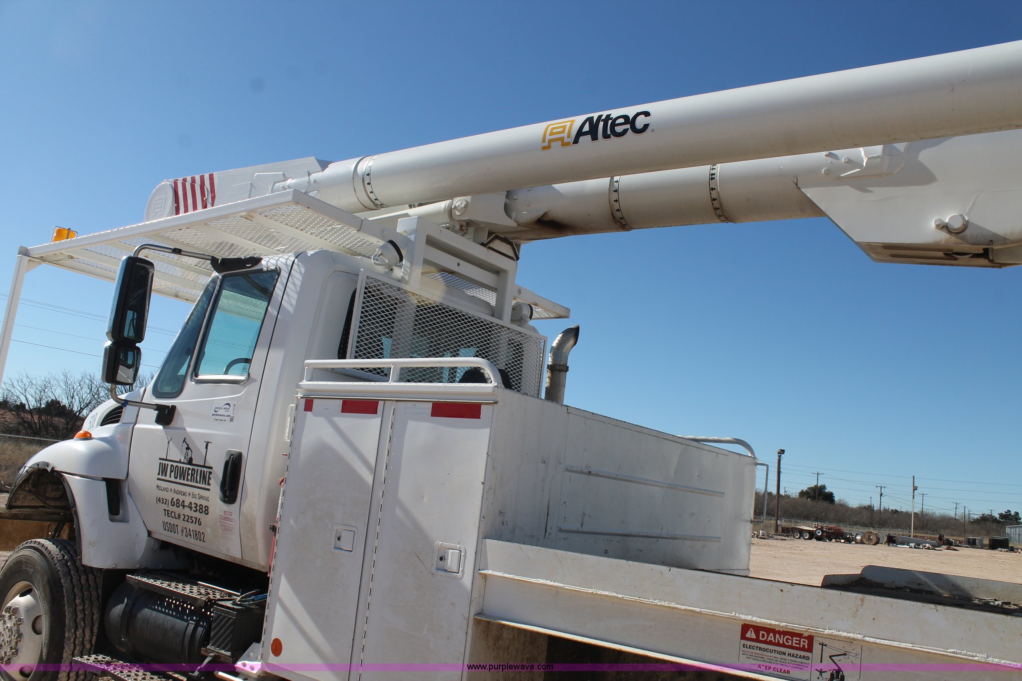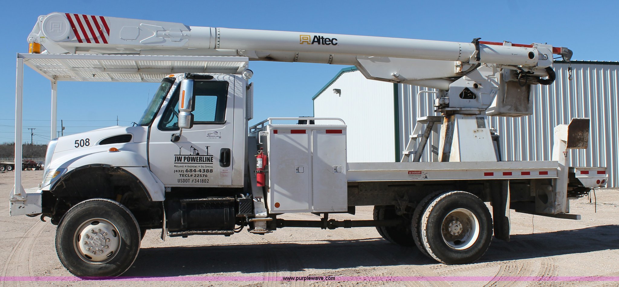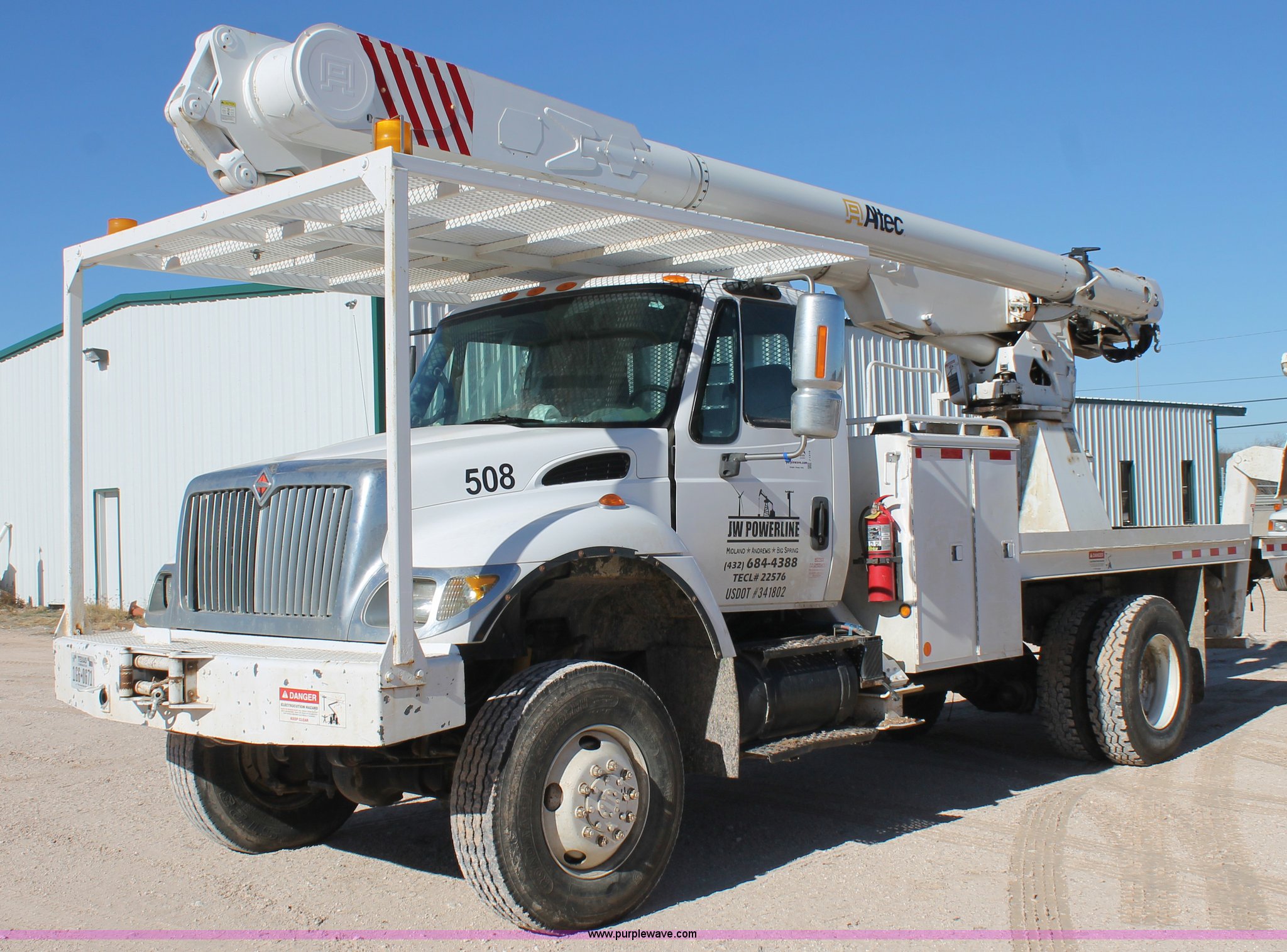 Purple Wave is selling a used Bucket Truck in Texas. This item is a 2002 International 7400 bucket truck with the following: 140,452 miles on odometer, International DT466 7.6L L6 turbo diesel engine, Eaton Fuller 10 speed manual transmission, AC and heat, AM/CD, Air suspension seat, Beacon light, Backup alarm, PTO, Service bed, Shelving, Utility rack, Work lights, Pintle hitch, Trailer wiring, Altec AM855 boom, Serial 0302BB2931, 350 lbs maximum lift capacity, 55' maximum lift height, Boom rotation, Material handler, Articulating insulated boom, (4) outriggers, Winch, Single exhaust stack, Single fuel tank, Spring suspension, Air brakes, 315/80R22.5 front tires, 12R22.5 rear tires, GVWR 37,000 lbs, Unit# 508