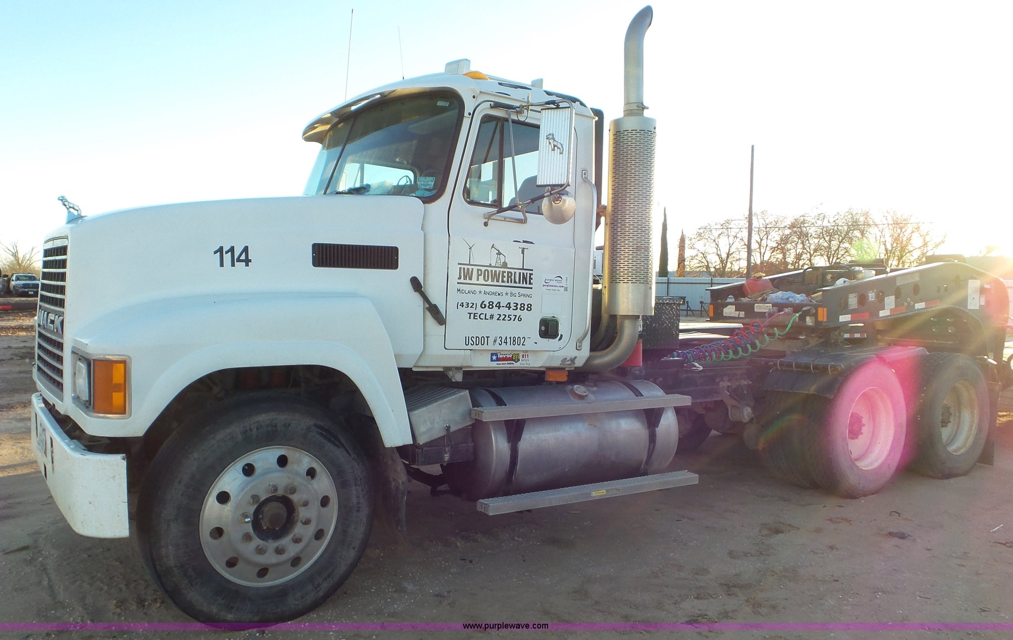 2003 Mack CH613 semi truck. 599,203 miles on odometer, 25,397 hours on meter, Mack E7 12.0L L6 turbo diesel engine, Eaton Fuller 10 speed manual transmission, Tandem axle, Inter-axle differential lock, AC and heat, Tilt, Telescoping steering wheel, Cruise, AM/FM/CD, Air suspension seat, Heated mirrors, Dump valves, Exterior visor, Headache rack, Front tow hooks, Dual rear exhaust stacks, Fixed fifth wheel plate, Steel deck plate, Dual fuel tanks, Half fenders, Mud flaps, Air suspension, Air brakes, 11R22.5 tires, Unit# 114. 1M1AA18Y33W150915. JW Powerline. 700 S Fairgrounds Rd. Midland, TX 79701
