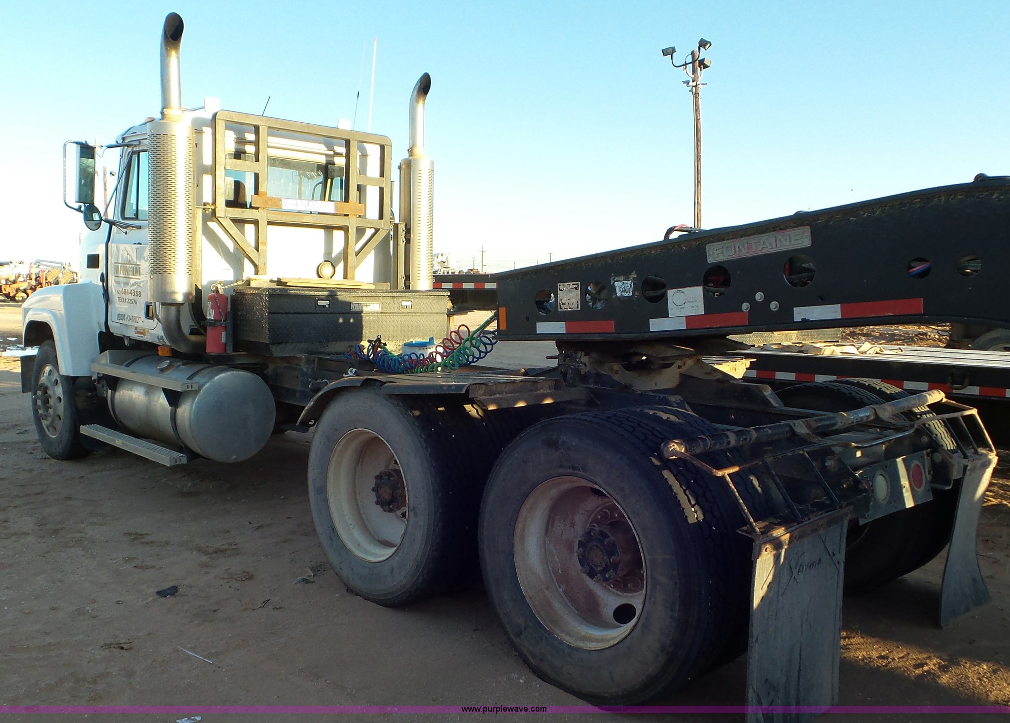 Purple Wave is selling a used Truck Tractor in Texas. This item is a 2003 Mack CH613 semi truck with the following: 599,203 miles on odometer, 25,397 hours on meter, Mack E7 12.0L L6 turbo diesel engine, Eaton Fuller 10 speed manual transmission, Tandem axle, Inter-axle differential lock, AC and heat, Tilt, Telescoping steering wheel, Cruise, AM/FM/CD, Air suspension seat, Heated mirrors, Dump valves, Exterior visor, Headache rack, Front tow hooks, Dual rear exhaust stacks, Fixed fifth wheel plate, Steel deck plate, Dual fuel tanks, Half fenders, Mud flaps, Air suspension, Air brakes, 11R22.5 tires, Unit# 114
