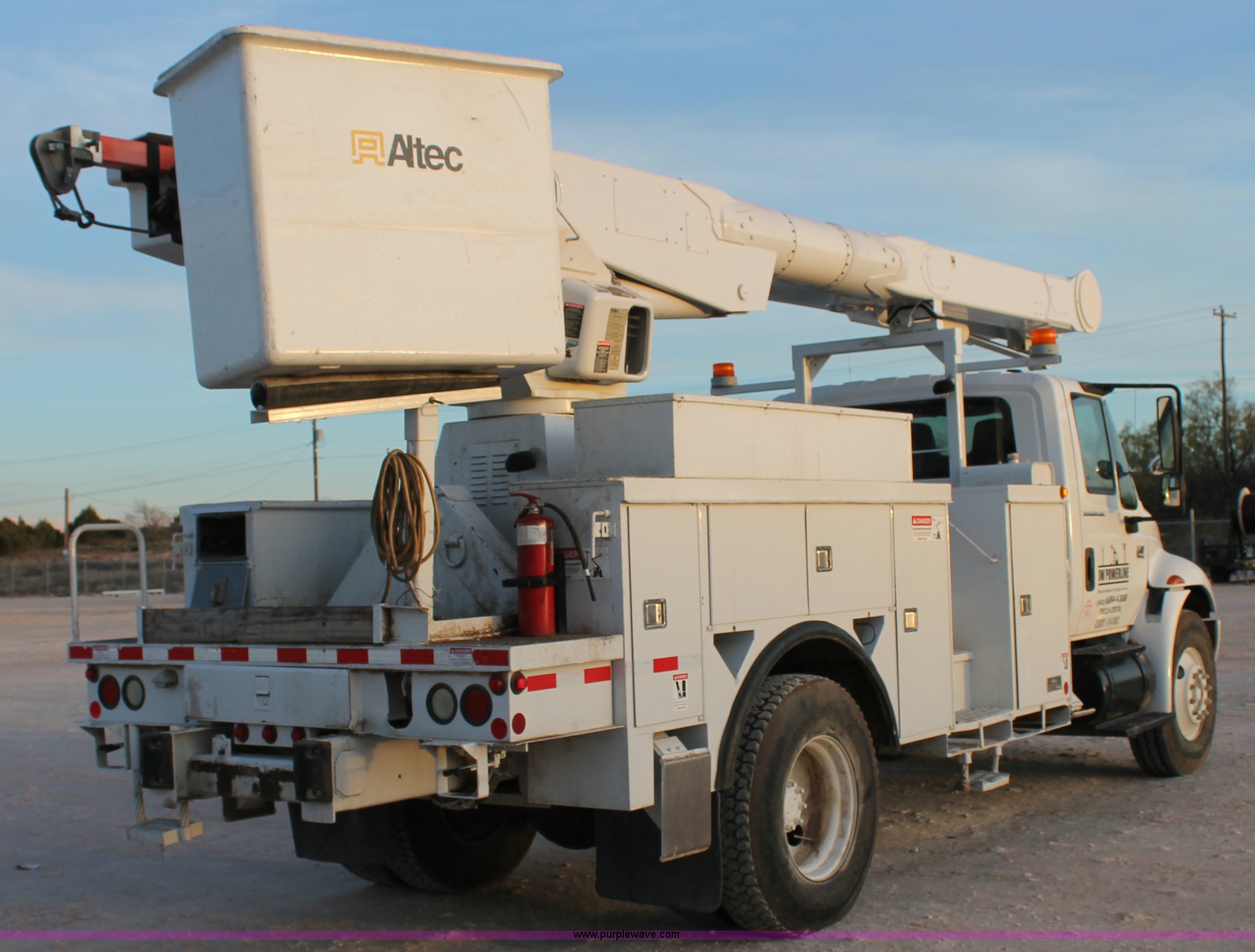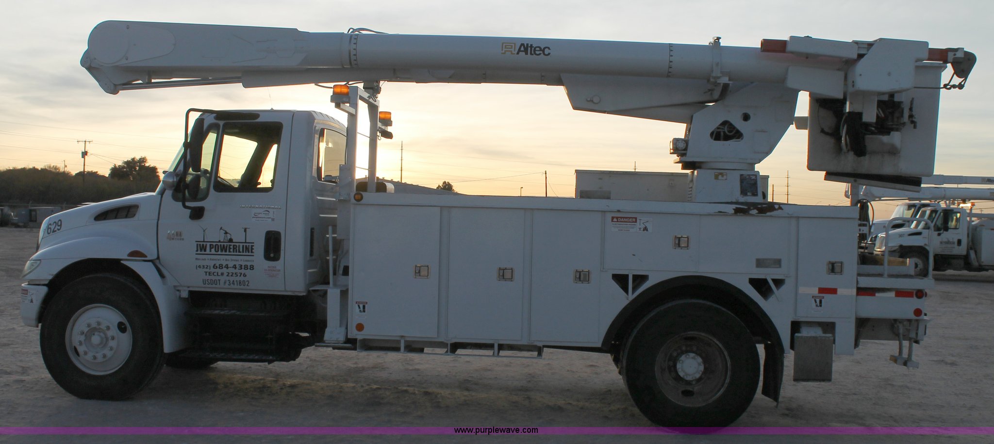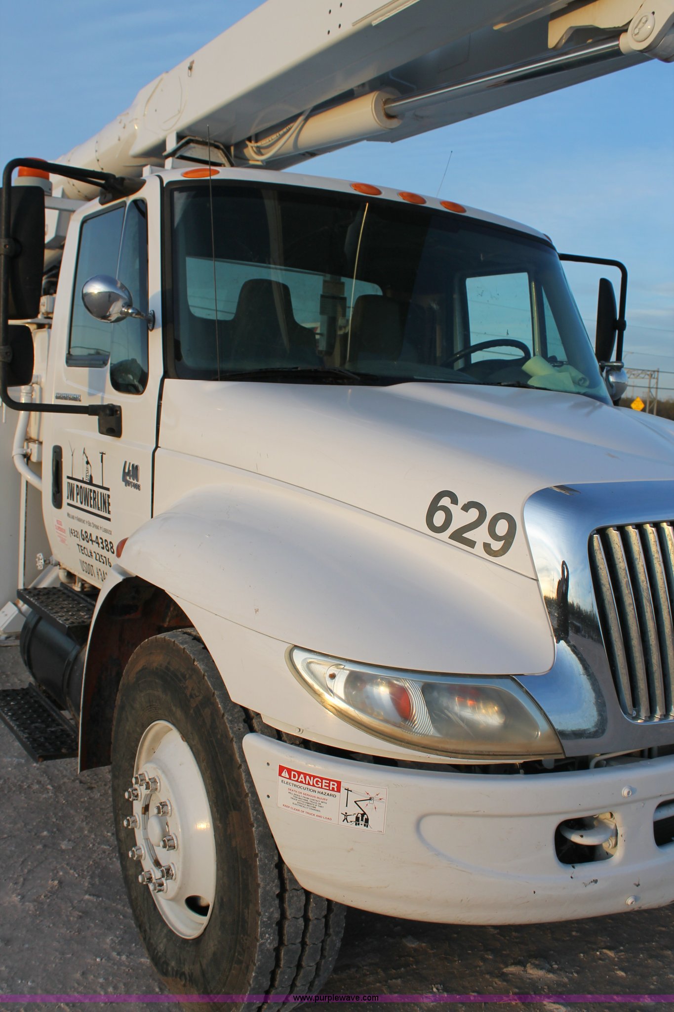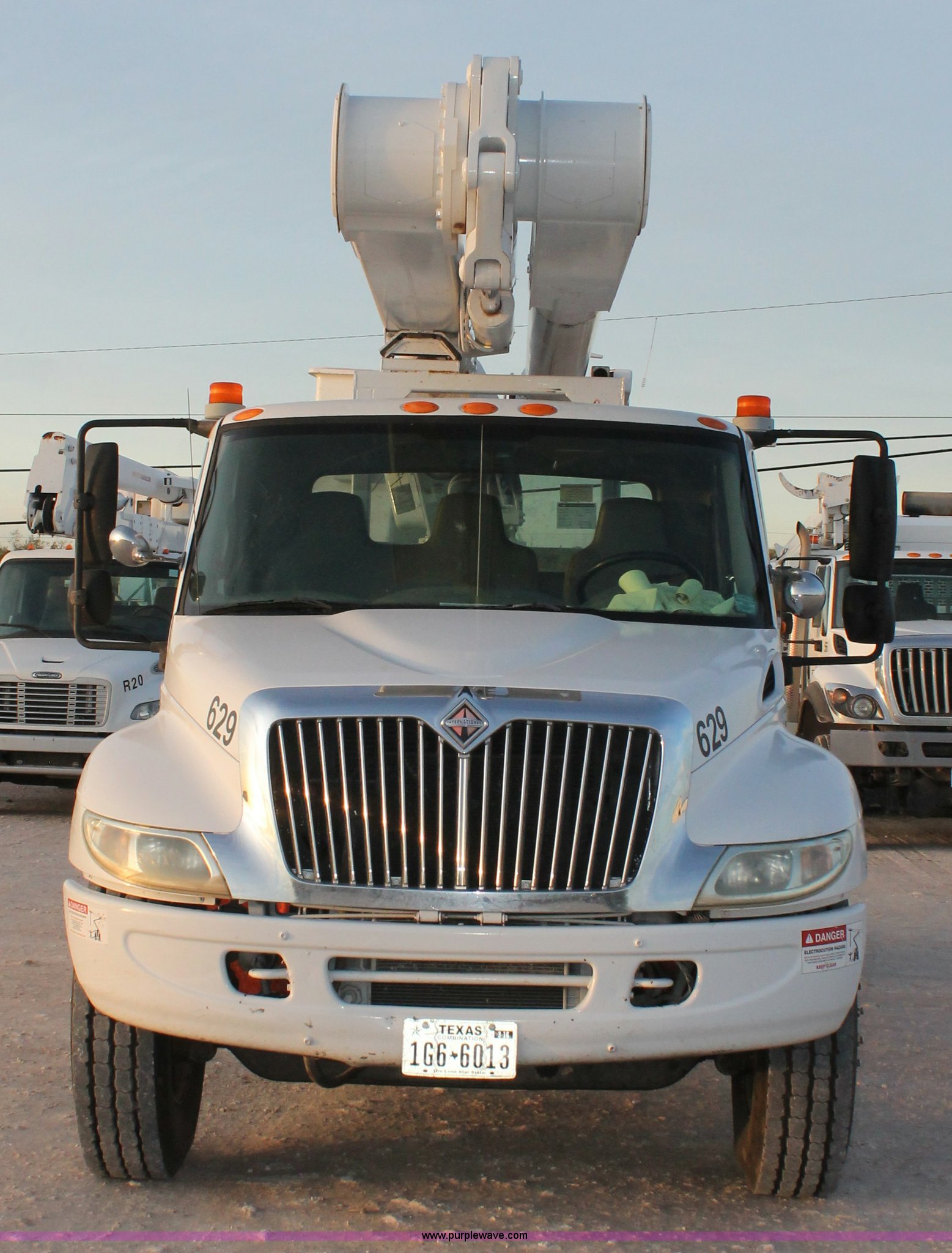 Purple Wave is selling a used Bucket Truck in Texas. This item is a 2003 International Dura Star 4400 bucket truck with the following: 113,695 miles on odometer, 8,322 hours on meter, International DT466 7.6L L6 turbo diesel engine, Automatic transmission, AC and heat, AM/FM, Backup alarm, Front tow hooks, Altec AM650 boom, Serial D702BB3054, Shelving, Utility rack, Work lights, Cat walk, 700 lbs maximum lift capacity, 50' maximum lift height, Platform controls, Boom rotation, Material handler, Insulated boom, Single fuel tank, Spring suspension, Air brakes, 485" wheelbase, 12R22.5 tires, Unit# 629
