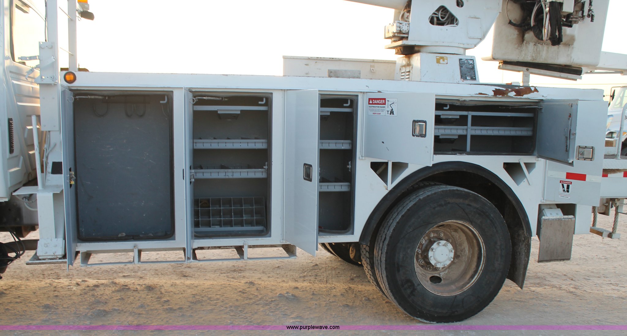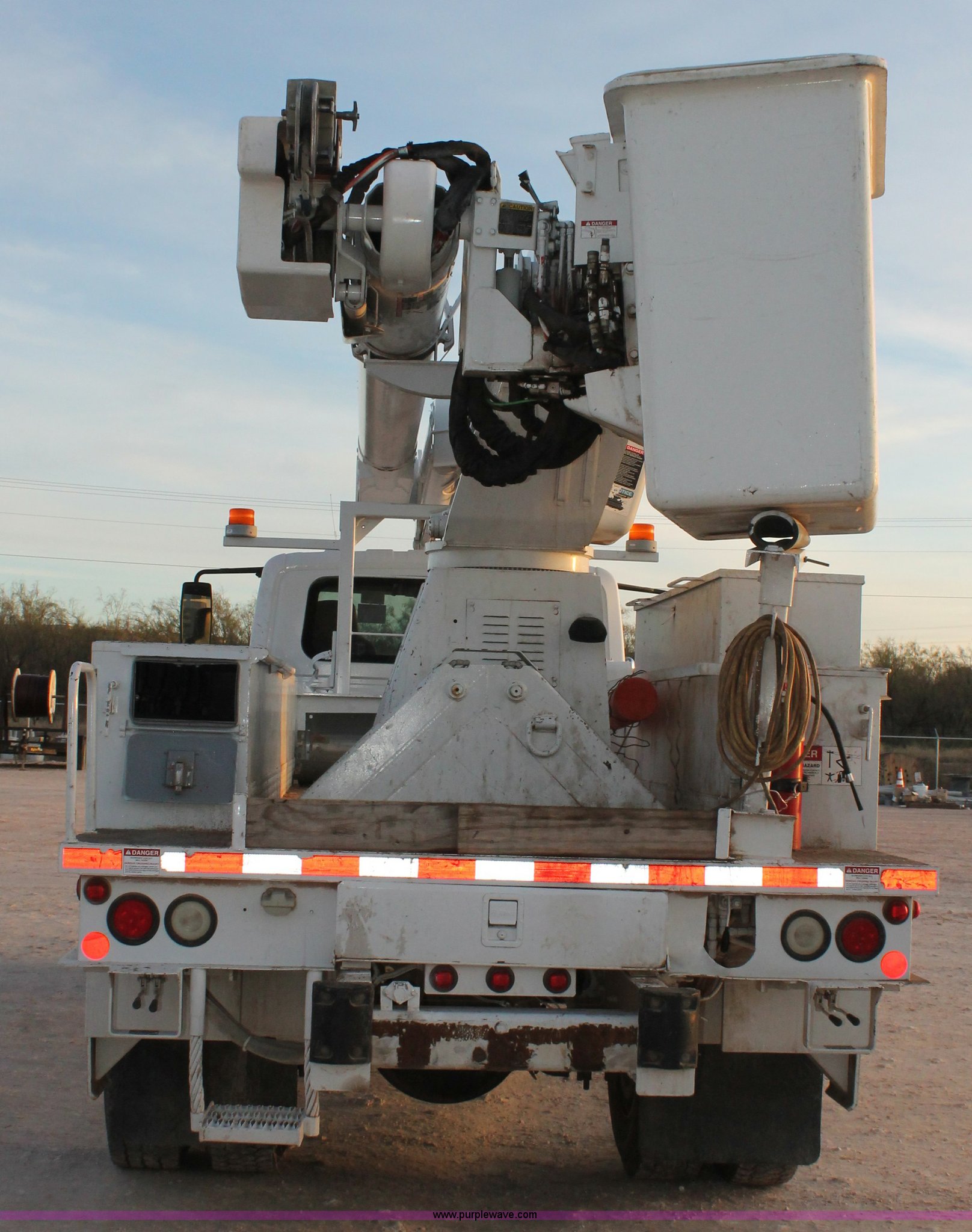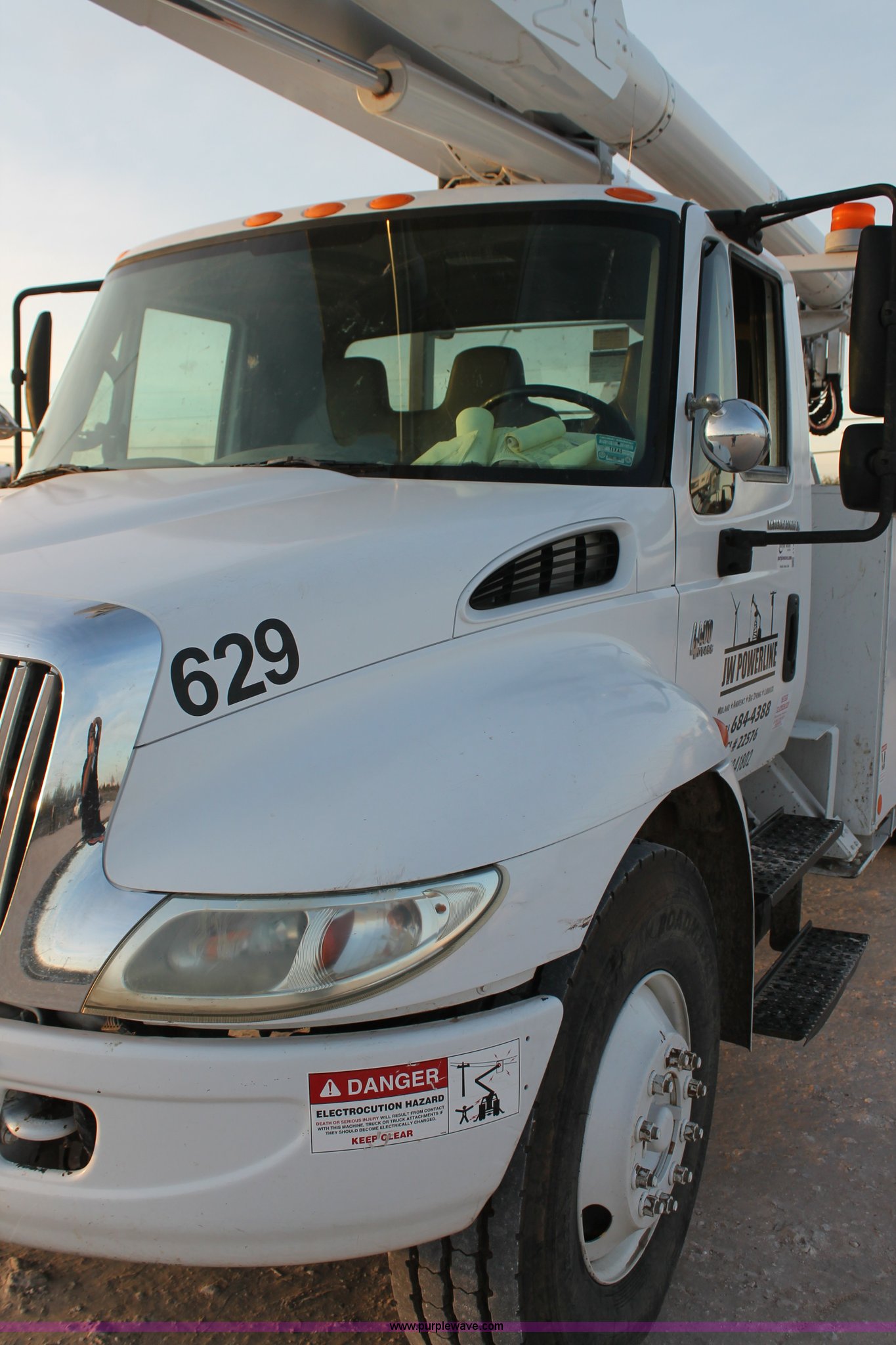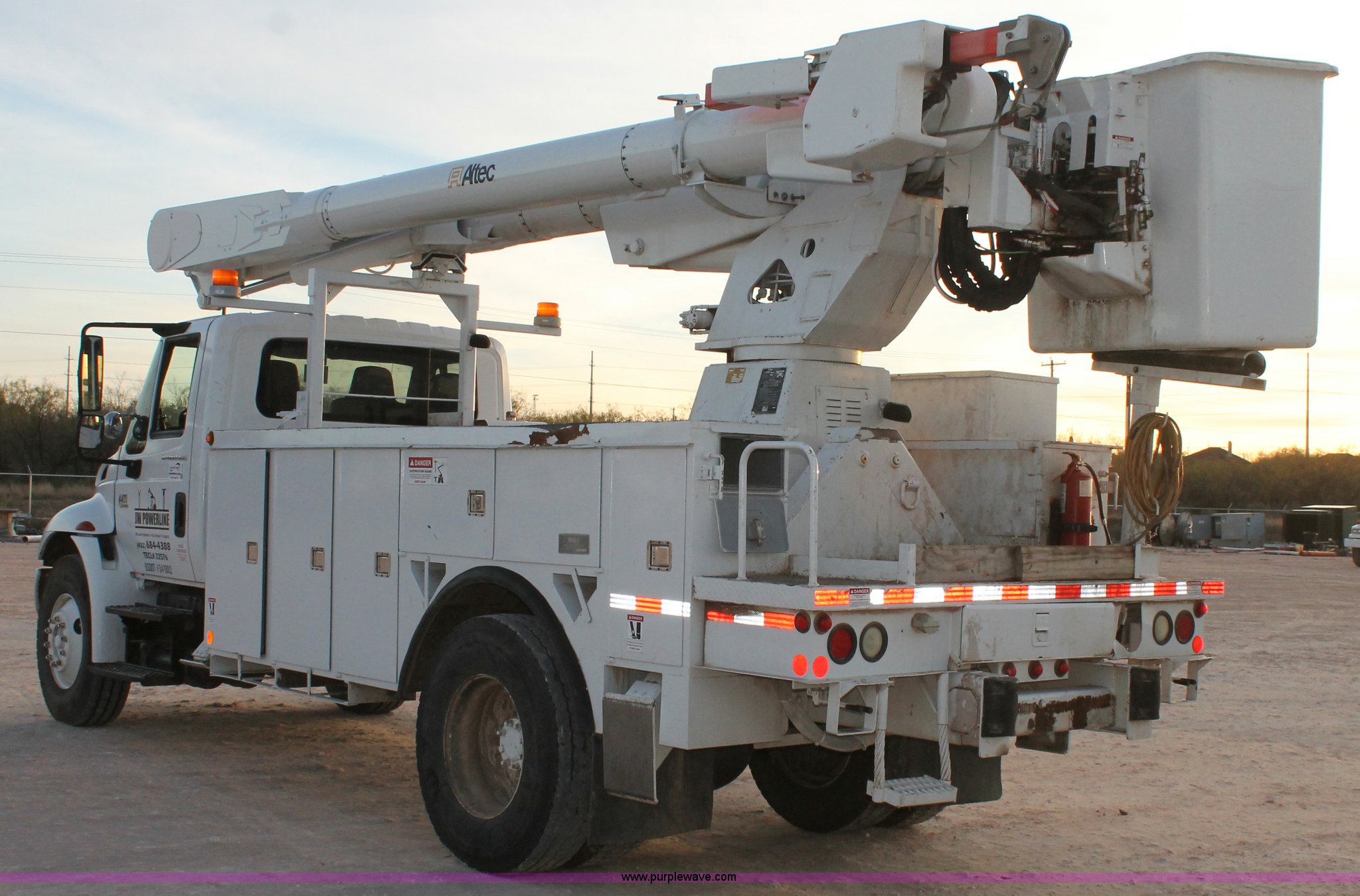 Purple Wave is selling a used Bucket Truck in Texas. This item is a 2003 International Dura Star 4400 bucket truck with the following: 113,695 miles on odometer, 8,322 hours on meter, International DT466 7.6L L6 turbo diesel engine, Automatic transmission, AC and heat, AM/FM, Backup alarm, Front tow hooks, Altec AM650 boom, Serial D702BB3054, Shelving, Utility rack, Work lights, Cat walk, 700 lbs maximum lift capacity, 50' maximum lift height, Platform controls, Boom rotation, Material handler, Insulated boom, Single fuel tank, Spring suspension, Air brakes, 485" wheelbase, 12R22.5 tires, Unit# 629