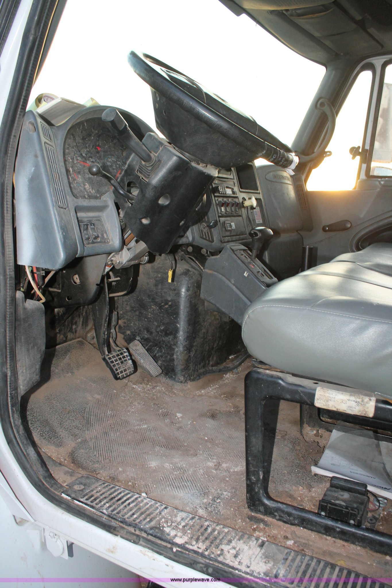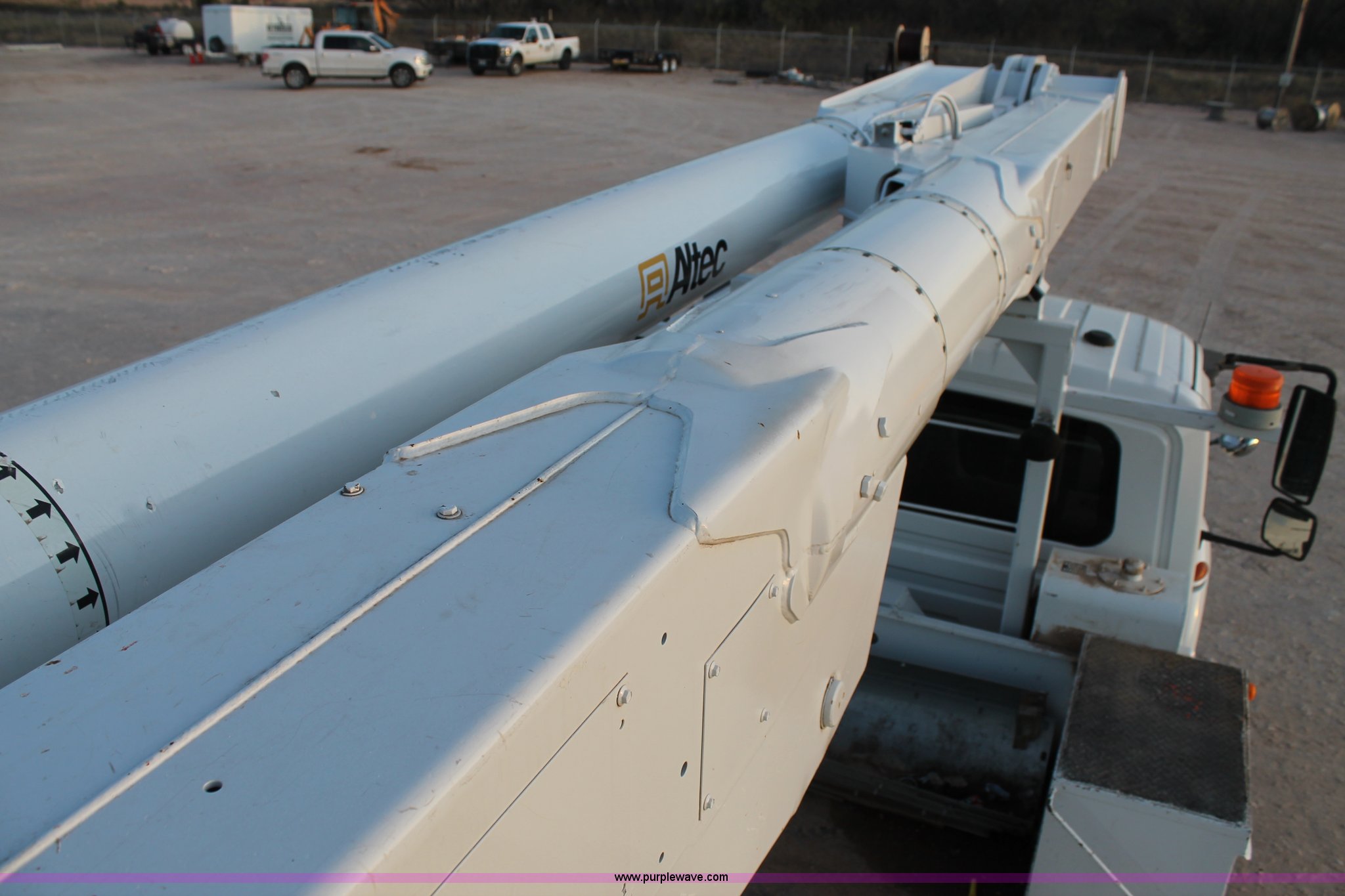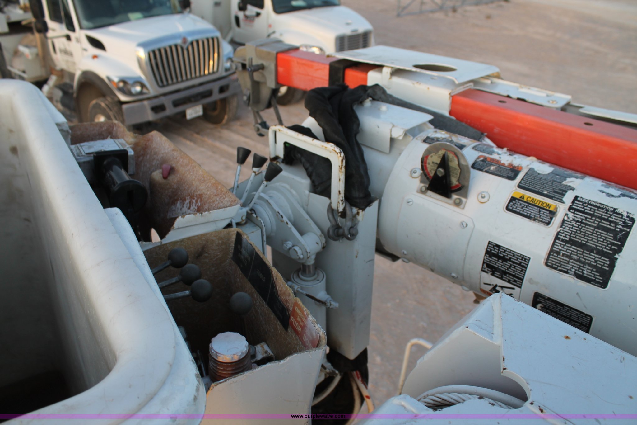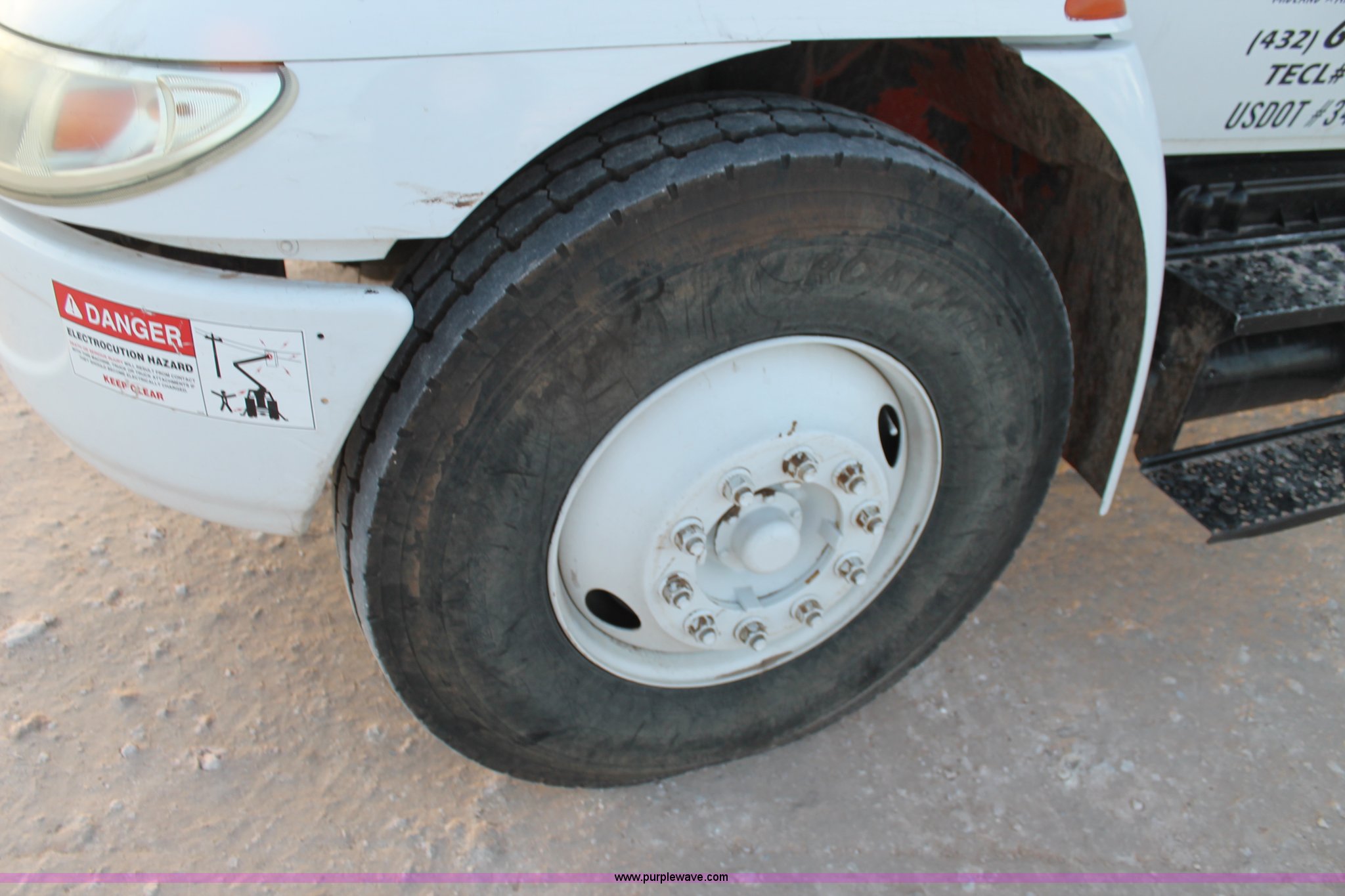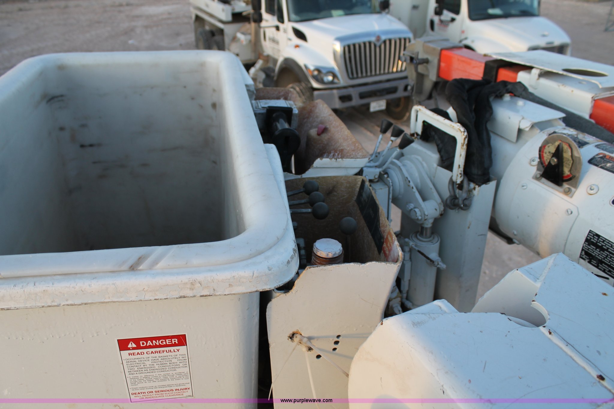 Purple Wave is selling a used Bucket Truck in Texas. This item is a 2003 International Dura Star 4400 bucket truck with the following: 113,695 miles on odometer, 8,322 hours on meter, International DT466 7.6L L6 turbo diesel engine, Automatic transmission, AC and heat, AM/FM, Backup alarm, Front tow hooks, Altec AM650 boom, Serial D702BB3054, Shelving, Utility rack, Work lights, Cat walk, 700 lbs maximum lift capacity, 50' maximum lift height, Platform controls, Boom rotation, Material handler, Insulated boom, Single fuel tank, Spring suspension, Air brakes, 485" wheelbase, 12R22.5 tires, Unit# 629