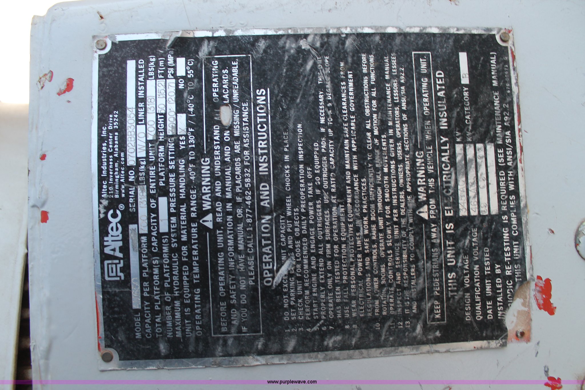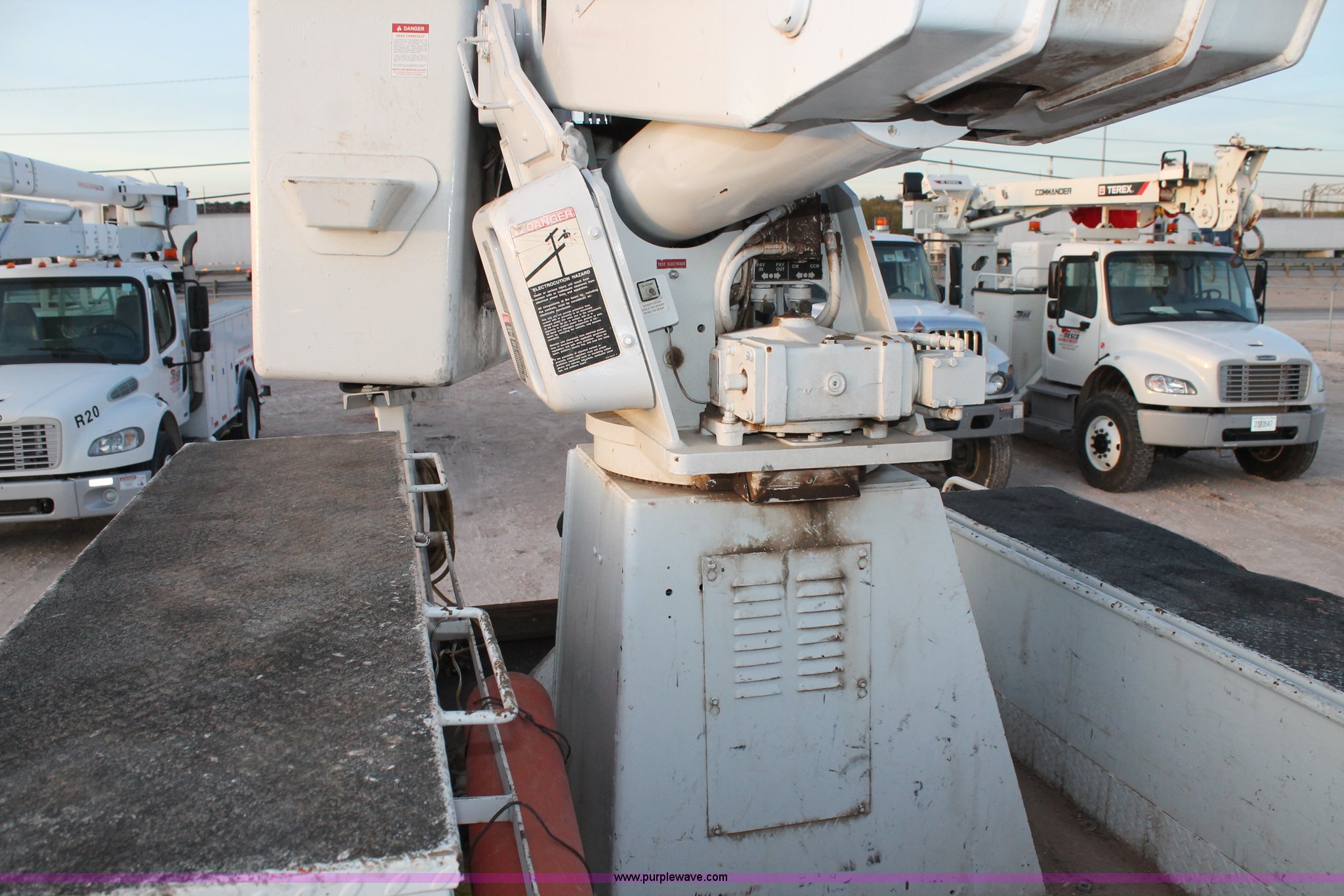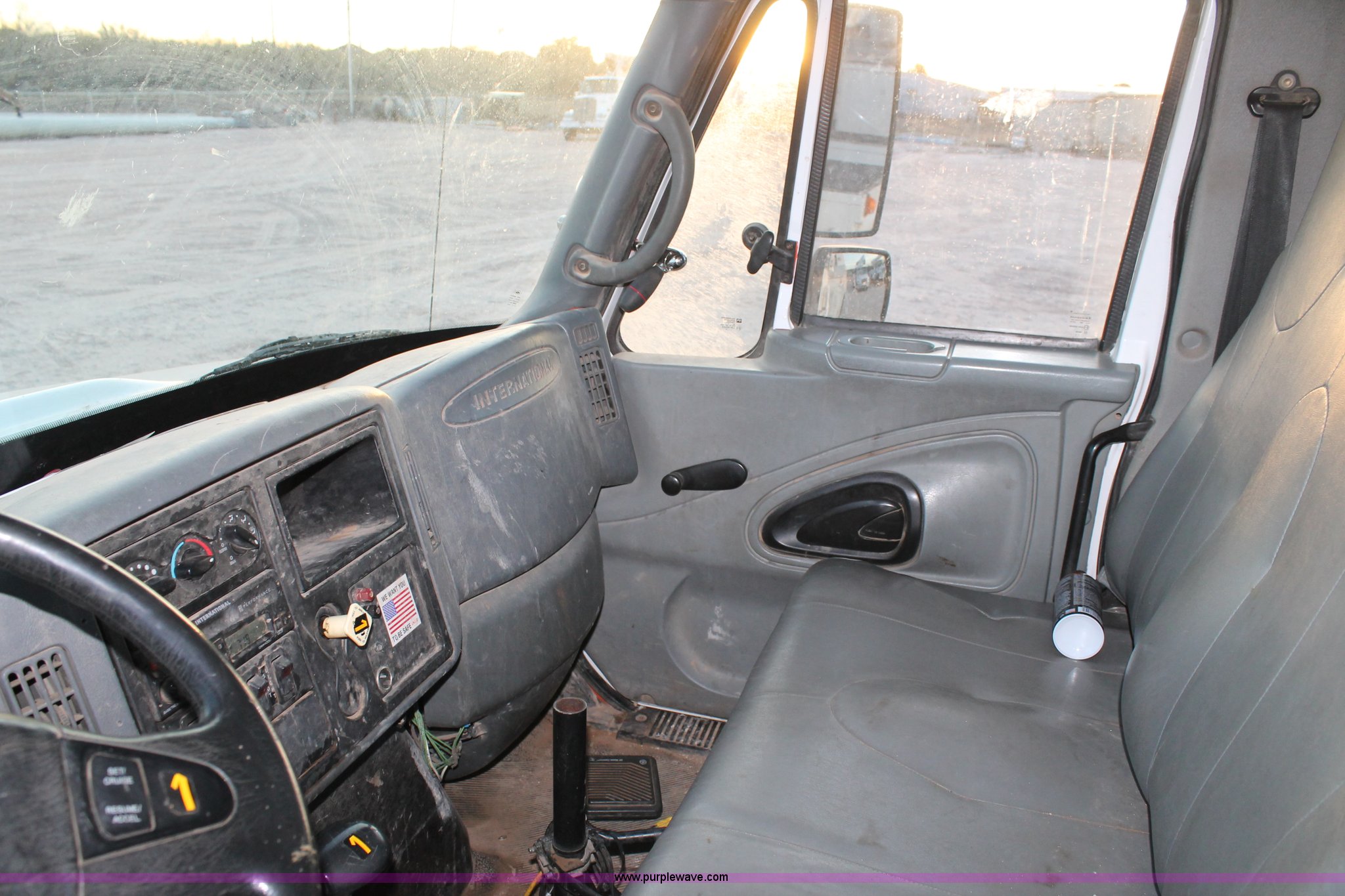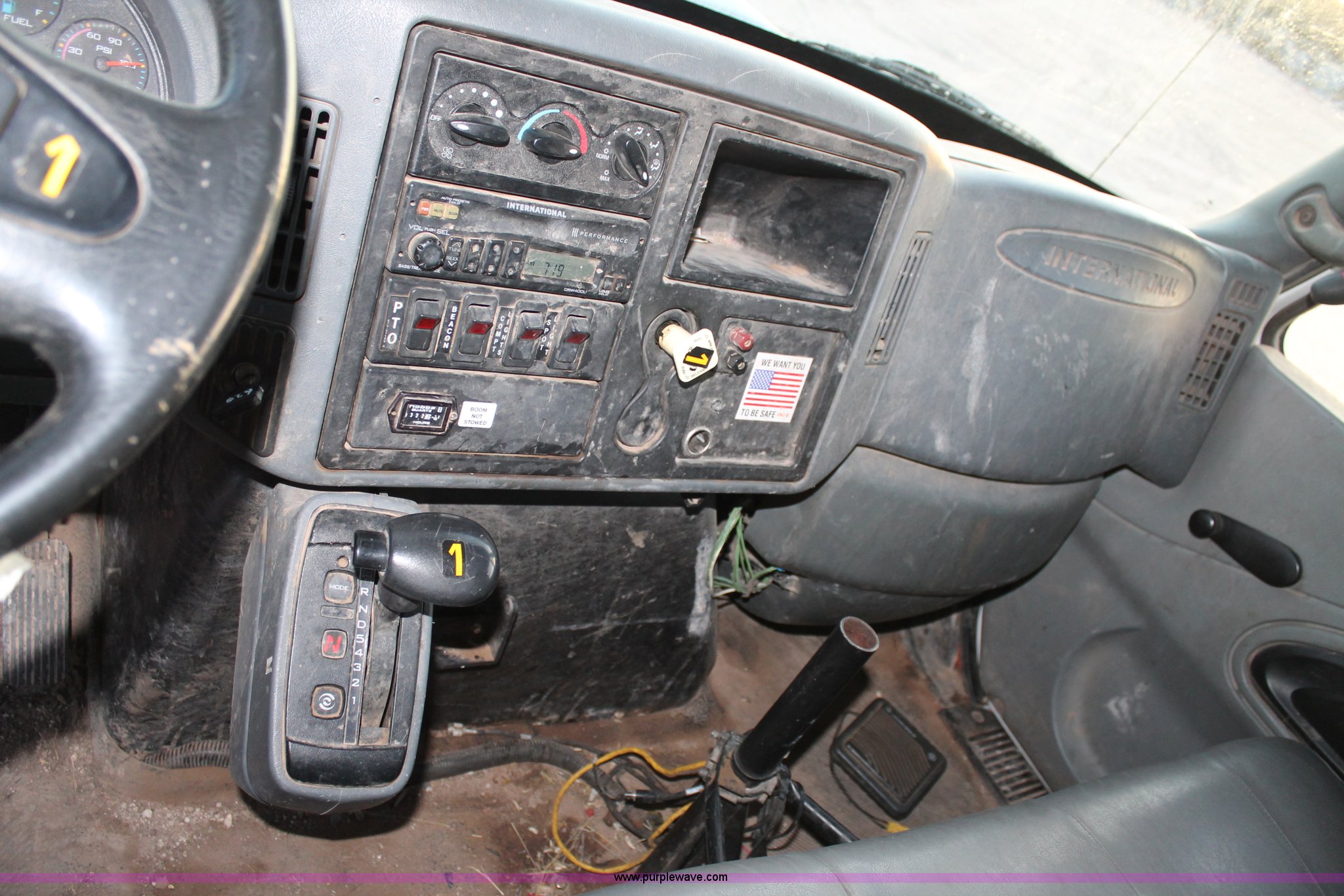 Purple Wave is selling a used Bucket Truck in Texas. This item is a 2003 International Dura Star 4400 bucket truck with the following: 113,695 miles on odometer, 8,322 hours on meter, International DT466 7.6L L6 turbo diesel engine, Automatic transmission, AC and heat, AM/FM, Backup alarm, Front tow hooks, Altec AM650 boom, Serial D702BB3054, Shelving, Utility rack, Work lights, Cat walk, 700 lbs maximum lift capacity, 50' maximum lift height, Platform controls, Boom rotation, Material handler, Insulated boom, Single fuel tank, Spring suspension, Air brakes, 485" wheelbase, 12R22.5 tires, Unit# 629