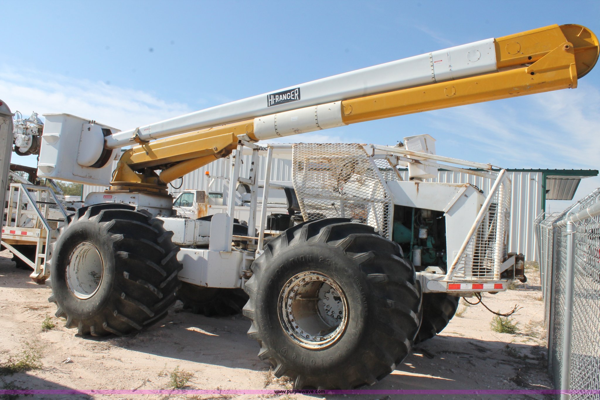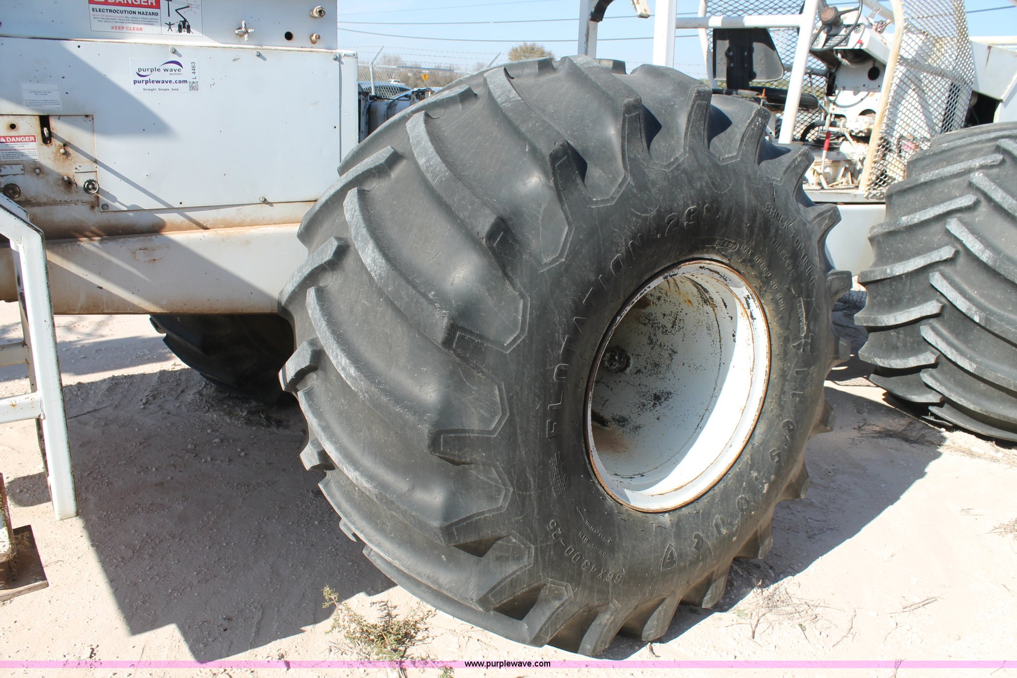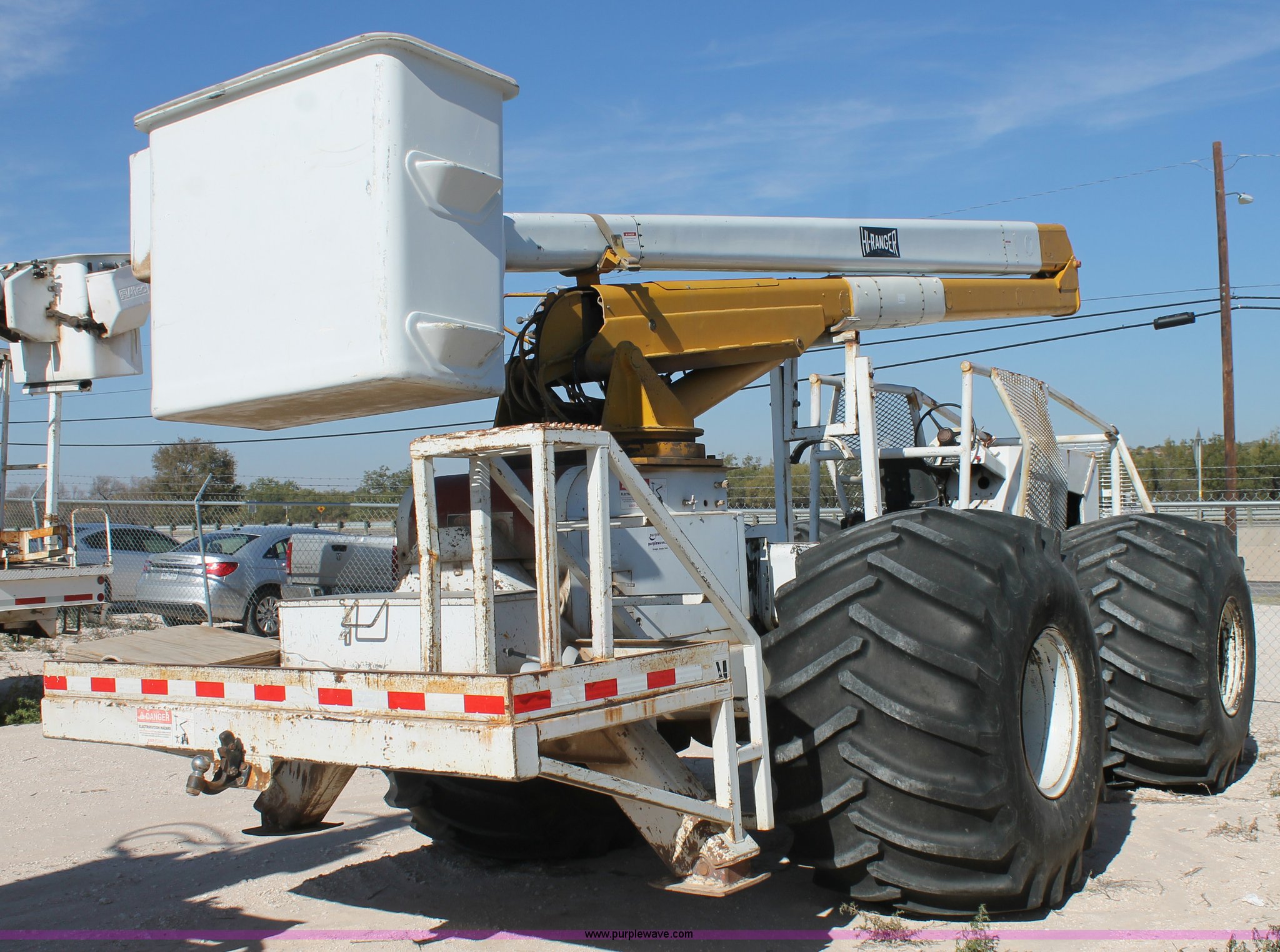 Mudd Buggy 5F1-48PB1 boom lift. 2,133 hours on meter, Detroit Diesel six cylinder diesel engine, Four speed manual transmission, Hi Ranger insulated folding boom, 500 lbs maximum lift capacity, 48' maximum lift height, 32' maximum reach, Hydraulic articulating turn, 25'L x 11.5'W overall dimensions, Front winch, 66 x 43.00-25 tires, Serial 18412354. JW Powerline. 3310 E I-20. Big Spring, TX 79720