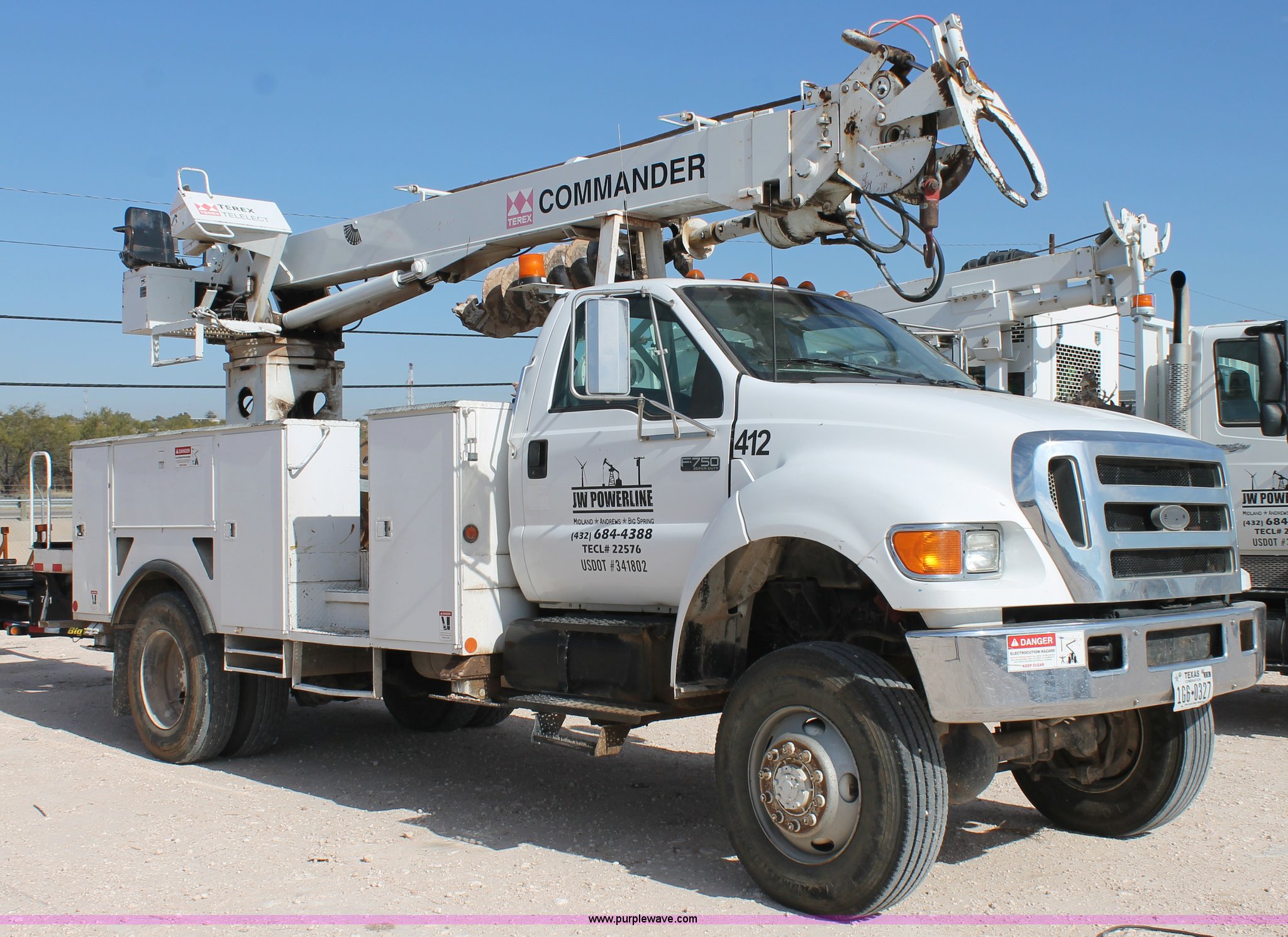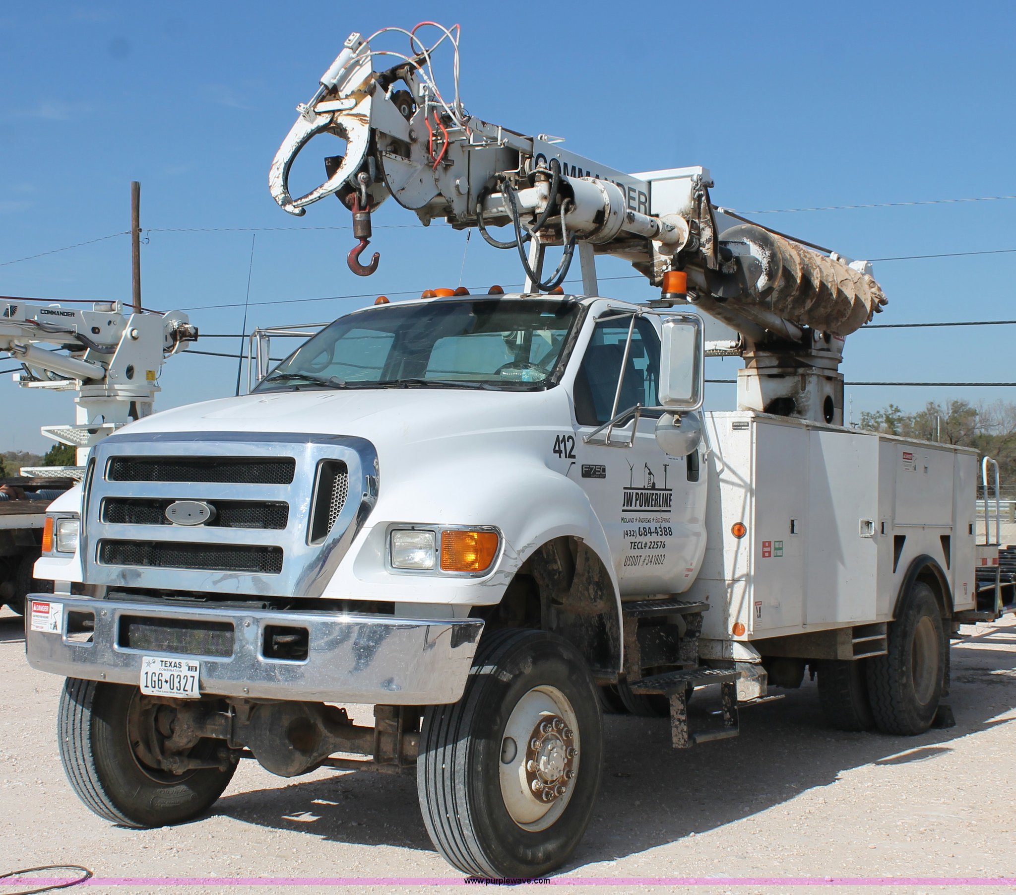 2005 Ford F750 Super Duty bucket truck. 95,072 miles on odometer, Caterpillar 3126 7.2L L6 turbo diesel engine, Automatic transmission, AC and heat, AM/FM, Spring suspension seat, PTO, 2005 Terex Commander 4045 boom 46.3' maximum lift height, Serial 2050426976, (4) outriggers, Boom rotation, Material handler, Pole guide, Telescopic boom, Shelving, Utility rack, Work lights, Single fuel tank, Backup alarm, Trailer wiring, Spring suspension, Air brakes, 493" wheelbase, 11R22.5 tires, GVWR 33,000 lbs. 3FRXF75R35V139568. JW Powerline. 3310 E I-20. Big Spring, TX 79720