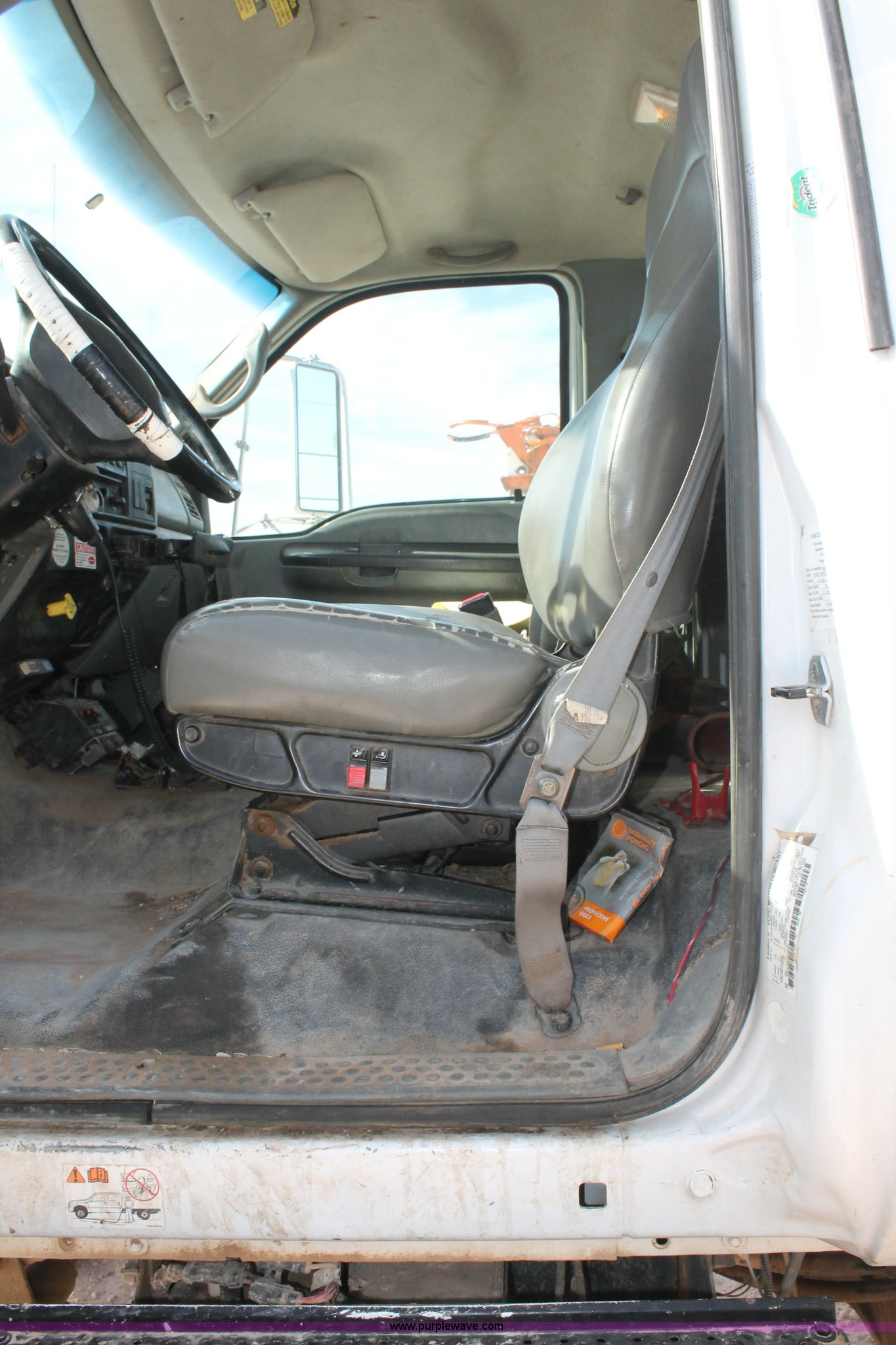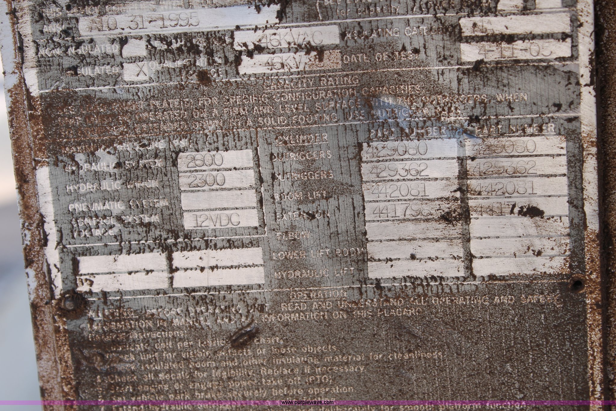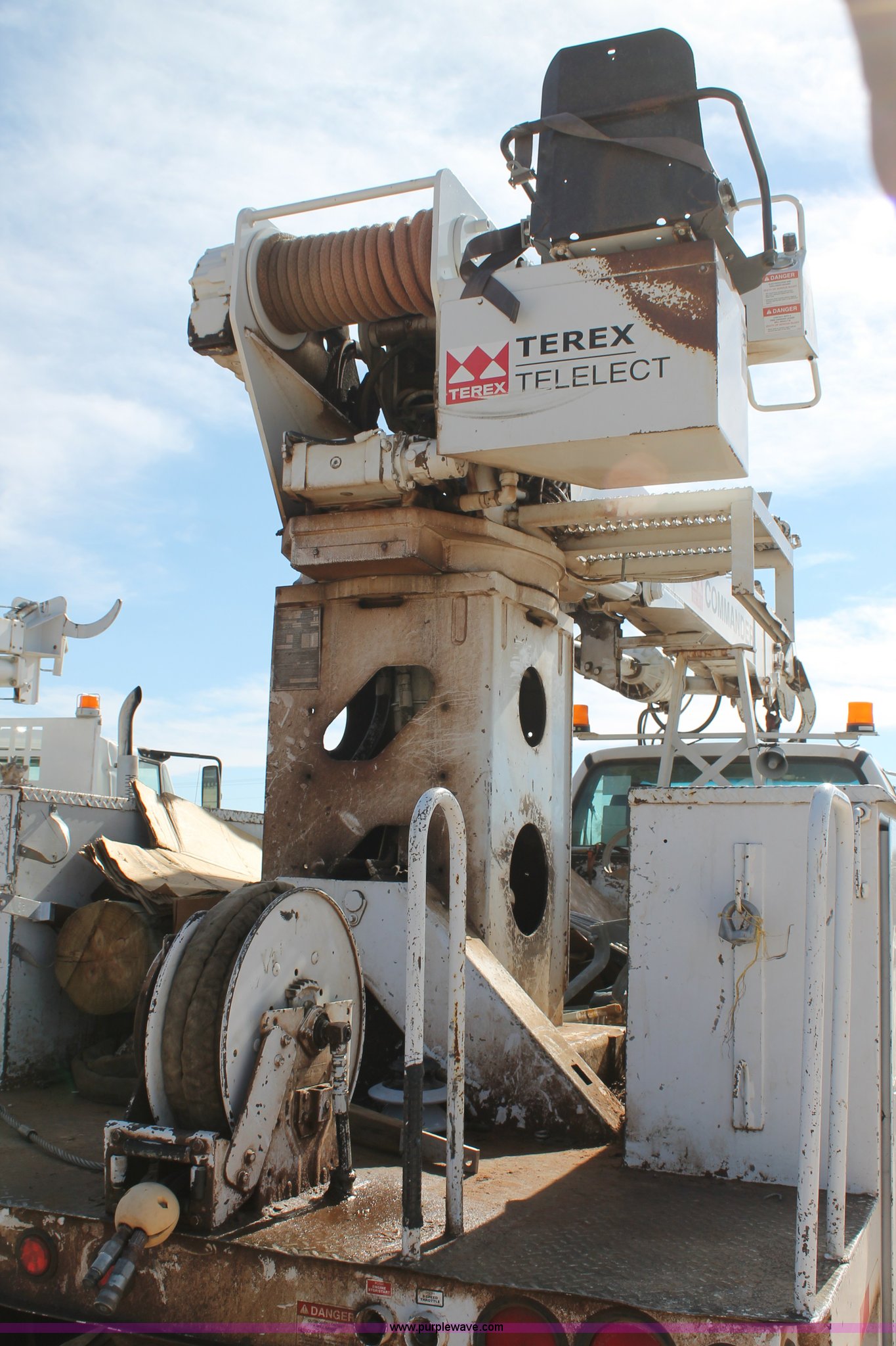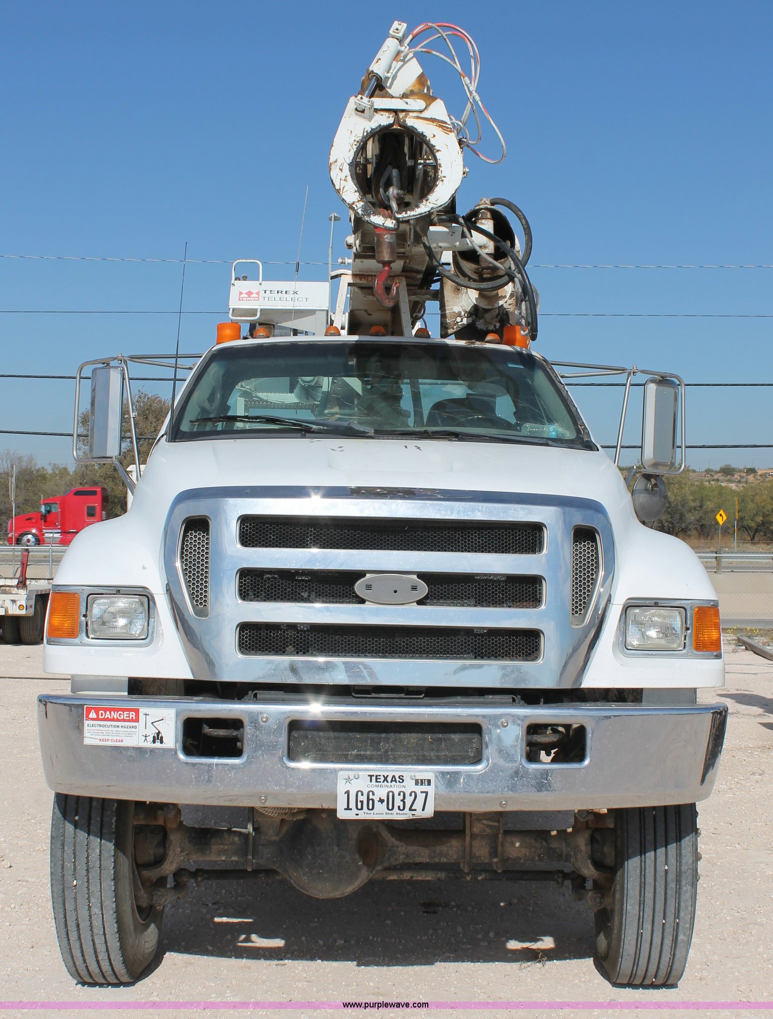 Purple Wave is selling a used Bucket Truck in Texas. This item is a 2005 Ford F750 Super Duty bucket truck with the following: 95,072 miles on odometer, Caterpillar 3126 7.2L L6 turbo diesel engine, Automatic transmission, AC and heat, AM/FM, Spring suspension seat, PTO, 2005 Terex Commander 4045 boom, 46.3' maximum lift height, Serial 2050426976, (4) outriggers, Boom rotation, Material handler, Pole guide, Telescopic boom, Shelving, Utility rack, Work lights, Single fuel tank, Backup alarm, Trailer wiring, Spring suspension, Air brakes, 493" wheelbase, 11R22.5 tires, GVWR 33,000 lbs