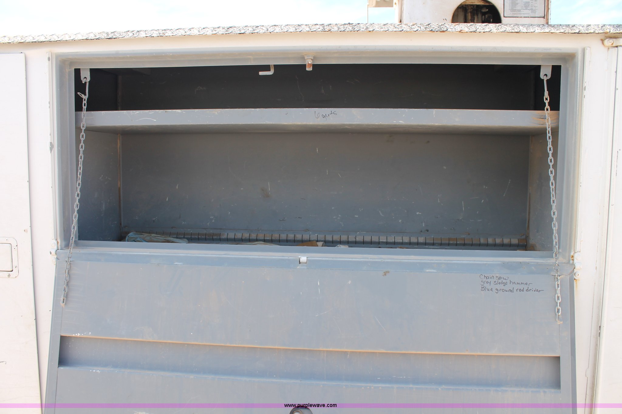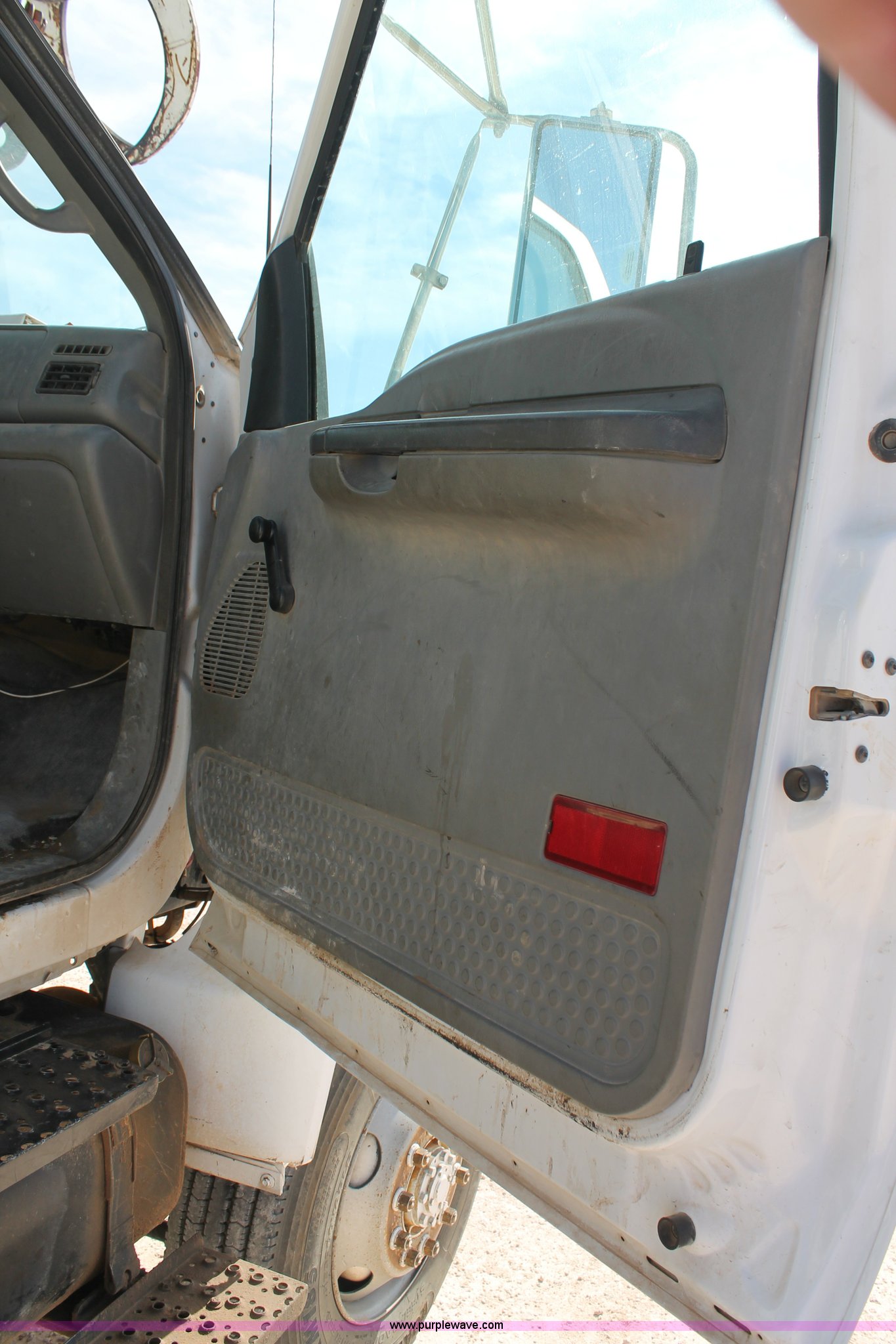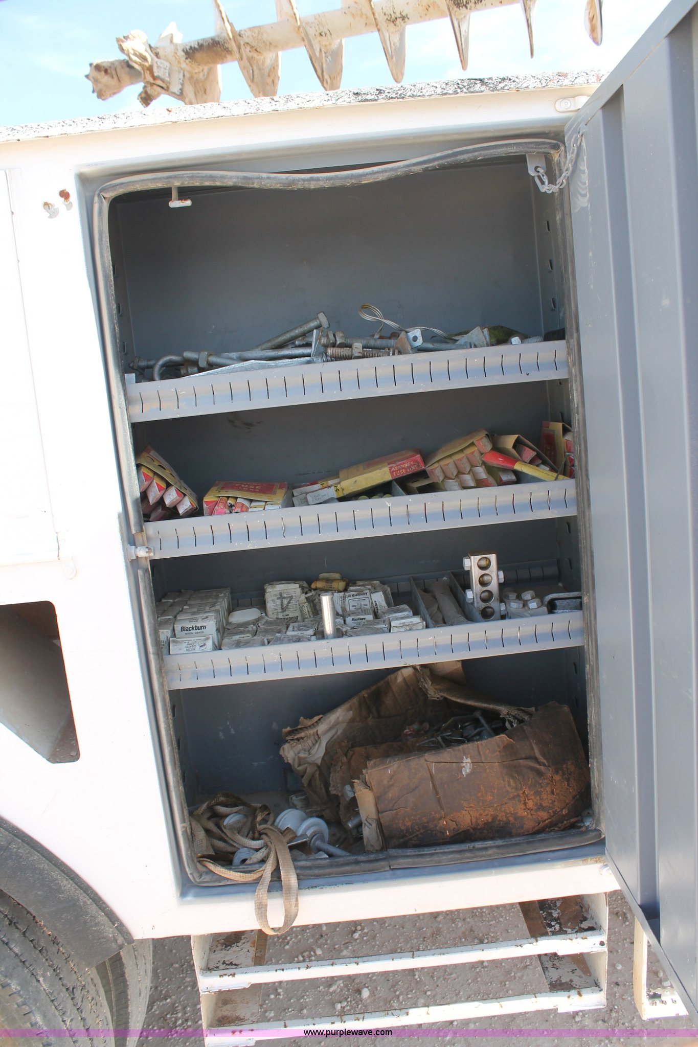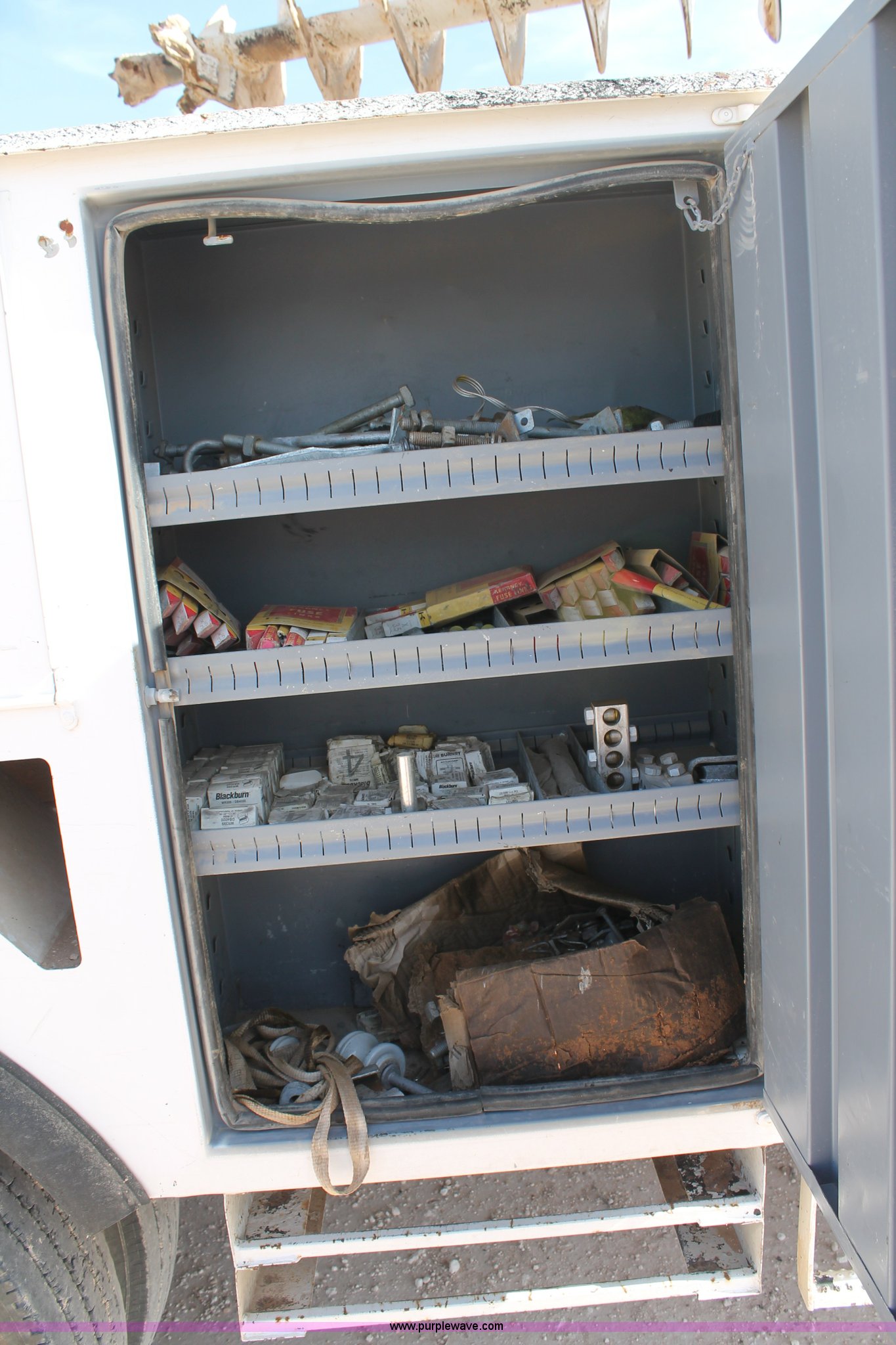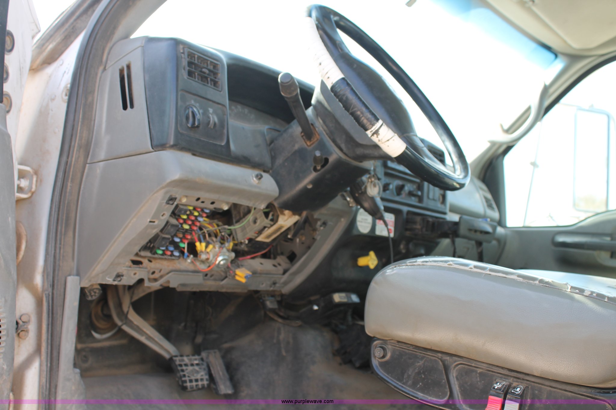 Purple Wave is selling a used Bucket Truck in Texas. This item is a 2005 Ford F750 Super Duty bucket truck with the following: 95,072 miles on odometer, Caterpillar 3126 7.2L L6 turbo diesel engine, Automatic transmission, AC and heat, AM/FM, Spring suspension seat, PTO, 2005 Terex Commander 4045 boom, 46.3' maximum lift height, Serial 2050426976, (4) outriggers, Boom rotation, Material handler, Pole guide, Telescopic boom, Shelving, Utility rack, Work lights, Single fuel tank, Backup alarm, Trailer wiring, Spring suspension, Air brakes, 493" wheelbase, 11R22.5 tires, GVWR 33,000 lbs