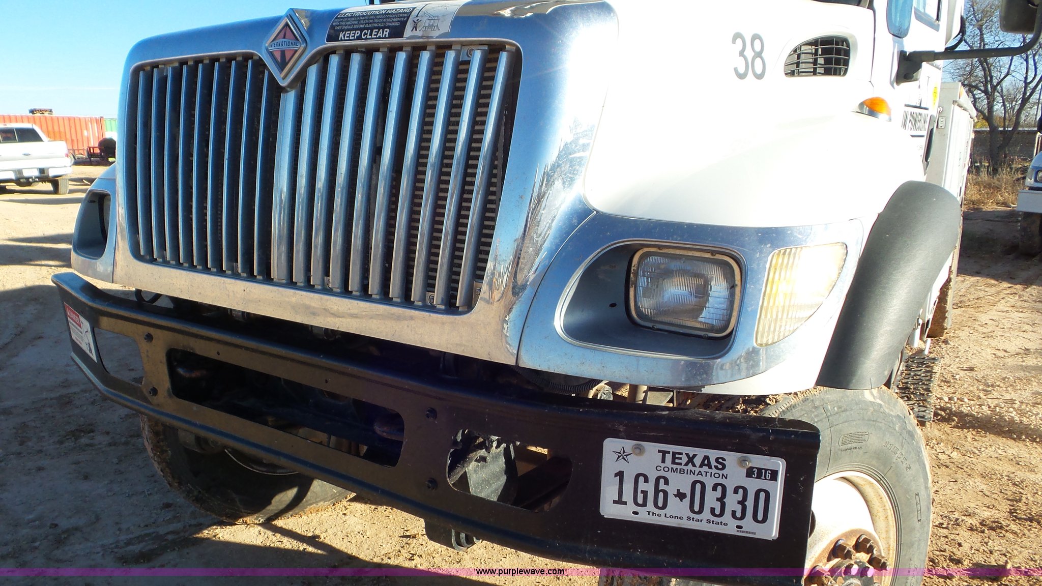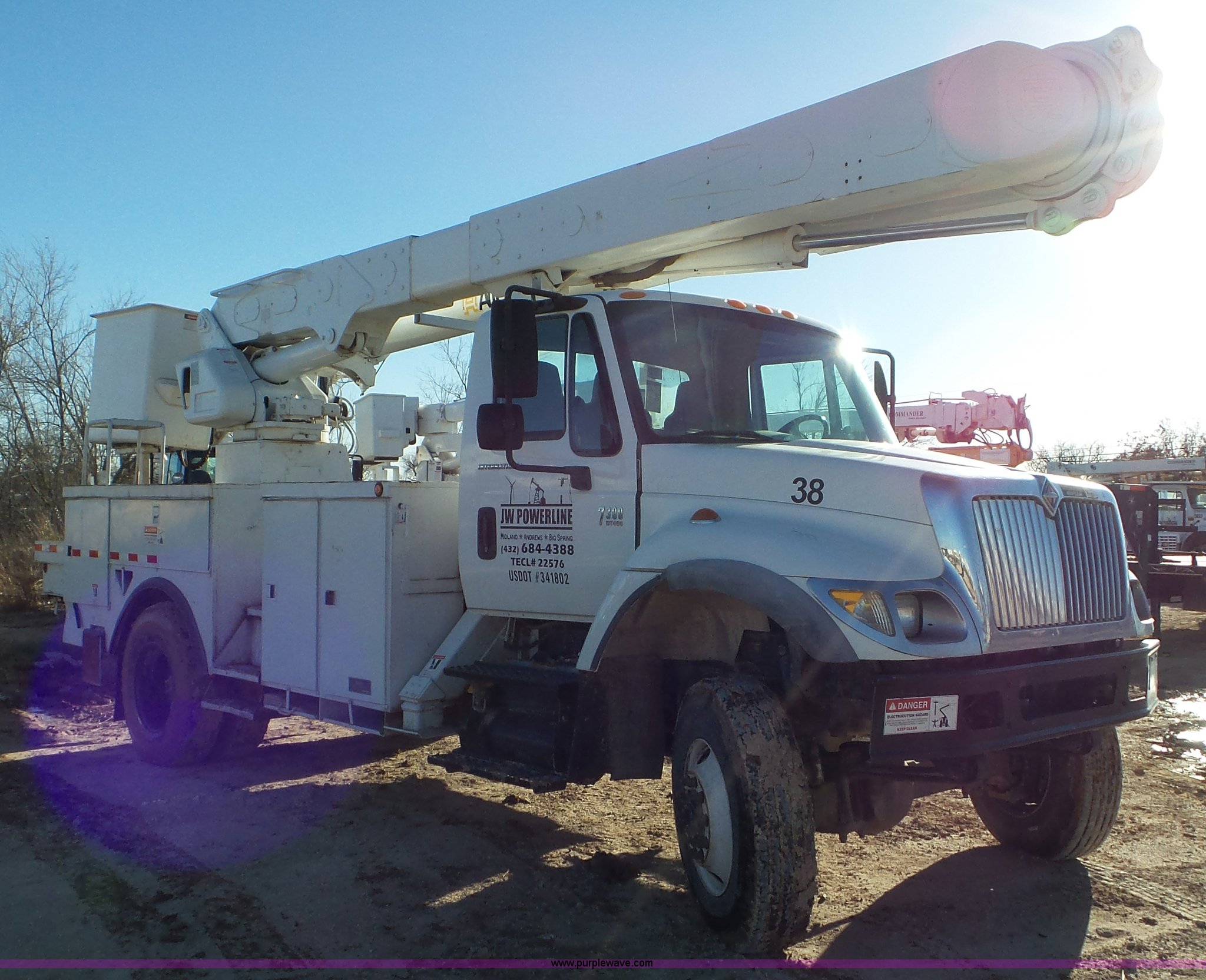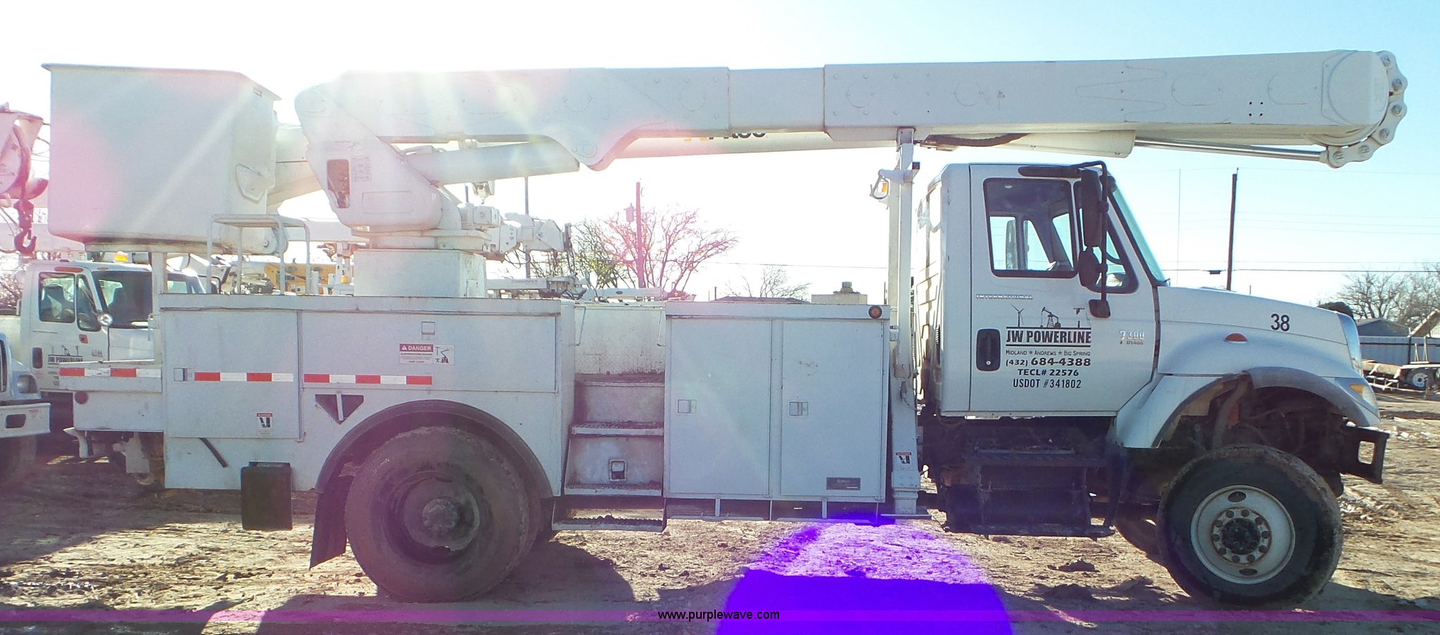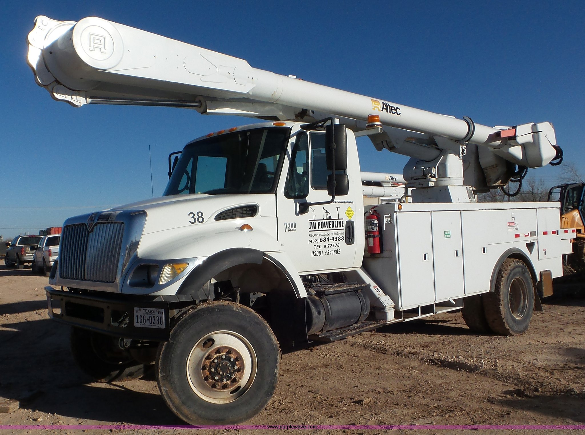 Purple Wave is selling a used Bucket Truck in Texas. This item is a 2004 International 7300 bucket truck with the following: 86,821 miles on odometer, 13,580 hours on meter, International DT466 7.6L L6 turbo diesel engine, Automatic transmission, Four wheel drive, AC and heat, Cruise, AM/FM/cassette, Cruise, Beacon light, PTO, Altec 16'L service bed, Shelving, 2003 Altec AM55 boom, Serial 0503DM0237, 600 lbs maximum lift capacity, 55' maximum lift height, Ground and platform controls, Boom rotation, Man basket, Articulating insulated boom, (4) outriggers, Single fuel tank, 195" wheelbase, Pintle hitch, Spring suspension, Air brakes, Trailer wiring, 11R22.5 front tires, 12R22.5 rear tires, Unit# 38