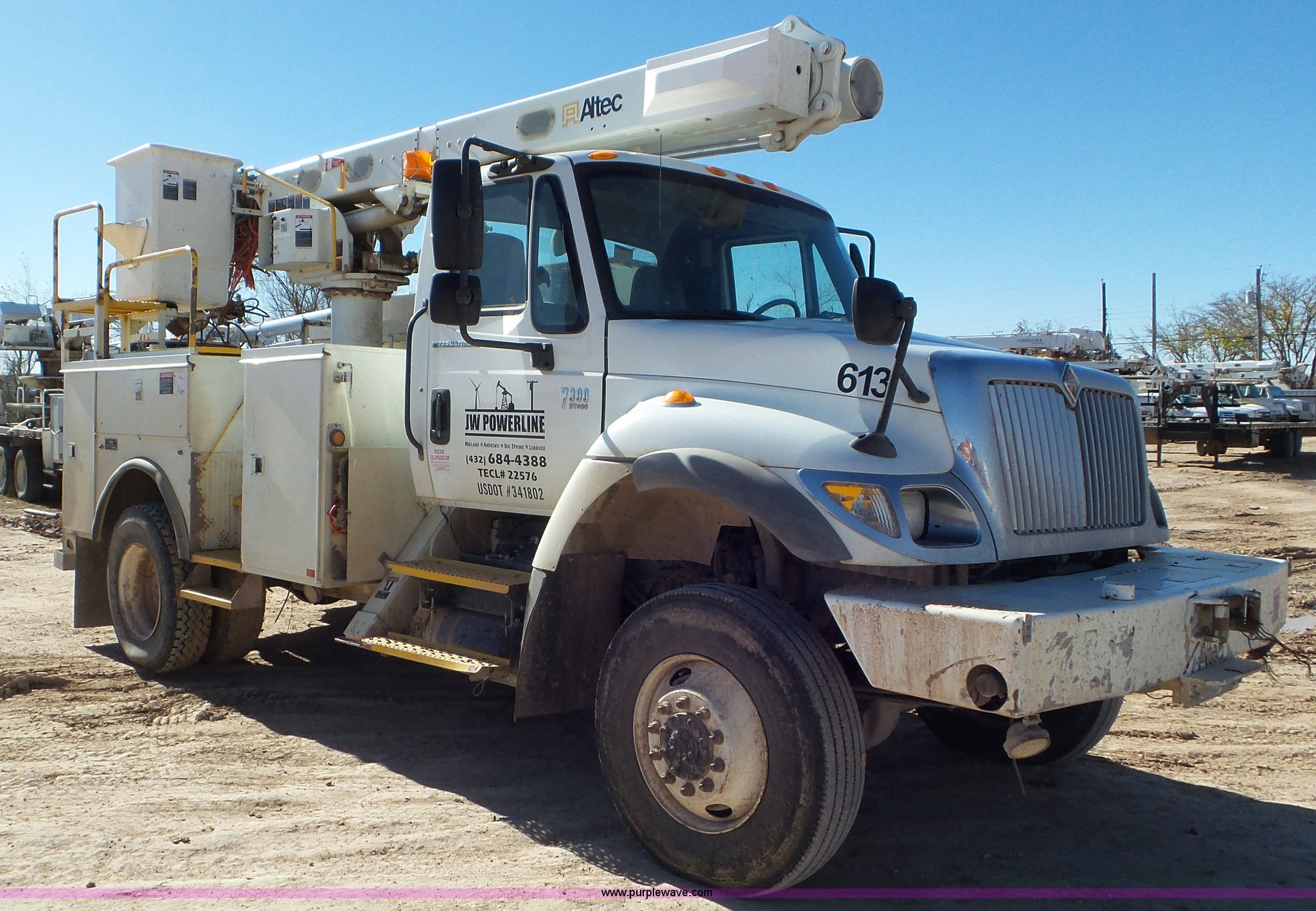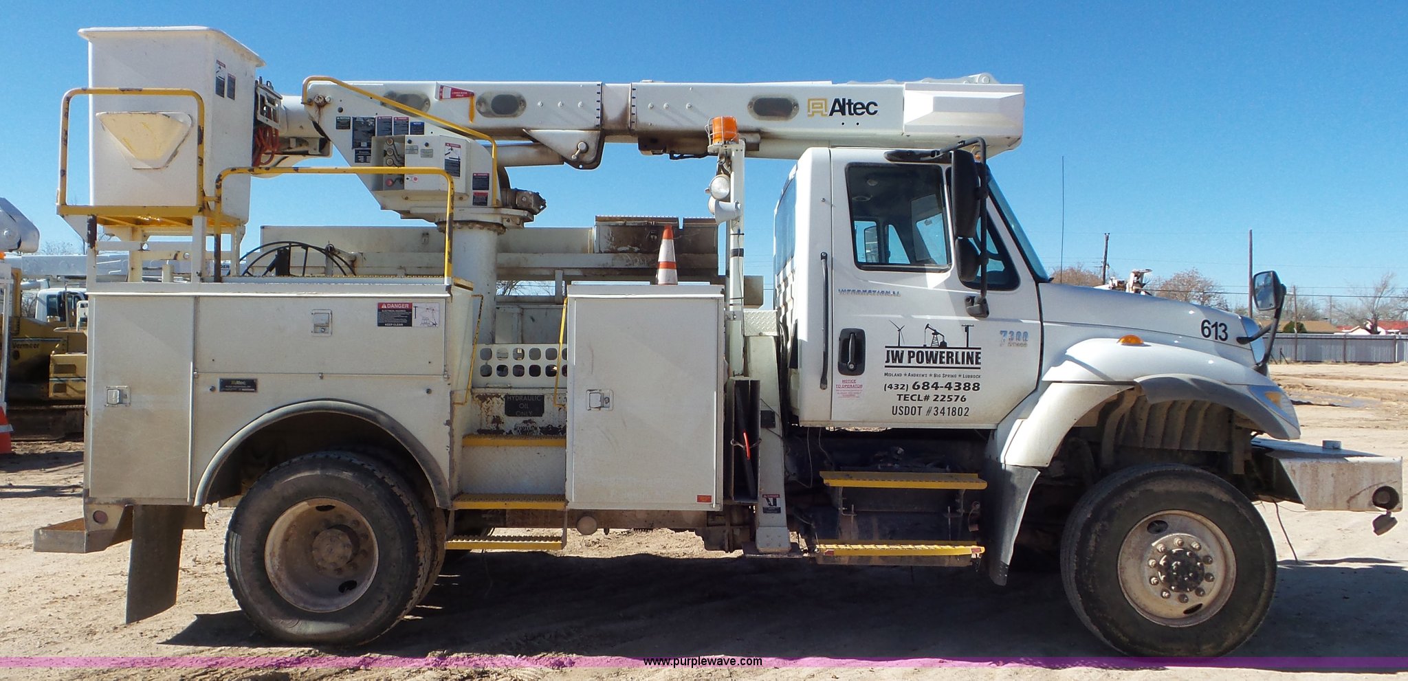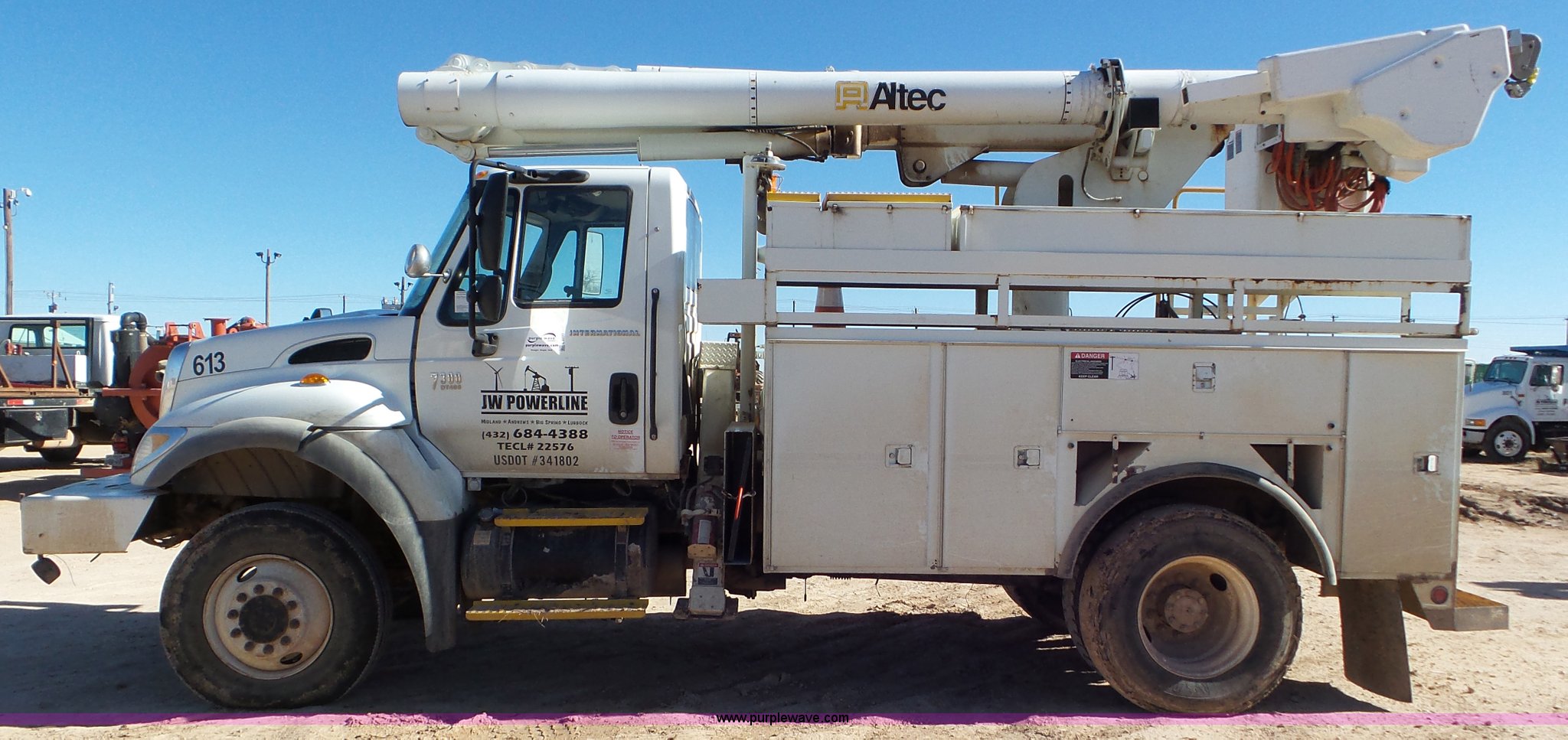 Purple Wave is selling a used Bucket Truck in Texas. This item is a 2007 International 7300 bucket truck with the following: 104,561 miles on odometer, 8,654 hours on meter, International DT466 7.6L L6 turbo diesel engine, Allison automatic transmission, Four wheel drive, AC and heat, Cruise, AM/FM, Air suspension seat, Beacon light, PTO, Altec 11'L service bed, Shelving, Compartment lights, Serial 2761262481206, 2006 Altec L37MR boom, Serial 0906CW1008, 400 lbs maximum lift capacity, 37' maximum lift height, Ground and platform controls, Boom rotation, Articulating insulated boom, Man basket, (4) outriggers, Front Winch, Single exhaust stack, Single fuel tank, Pintle hitch, Spring suspension, Air brakes, Engine brake, 174" wheelbase, 11R22.5 tires, Unit# 613