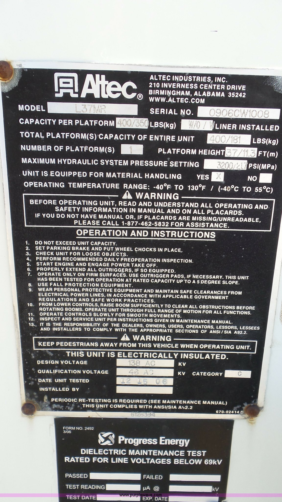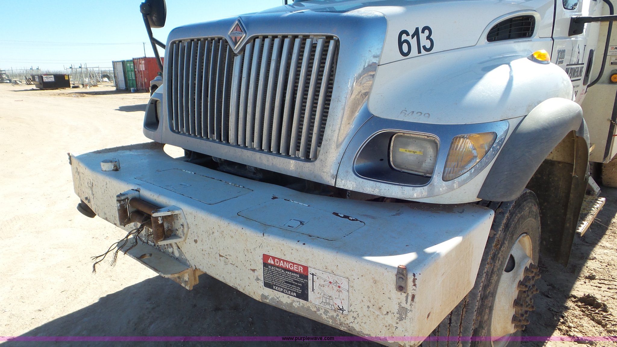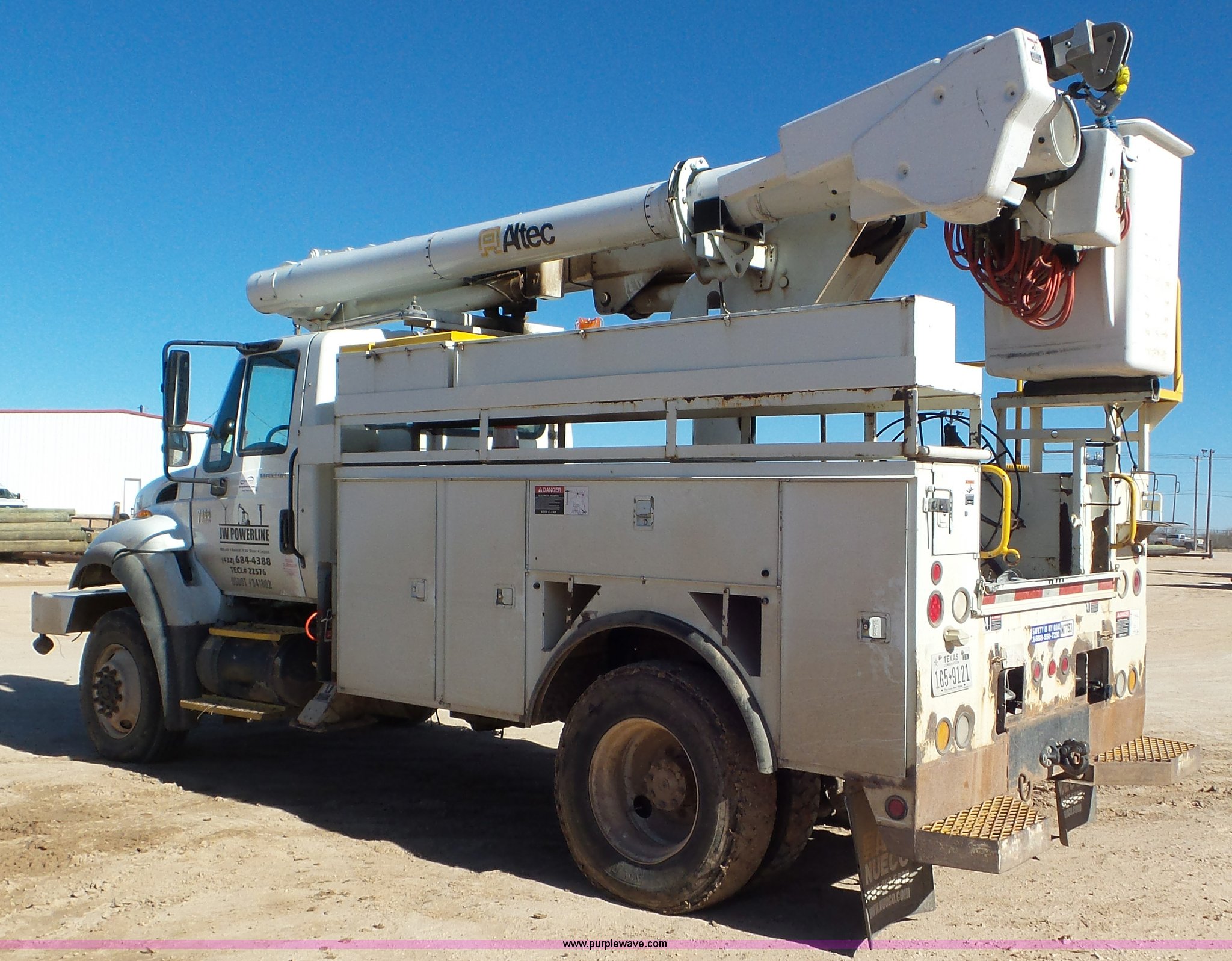 Purple Wave is selling a used Bucket Truck in Texas. This item is a 2007 International 7300 bucket truck with the following: 104,561 miles on odometer, 8,654 hours on meter, International DT466 7.6L L6 turbo diesel engine, Allison automatic transmission, Four wheel drive, AC and heat, Cruise, AM/FM, Air suspension seat, Beacon light, PTO, Altec 11'L service bed, Shelving, Compartment lights, Serial 2761262481206, 2006 Altec L37MR boom, Serial 0906CW1008, 400 lbs maximum lift capacity, 37' maximum lift height, Ground and platform controls, Boom rotation, Articulating insulated boom, Man basket, (4) outriggers, Front Winch, Single exhaust stack, Single fuel tank, Pintle hitch, Spring suspension, Air brakes, Engine brake, 174" wheelbase, 11R22.5 tires, Unit# 613