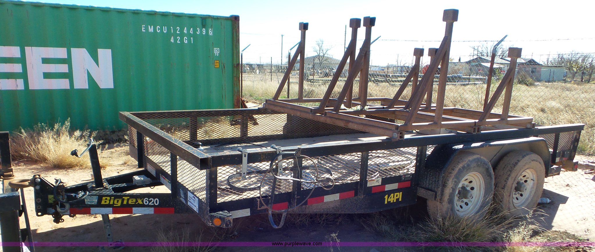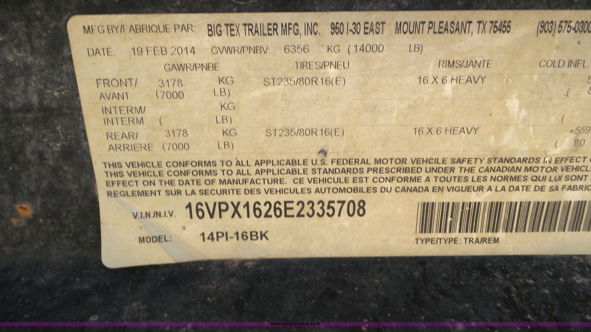 Purple Wave is selling a used Car or Utility Trailer in Texas. This item is a 2014 Big Tex 14PL-16BK utility trailer with the following: 16'L x 89"W wood deck, 6'L ramps, Spool mounts, Pintle hitch, Spring suspension, Electric brakes, Tandem axle, 235/80R16 tires, GVWR 14,000 lbs, Unit# 620