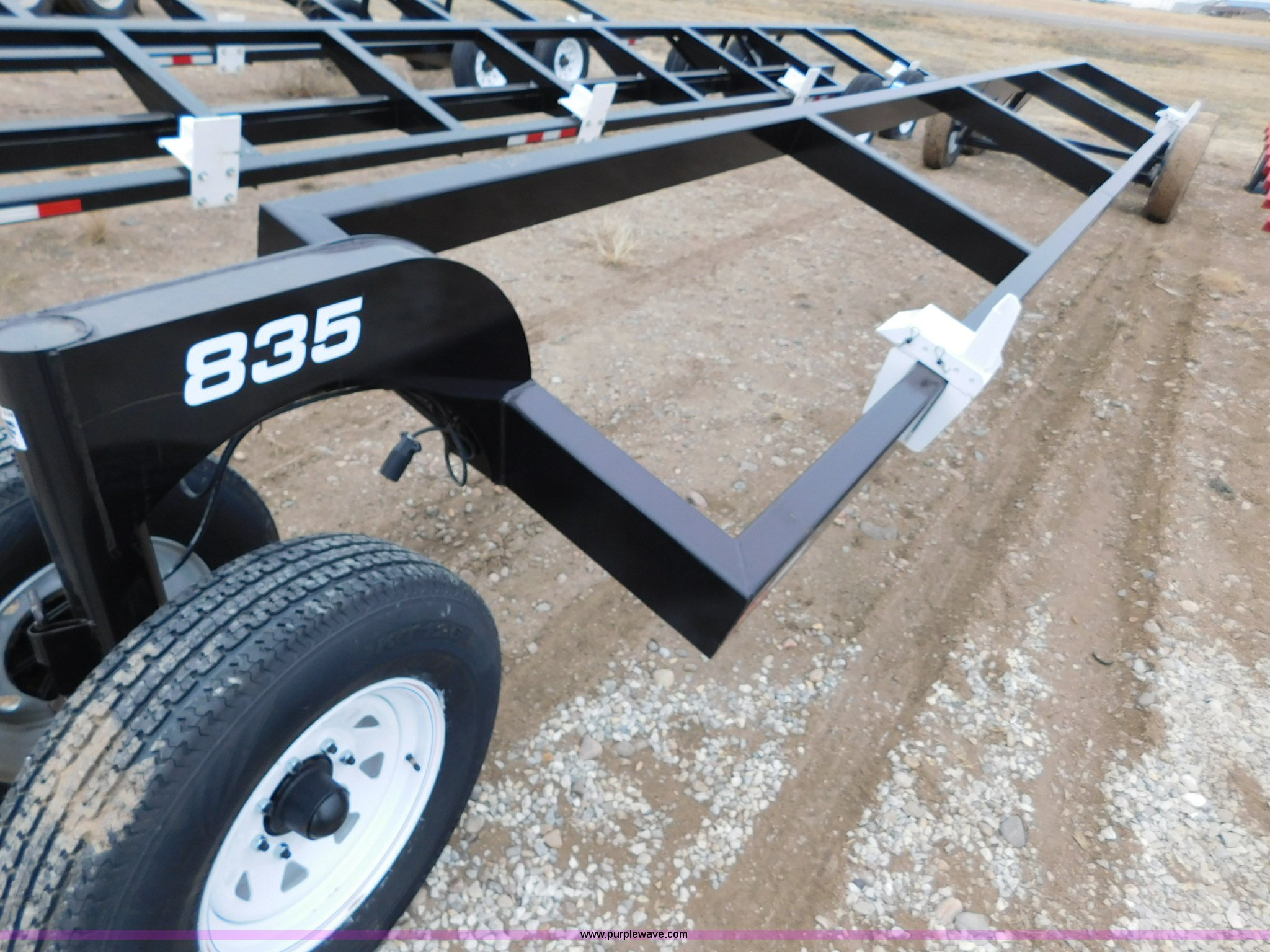 Industries America 835 header trailer. 44'L x 54"W overall, 35'L head capacity, 4" x 8" frame stand, Lights, Brakes, Torsion axles, Keter ST235/80R16 tires. Sublette Machinery. 1807 Reinland Dr. Sublette, KS 67877