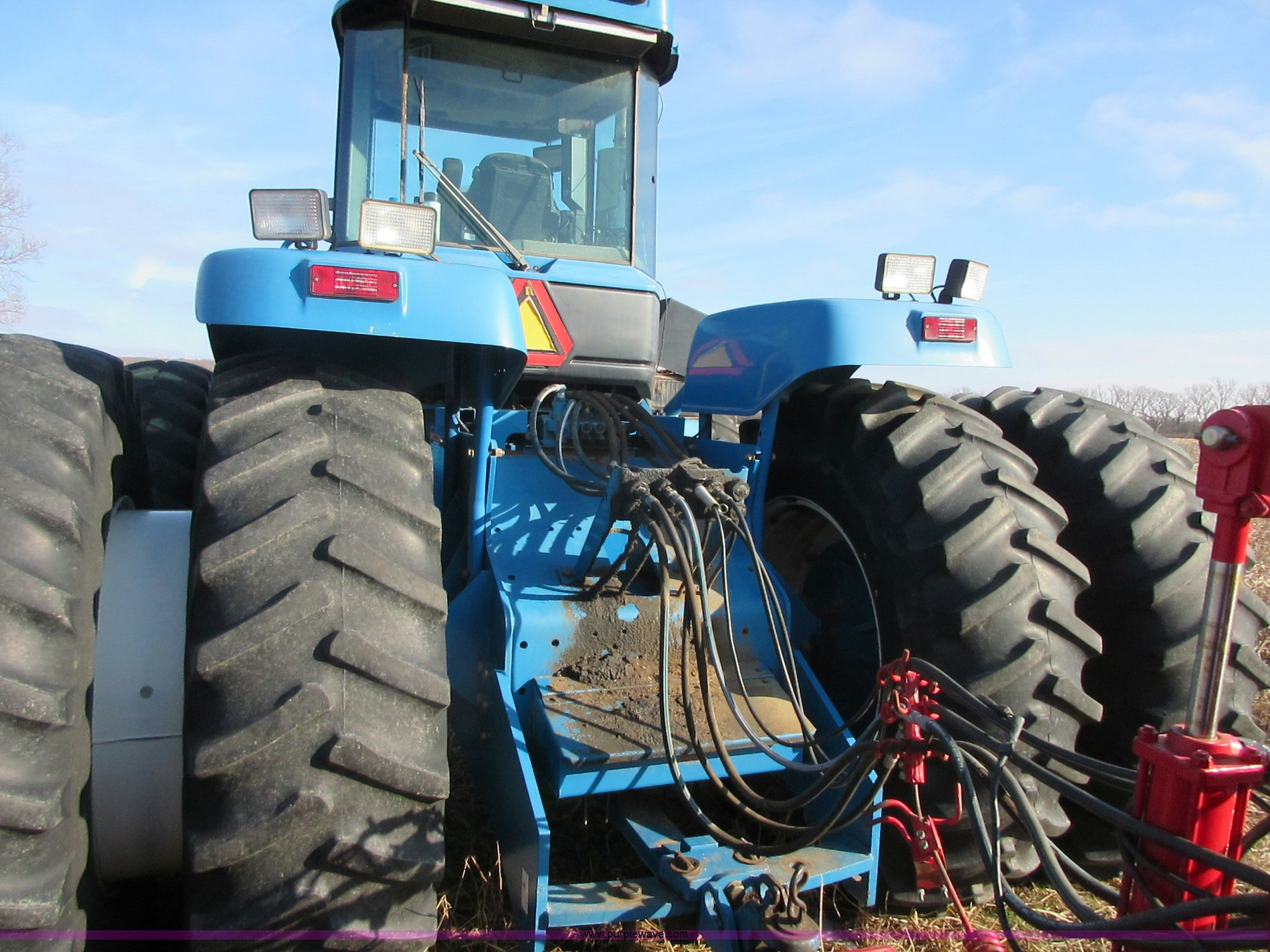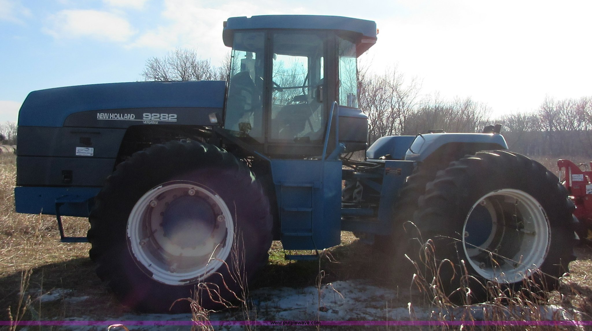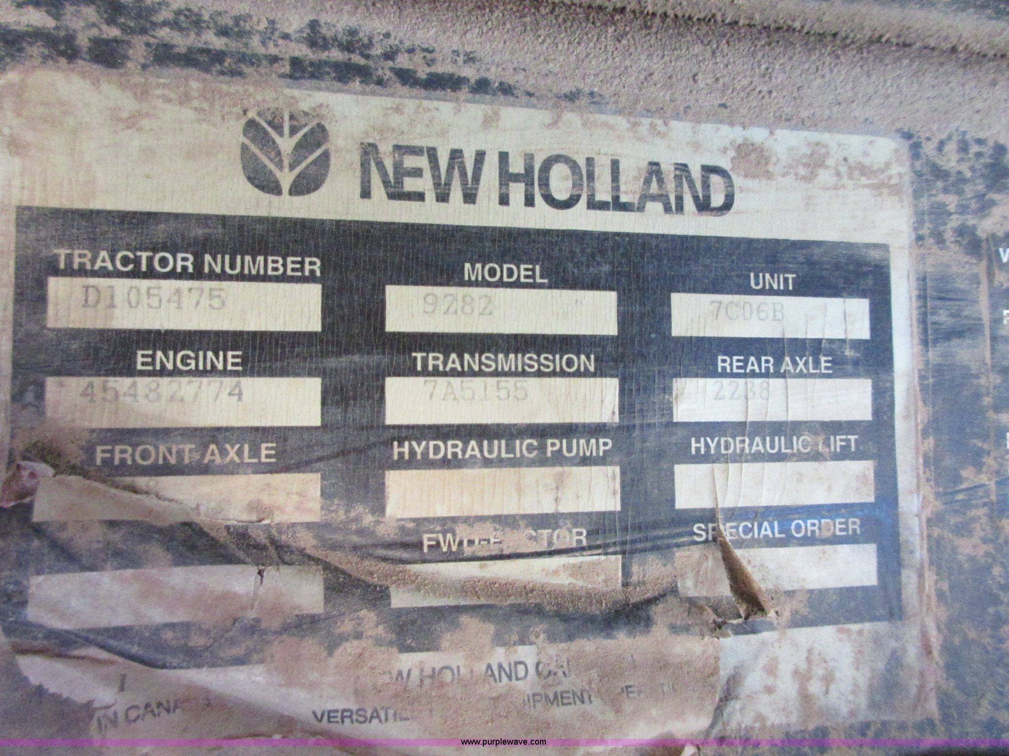 Purple Wave is selling a used Articulated 4-Wheel Drive Tractor in Oklahoma. This item is a 1997 New Holland 9282 4WD tractor with the following: 5,822 hours on meter, Cummins 8.3L six cylinder turbo diesel engine, Serial 45482774, Quadra-Sync transmission, 12F-4R gears, AC and heat, Tilt steering wheel, AM/FM/CD, Suspension seat, Ether start, Seven pin outlet, (4) rear hydraulic remote sets, Firestone 20.8R38 dual tires, Serial D105475