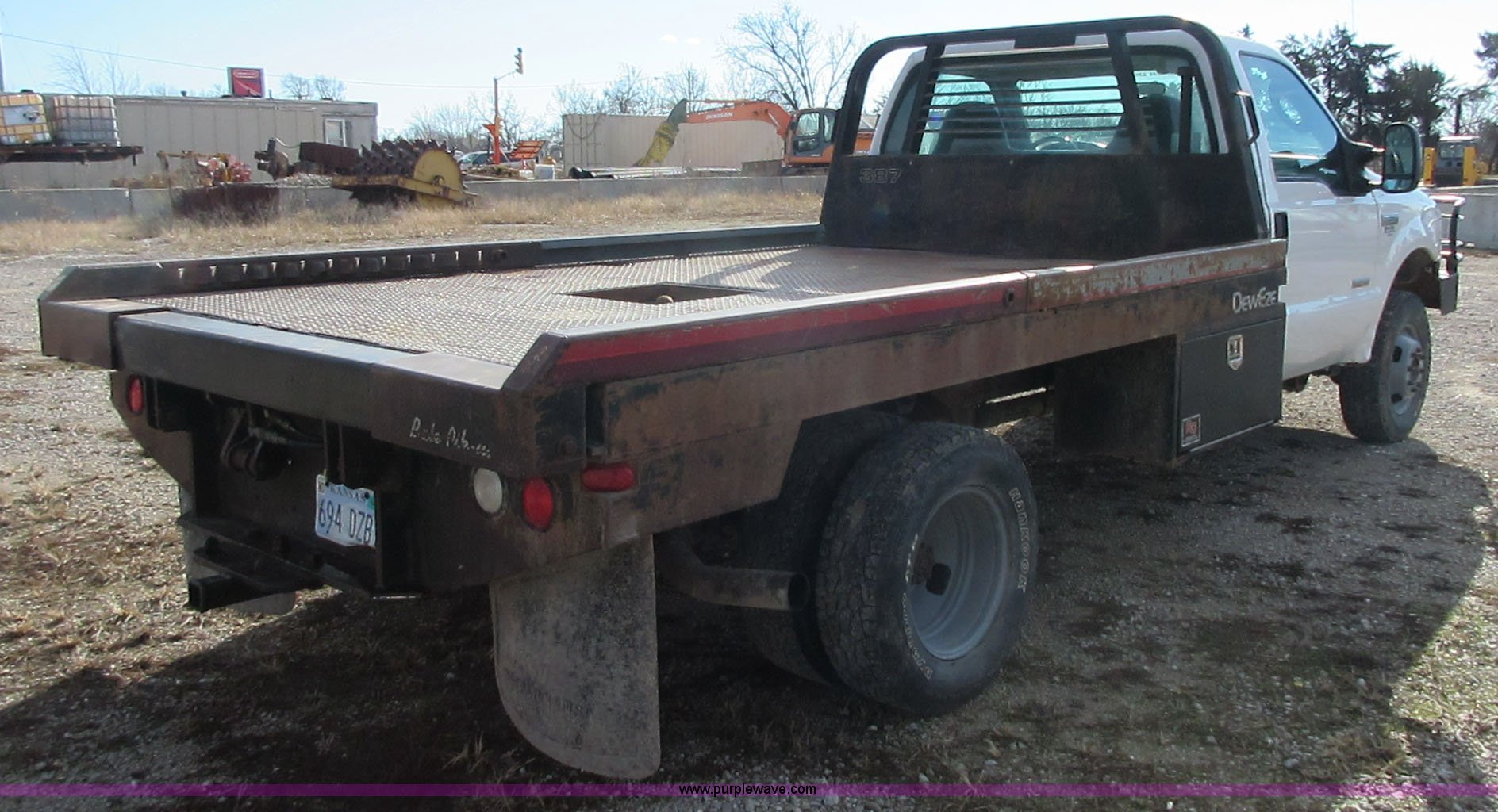 2007 Ford F350 Super Duty XL flatbed pickup truck. 250,804 miles on odometer, 6.0L V8 OHV 32V turbo diesel engine, Automatic transmission, Four wheel drive, AC and heat, Tilt, Cruise, AM/FM/CD, Manual windows and locks, Vinyl interior, Deweze 387 hydraulic bale bed Bale arms, Toolbox, Receiver hitch, Gooseneck hitch, Trailer wiring, LT245/75R17 tires, ABS light is on, Check engine light is on, Unit# 3-314. 1FDWF37P97EB14245. Beachner Land and Cattle LLC.. St. Paul, KS 66771