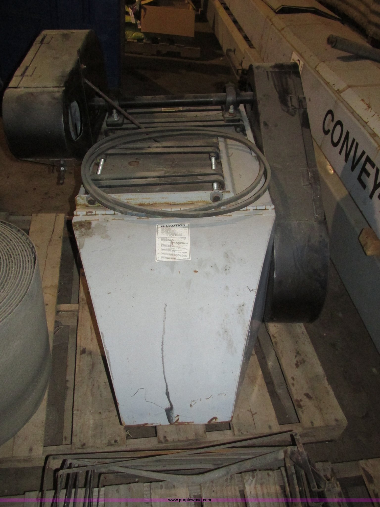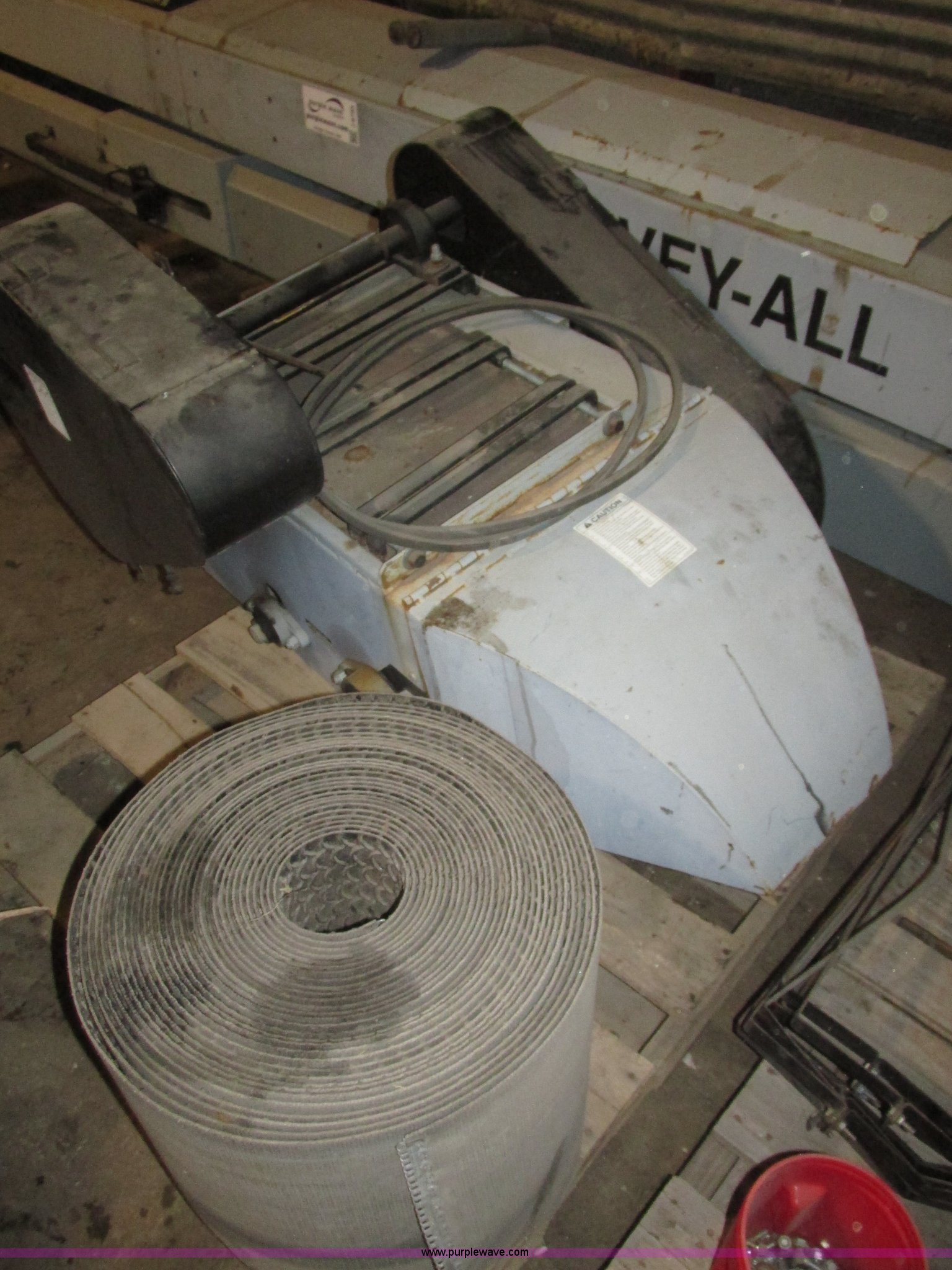 Purple Wave is selling a used Conveyor in Iowa. This item is a Convey All under bin open bed roller conveyor with the following: (3) trough sections, 10'L, 12'L, 20'L, 36"L x 34"W hopper, (10) metal bands, 16"W I.D. trough top, 10"W I.D. lower, (5) support stands, Adjustable feet, 16"W rubber belt, Baldor 5 HP electric motor, 230/460V, Three phase, Motor will be disconnected prior to auction, Operators manual