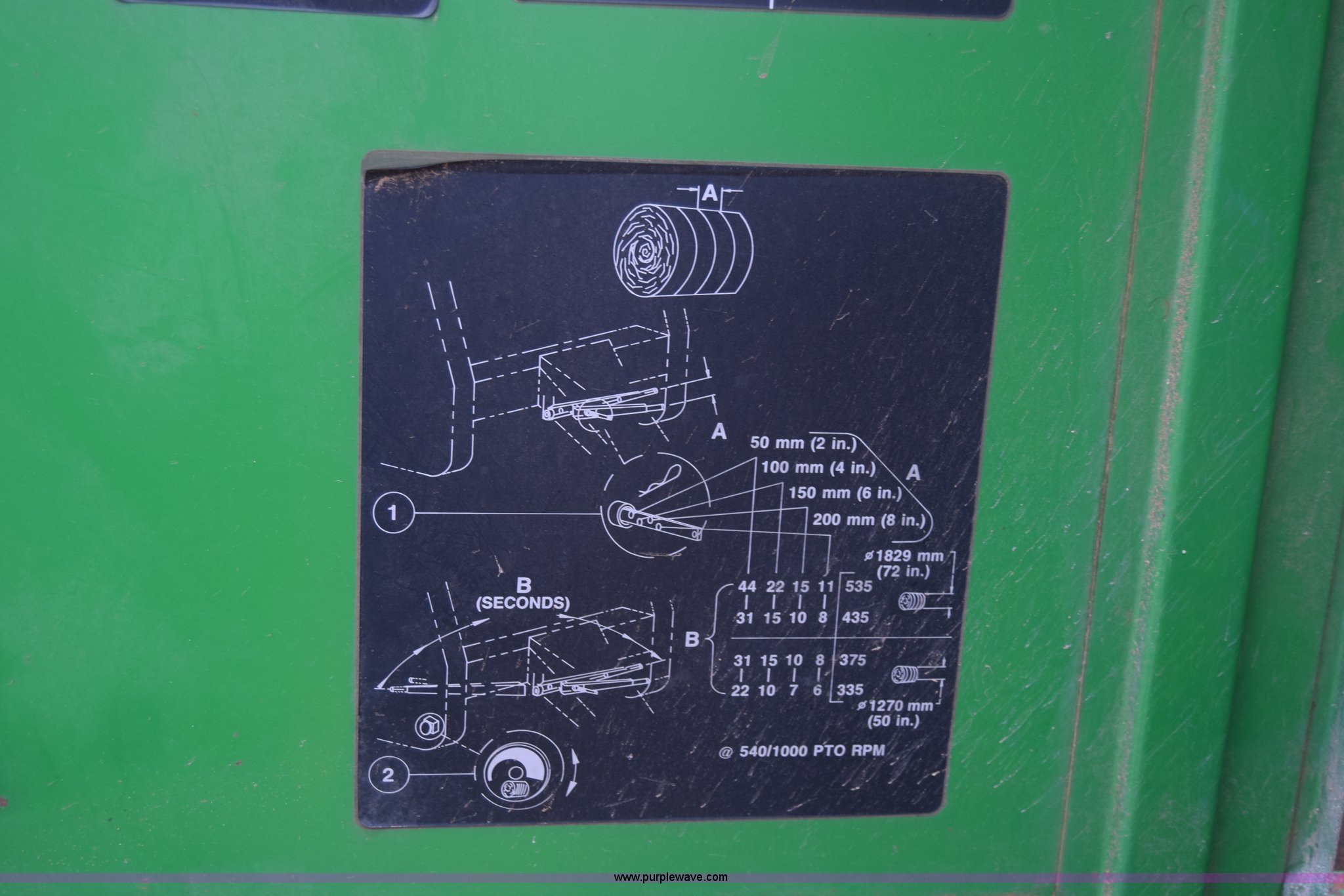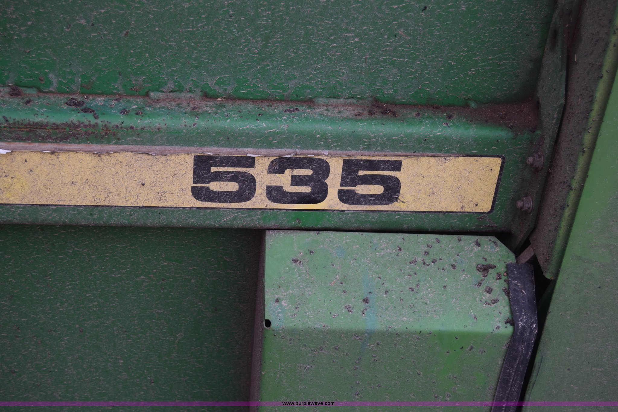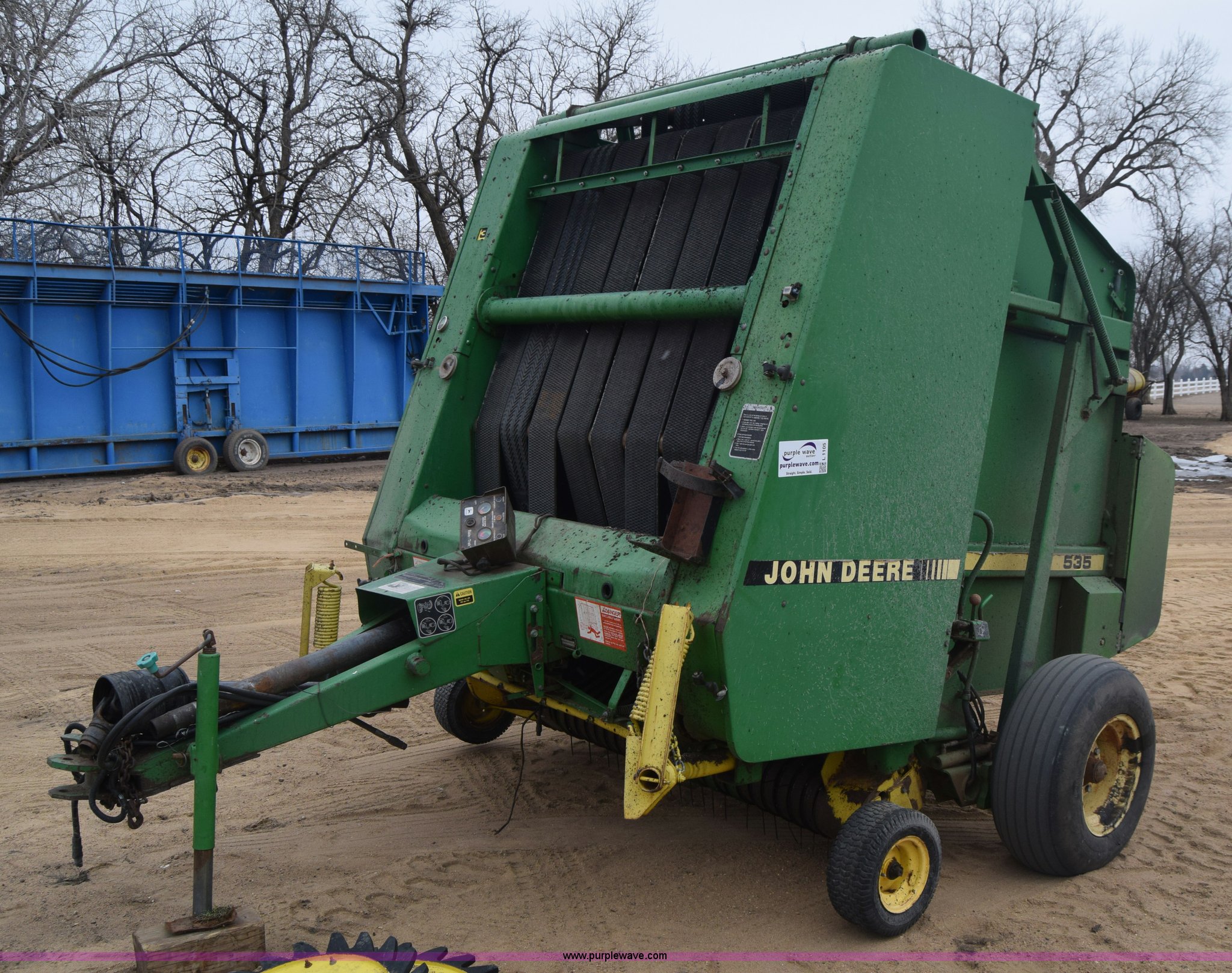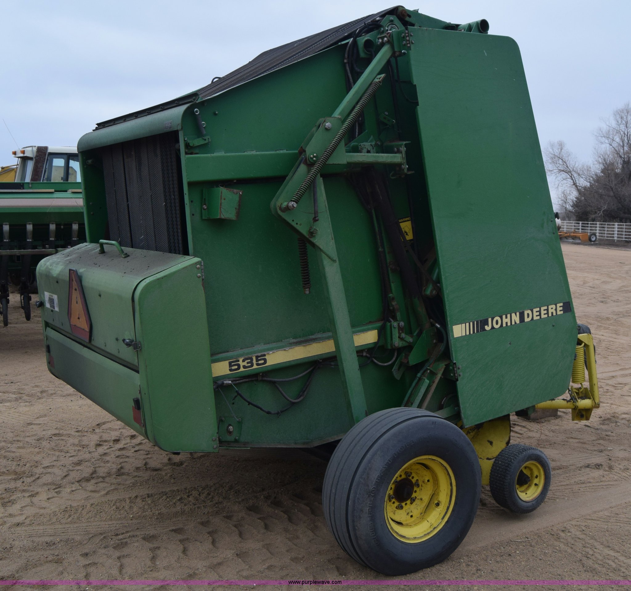 Purple Wave is selling a used Round Baler in Kansas. This item is a John Deere 535 round baler with the following: 5'W bale capacity, 5'W pickup, Monitor, Twine tie or net wrap, Gauge wheels, Gathering wheels, 1000 PTO, Pin hitch, Tongue jack, 11L-15 tires
